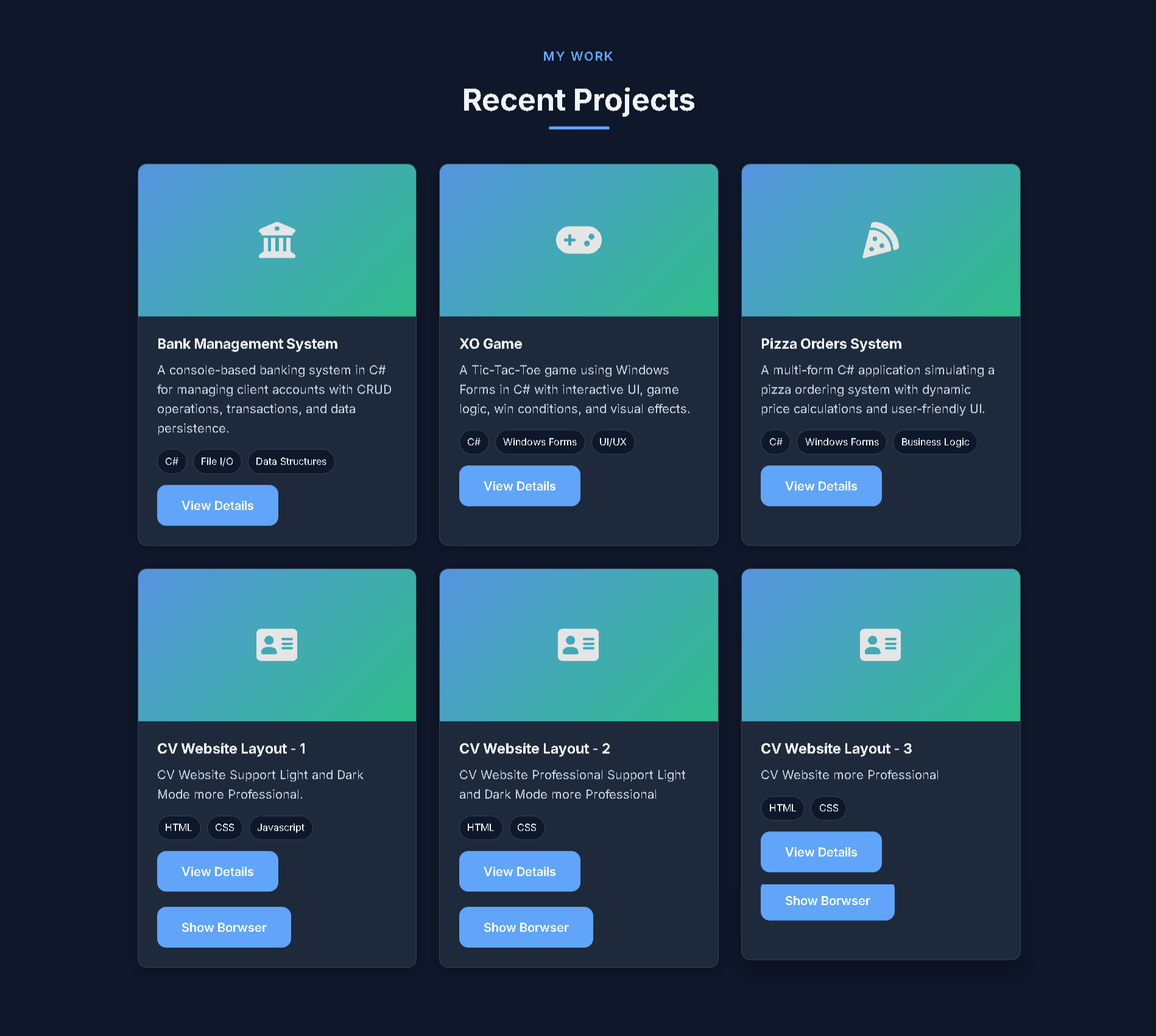 سأقوم بتصميم وتطوير موقع Portfolio متكامل باستخدام HTML وCSS وJavaScript بتصميم حديث وسلس، يعكس شخصيتك المهنية ويجعل الزائر يثق بخدماتك من أول نظرة.