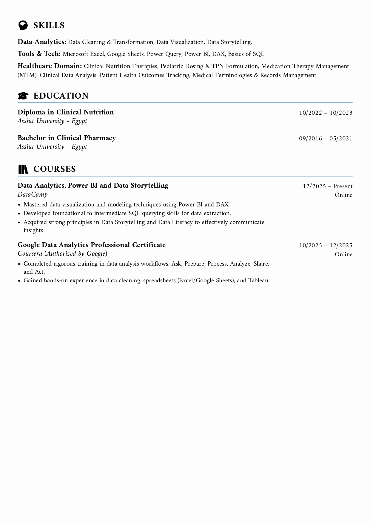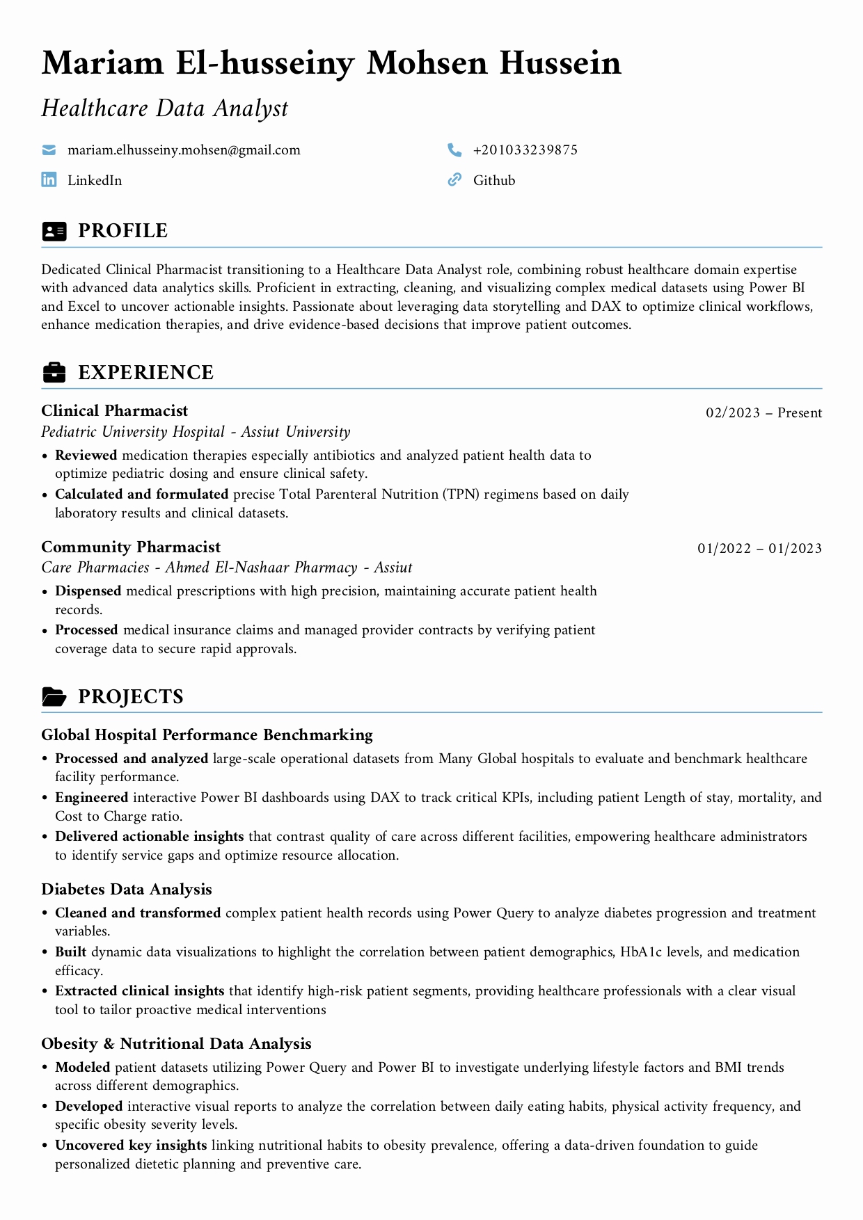 أنا مريم، محللة بيانات بخلفية قوية في المجال الطبي، و أقدم خدمات احترافية تشمل تحليل البيانات بإستخدام Power BI، إعداد السيرة الذاتية المتوافقة مع ATS، إدخال البيانات، العمل على Excel وWord و تحويل الملفات بين PDF وWord وExcel. أحرص دائمًا على الدقة، جودة التنسيق و الالتزام بالتسليم.