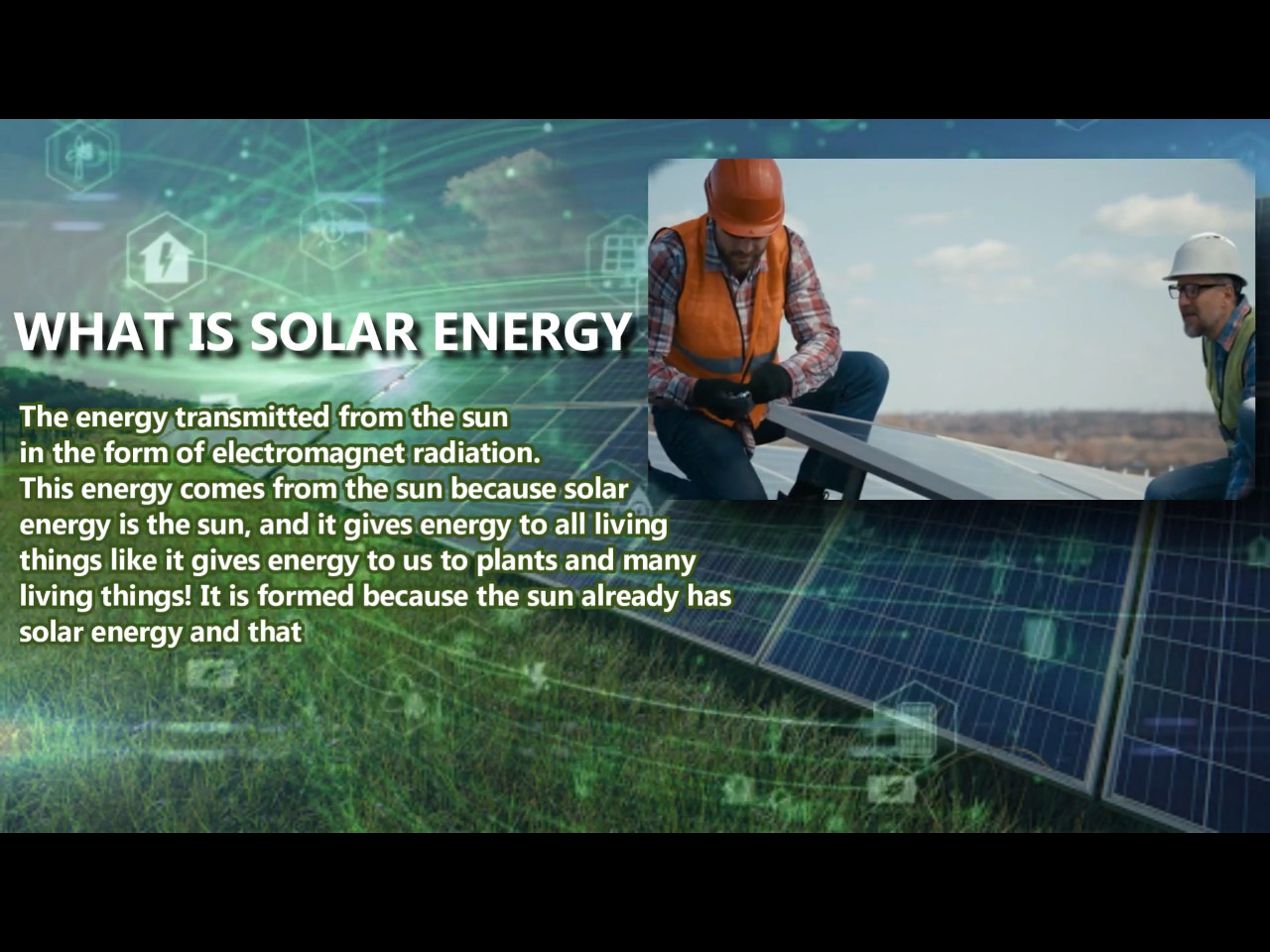 مونتاج مشروع تخرج لطلاب الكلية التقنية بالدمام عن الطاقة الشمسية تم استلام ملف باور بوينت من الطلاب وكذلك فيديو يوضح تنفيذ المشروع وبفضل الله تم توفير التعليق وعمل مونتاج احترافي