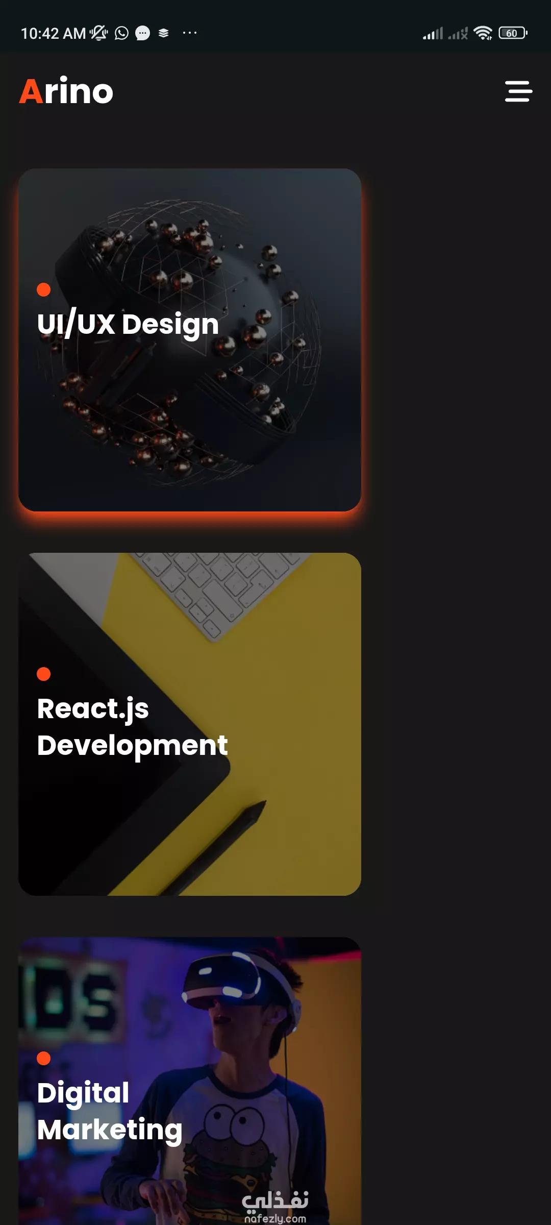 العصر الحديث هو عصر الألكترونيات واستنادا لذلك قمت بعمل موقع به بعض مجالات البرمجه والألكترونيات بالتوضيح هذا الموقع يقدم خدمات الكترونيه وتطوير مواقع وهكذا ومتوفر ايضا مقالات ومعلومات لتتطوير الذات مثل: UI/UX Design WP Development, Digital Marketing, React Development