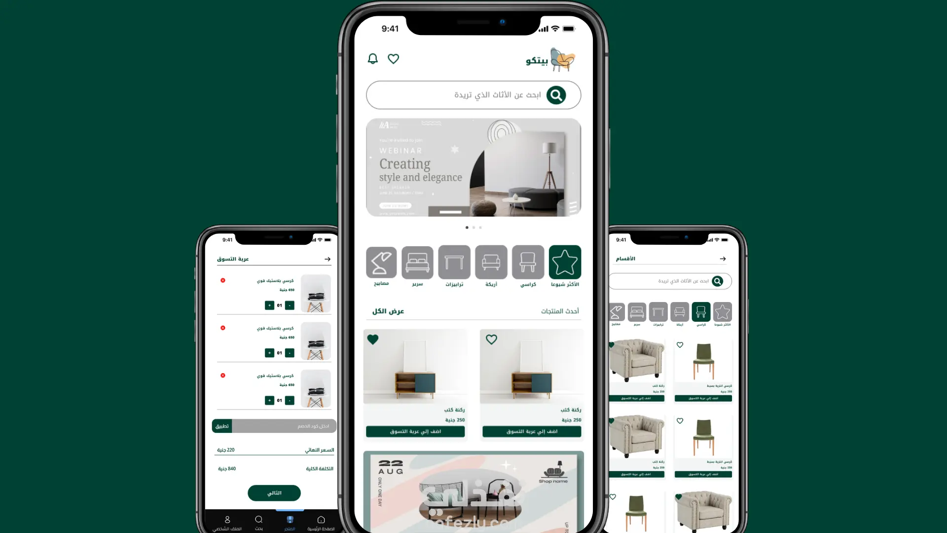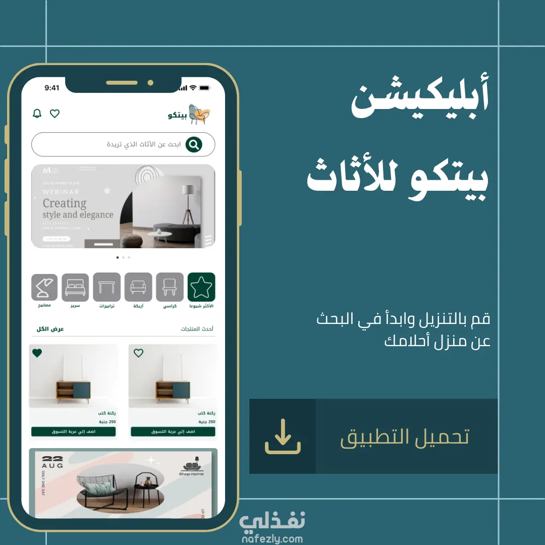يمكن للمستخدم البحث عن قطع الأثاث باستخدام كلمات مفتاحية أو من خلال تصفح الأقسام مثل: كنب، كراسي، طاولات، وغيرها.