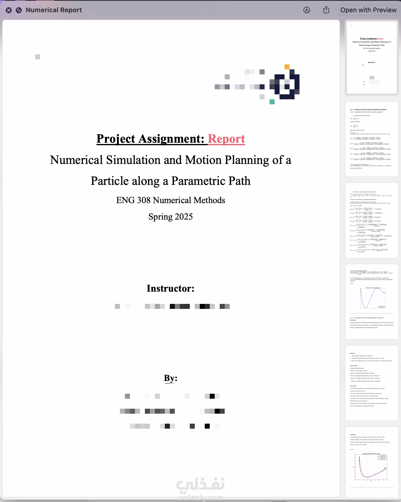 تم إنجاز هذا التقرير لمجموعة طلاب جامعيين لمادة علمية، حيث يتضمن هذا التقرير حسابات رياضية ورسومات بيانية أُنتِجت عن طريق برمجة أكواد في إحدى المنصات الرياضية للبرمجة (MATLAB). كان هذا التقرير شاملاً لجميع متطلباتهم مع الالتزام التام بالخطة الموضحة من معلم هذه المادة. وتم بحمد لله تسليمه في الوقت المتّفق عليه، ومع كامل التفاصيل المطلوبة.
