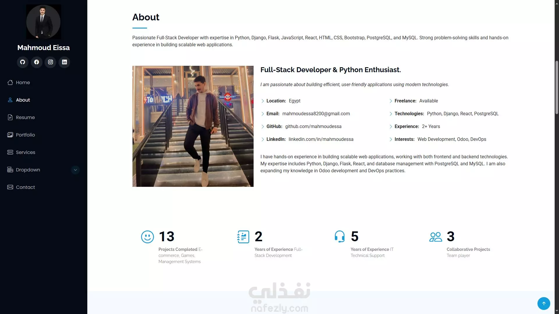 هذا البورتفوليو هو واجهة شخصية قمت ببنائها لعرض مهاراتي ومشاريعي وخبرتي كمطور Full-Stack. يتميز بتصميم عصري ومتجاوب يعمل بسلاسة على جميع الأجهزة، ويحتوي على أقسام واضحة ومنظمة لسهولة التصفح. 🧱 هيكل الأقسام 🏠 الرئيسية: مقدمة ترحيبية وتعريف سريع بيّ 👨💼 عنّي: تفاصيل حول خبرتي ومهاراتي التقنية 🛠️ المشاريع: عرض لأهم مشاريعي مع روابط العرض والـ GitHub 📊 المهارات: عرض مرئي لمهاراتي باستخدام مؤشرات أو أيقونات ✉️ التواصل: نموذج تواصل وروابط LinkedIn وGitHub 🛠️ التقنيات المستخدمة HTML5 CSS3 JavaScript Bootstrap 5 Font Awesome