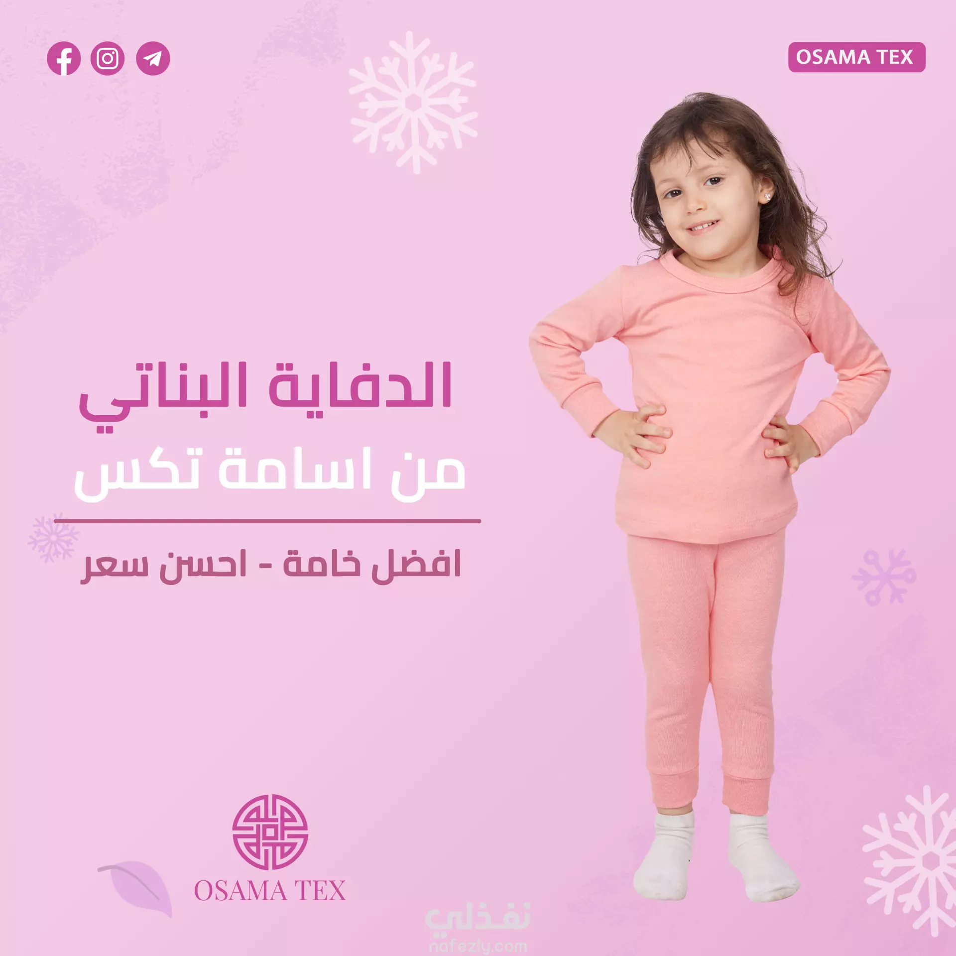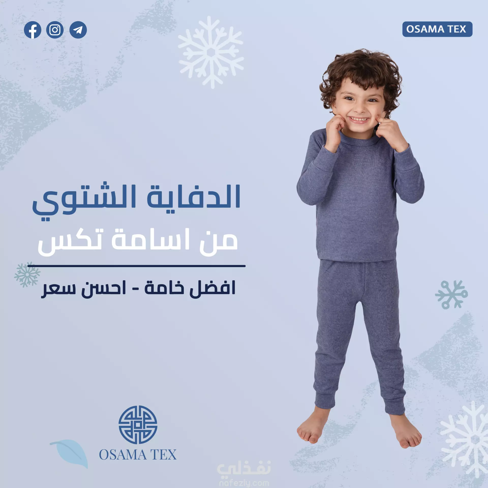 تفاصيل العمل: الأسلوب: تصميم عصري، مع التركيز على الألوان الباردة التي تناسب فصل الشتاء. المنتج المستهدف: ملابس شتوية للأطفال (بنطلونات وقمصان دافئة). المحتوى: كل تصميم يبرز نوع الملابس بشكل واضح مع العنوان "الدِفَايَة الشتوية من أسامة تكيس"، مع ذكر أن الأسعار "أفضل سعر". الألوان: استخدام ألوان باردة مثل الأزرق والوردي لتتناسب مع أجواء الشتاء. الشعار: شعار OSAMA TEX مدمج في التصميم مع روابط تواصل اجتماعي واضحة.