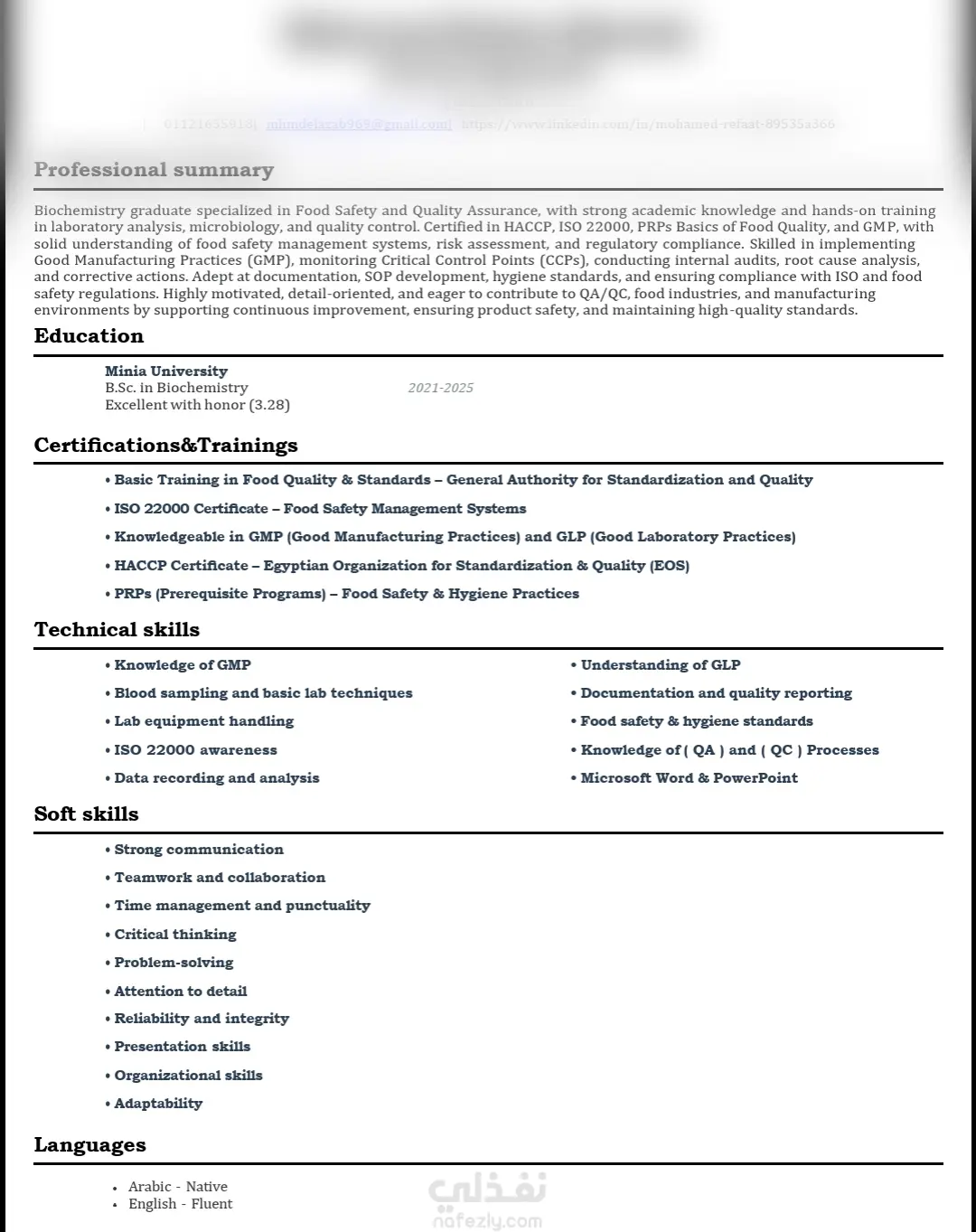 قمت بتصميم سيرة ذاتية احترافية لمتخصص جودة (QA/QC) حديث التخرج، ركزت فيها على إبراز المعرفة الأساسية في مفاهيم الجودة وضبط العمليات والتفتيش على المواد. تم اعتماد تصميم بسيط ومنسق يعكس الجدية والاحتراف، مع التركيز على المهارات المكتسبة من التدريب العملي والمشروعات الجامعية. أظهرت السيرة القدرة على تطبيق إجراءات الفحص، وإعداد التقارير، وفهم معايير الجودة في بيئات التصنيع والبناء، باستخدام كلمات مفتاحية مناسبة تساعد على تحسين ظهور السيرة الذاتية في أنظمة الـATS وجذب انتباه مسؤولي التوظيف للمرشحين الجدد.