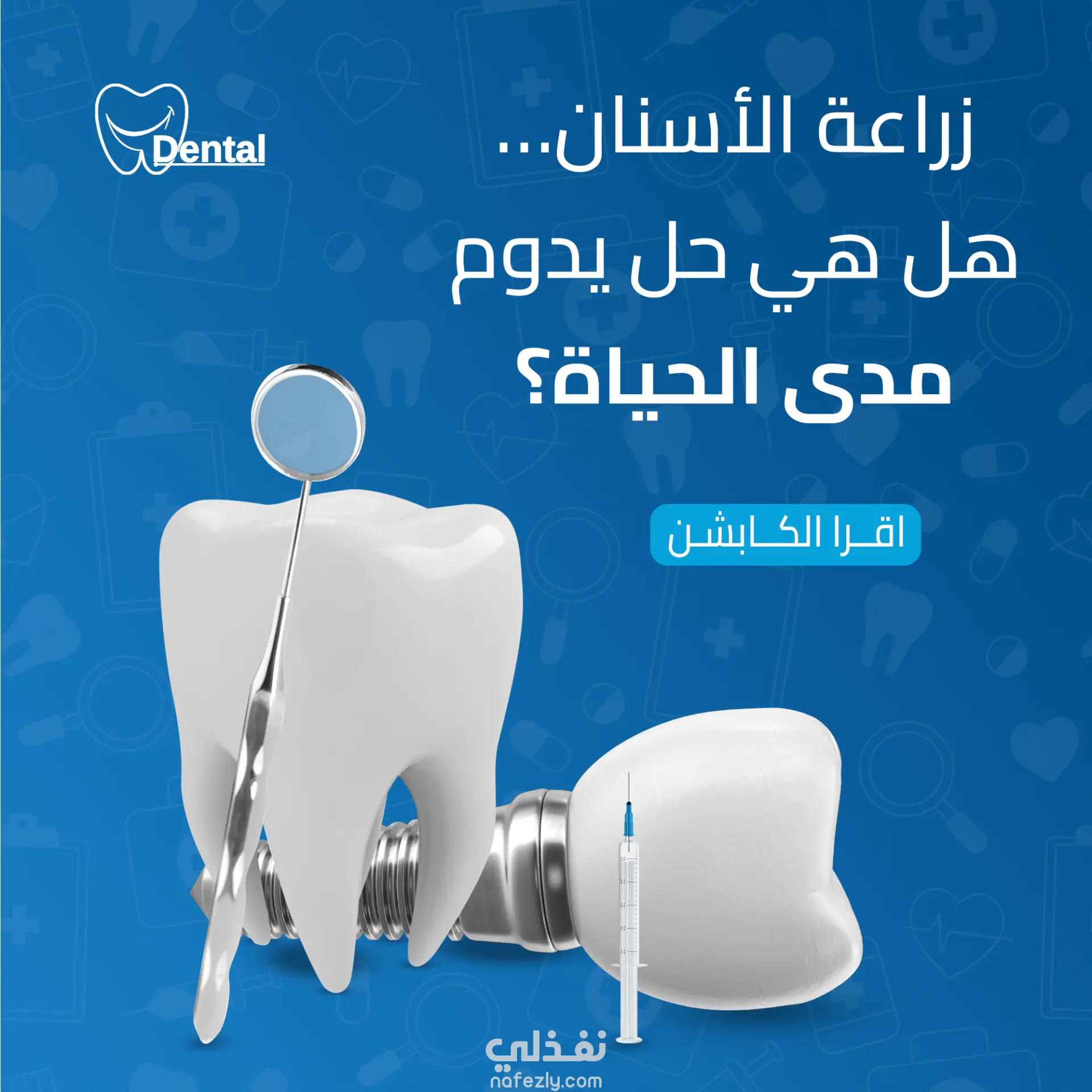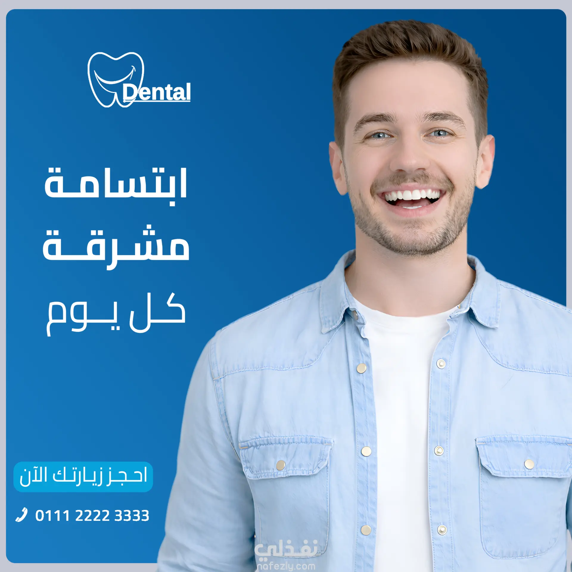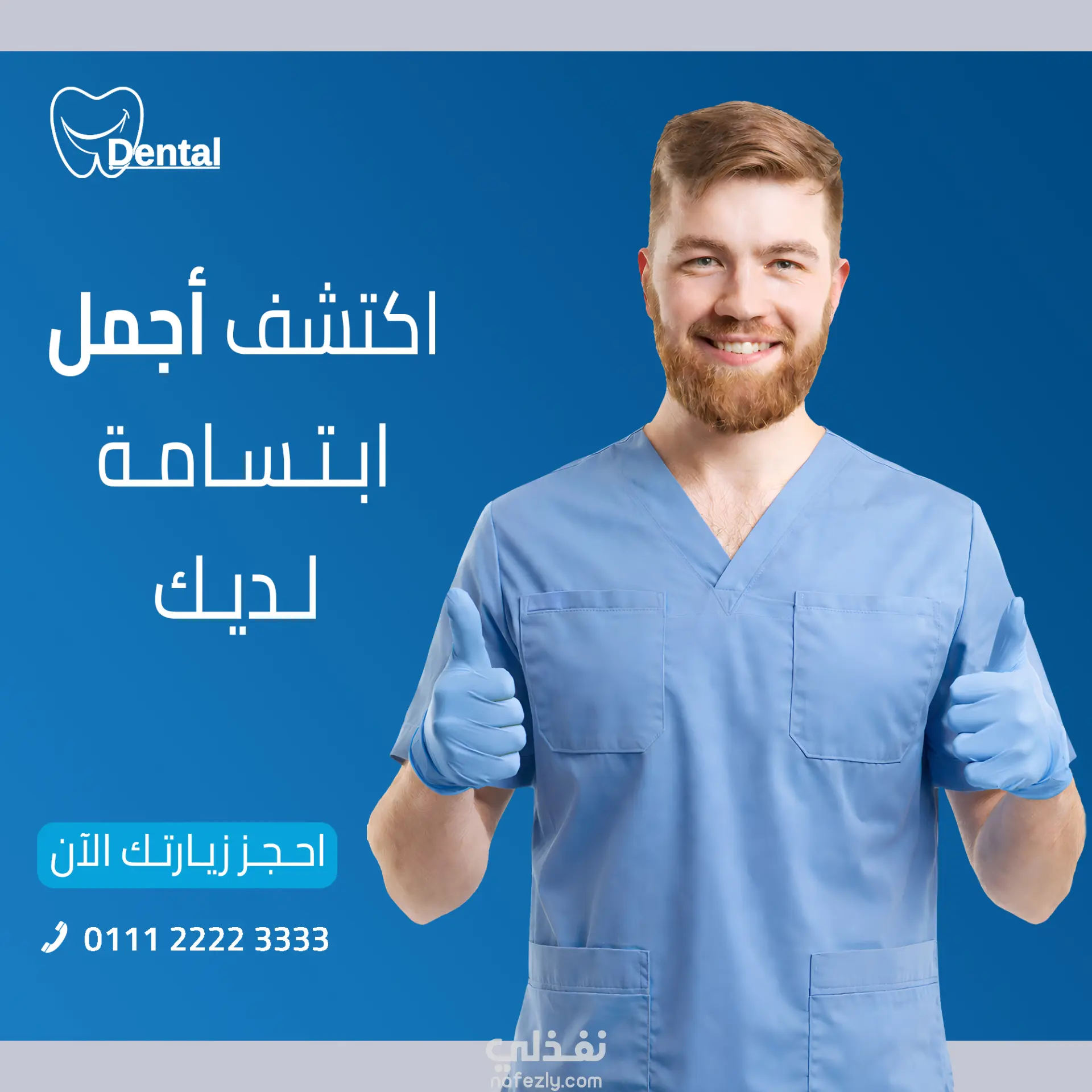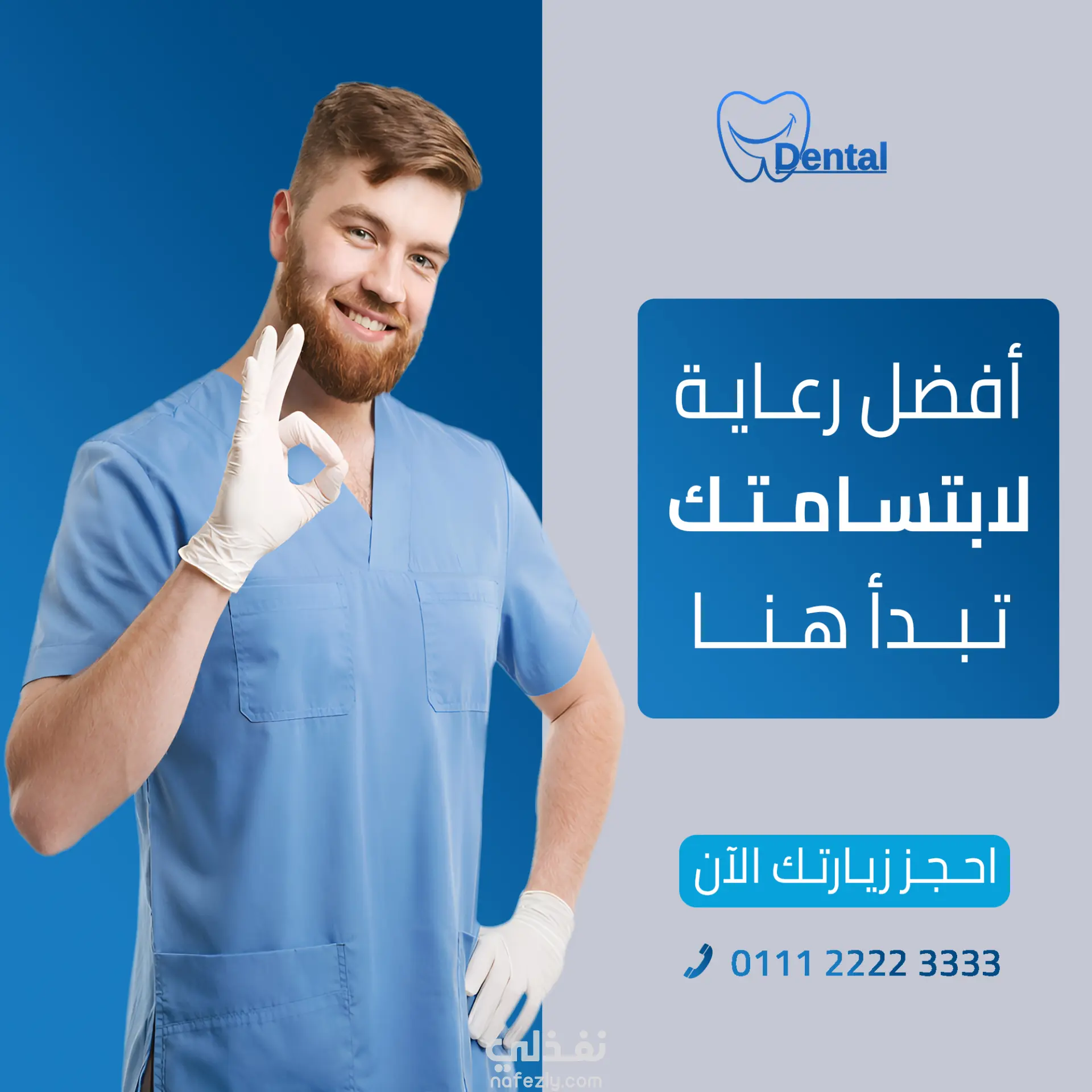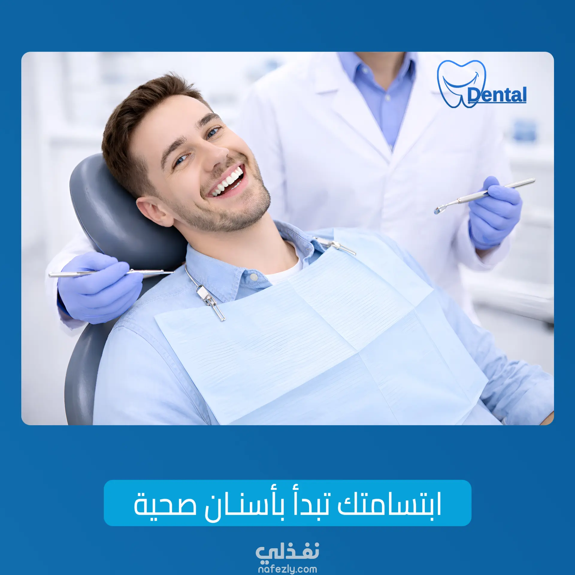 توزيع مدروس للعناصر البصرية مع وجود مساحات واضحة مخصصة للعنوان، العروض الترويجية، وشعارات العيادة.