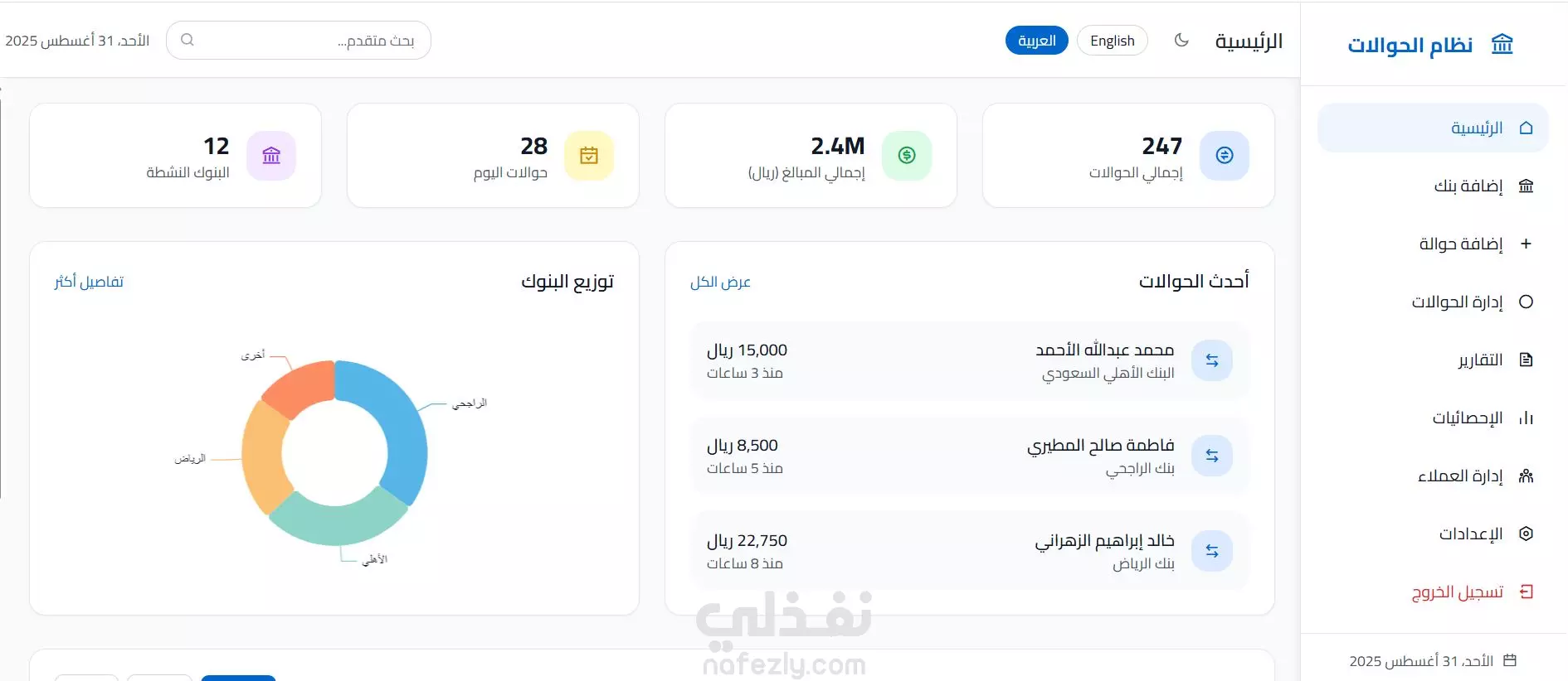 الإحصائيات: عرض إحصاءات لأكثر العملاء نشاطاً وأكثر البنوك استخداماً.
