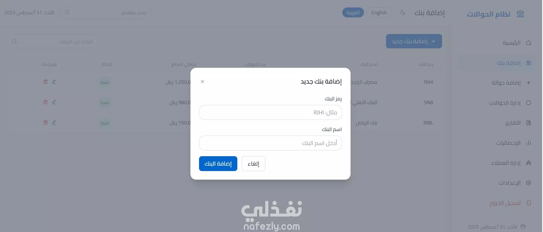 إدارة البنوك: إضافة وتعديل البنوك ومتابعة نشاطها.