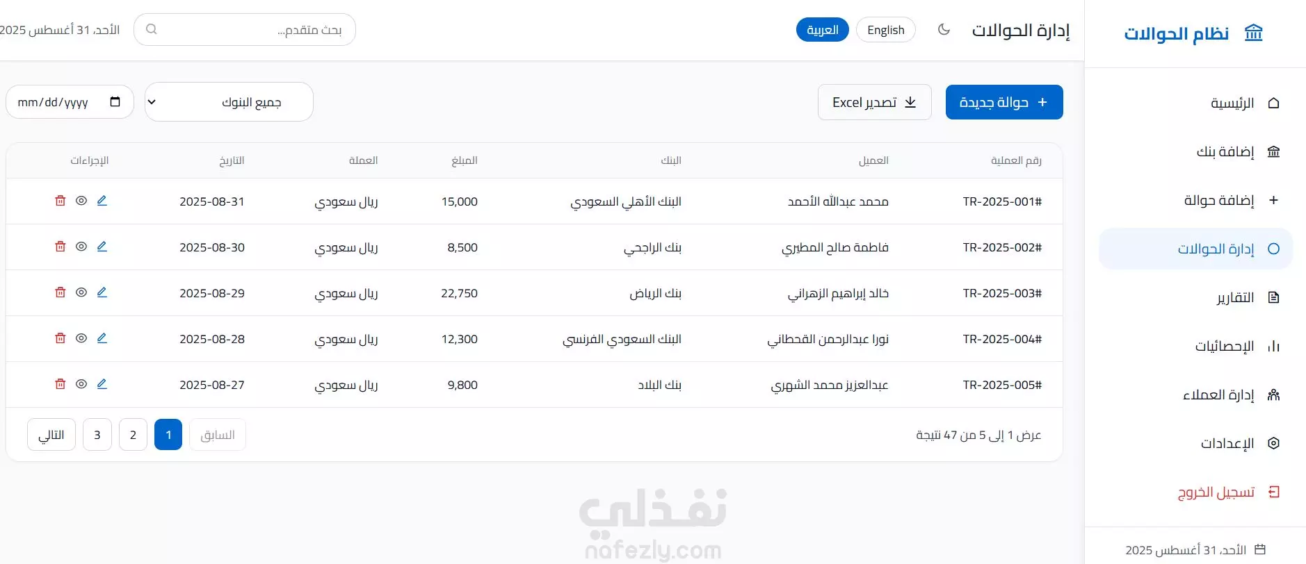 إدارة الحوالات: البحث، التصفية، التعديل، الحذف، والتصدير إلى Excel.