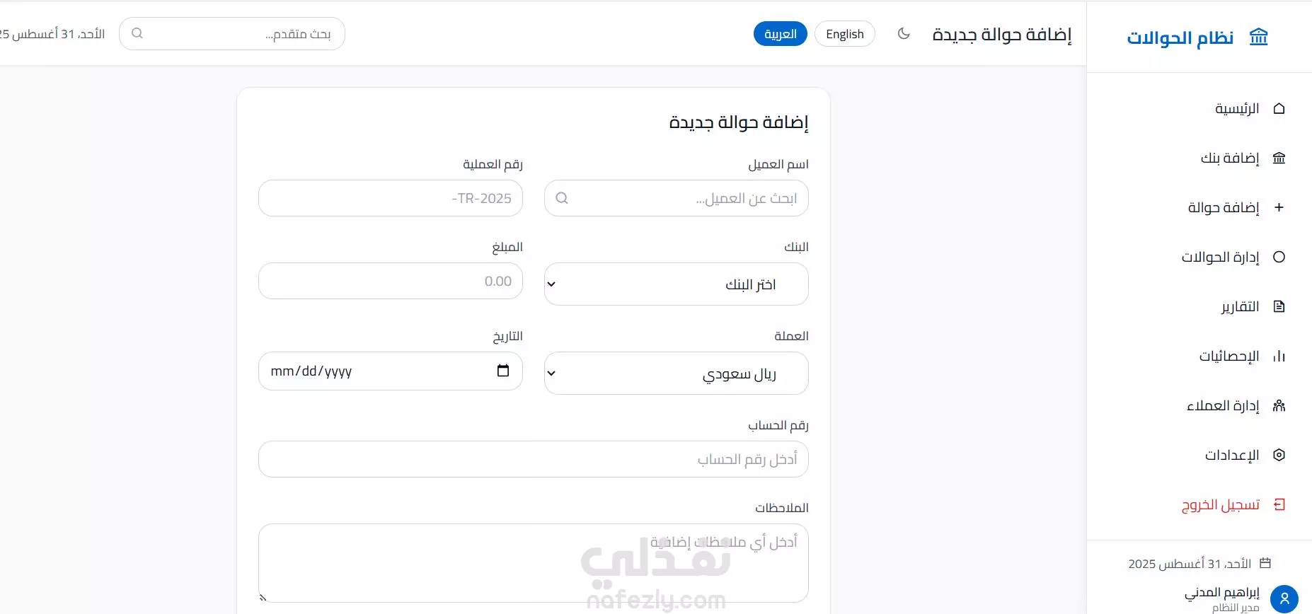 إضافة حوالة جديدة: تسجيل بيانات الحوالات (العميل، البنك، المبلغ، العملة، التاريخ…).