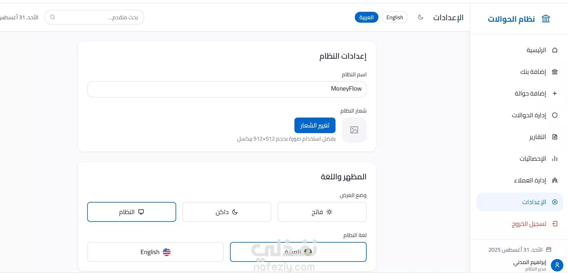 قمت بتطوير نظام MoneyFlow وهو تطبيق متكامل لإدارة الحوالات البنكية موجّه للشركات والمؤسسات المالية. يهدف النظام إلى تسهيل تسجيل الحوالات، متابعة العمليات البنكية، واستخراج التقارير والإحصائيات، مع واجهة عربية سهلة الاستخدام تدعم الوضع المظلم والفاتح.