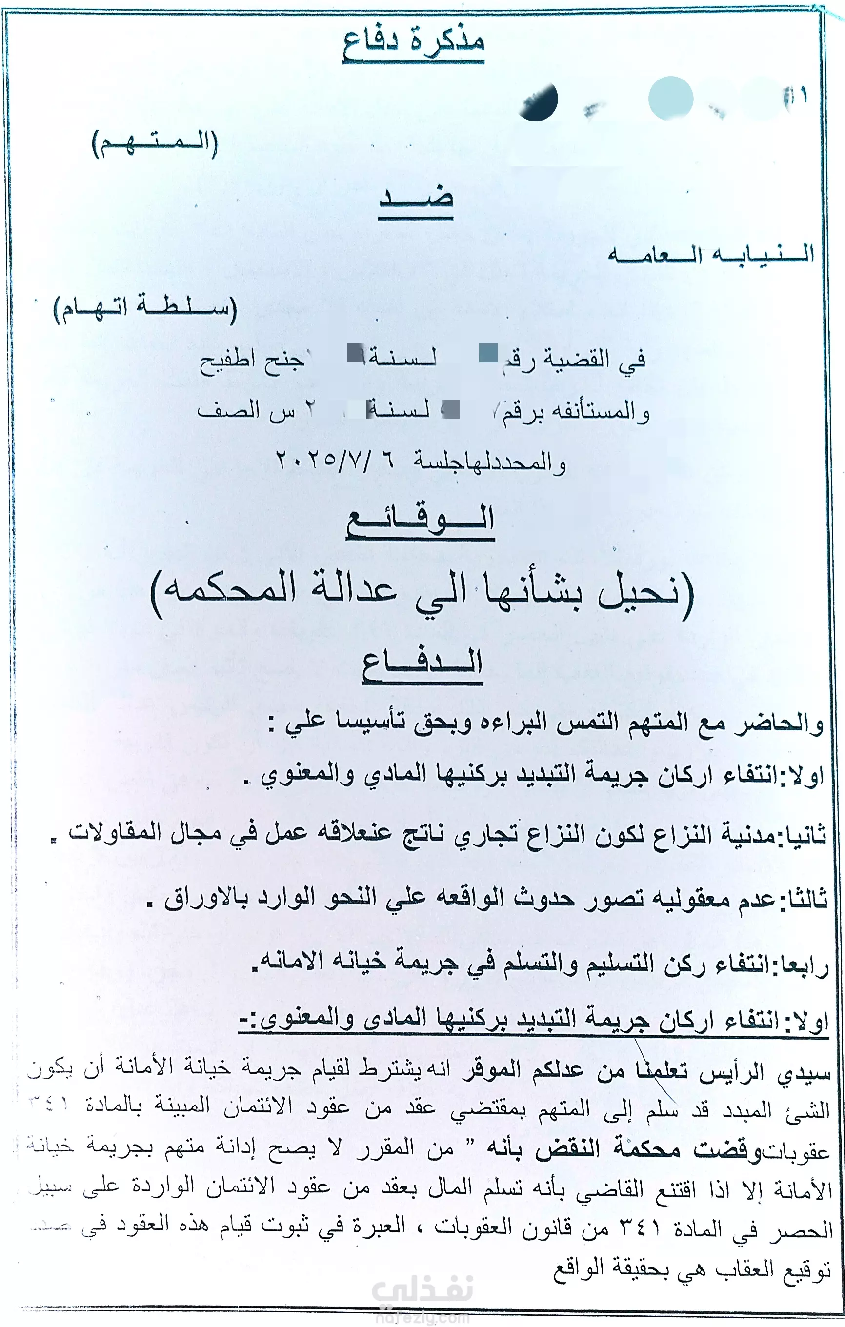 أكتب مذكرات دفاع تُقنع القاضي، لا تترك له مجالًا للشك، مدعّمة بأحكام محكمة النقض وأحدث التفسيرات القضائية.