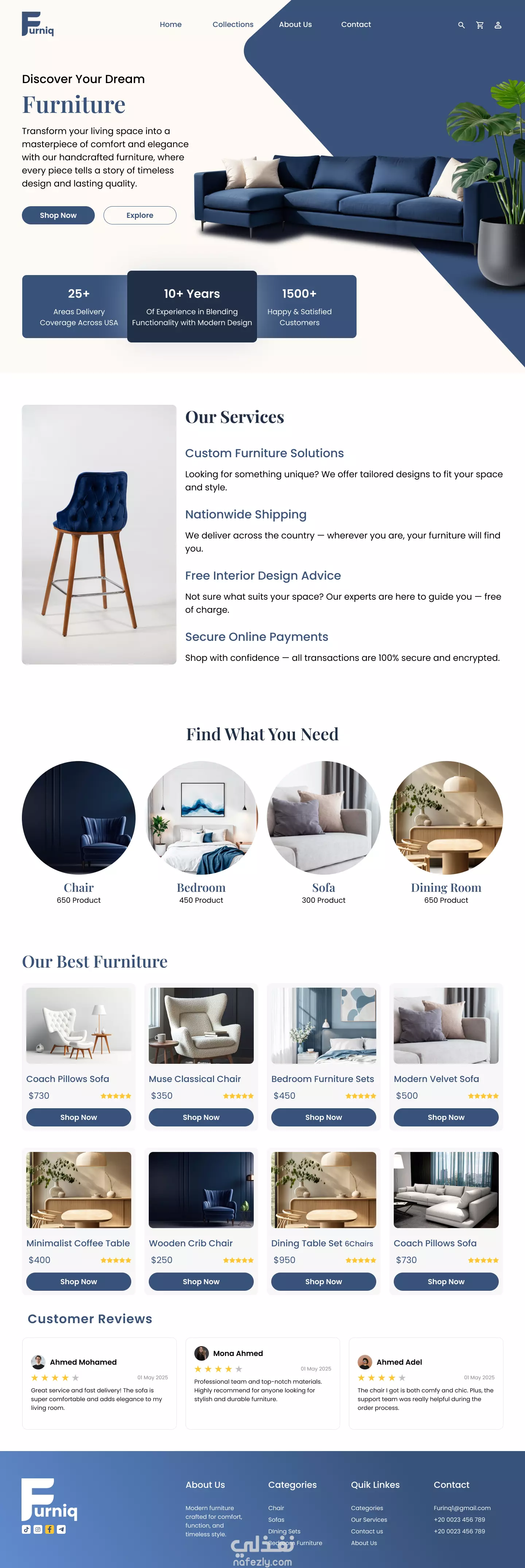 تصميم لاندينج بيدج لموقع Furniq المتخصص في الأثاث العصري. حرصت في التصميم على الدمج بين الشكل الجذاب وسهولة الاستخدام، بحيث يتمكن الزائر من تصفح المنتجات والخدمات بشكل مريح وسريع. استخدمت ألوان هادئة وصور عالية الجودة لإبراز فخامة الأثاث وإيصال إحساس بالراحة. كما اعتمدت على توزيع منظم للعناصر الأساسية مثل قسم الترحيب، المميزات، والمنتجات، بشكل يساعد على إبراز هوية البراند ويشجع المستخدم على التفاعل. تمت مراعاة التوازن البصري والمساحات البيضاء لتوفير تجربة تصفح واضحة وبسيطة، مما يجعل التصميم احترافي ويعكس جودة العلامة التجارية