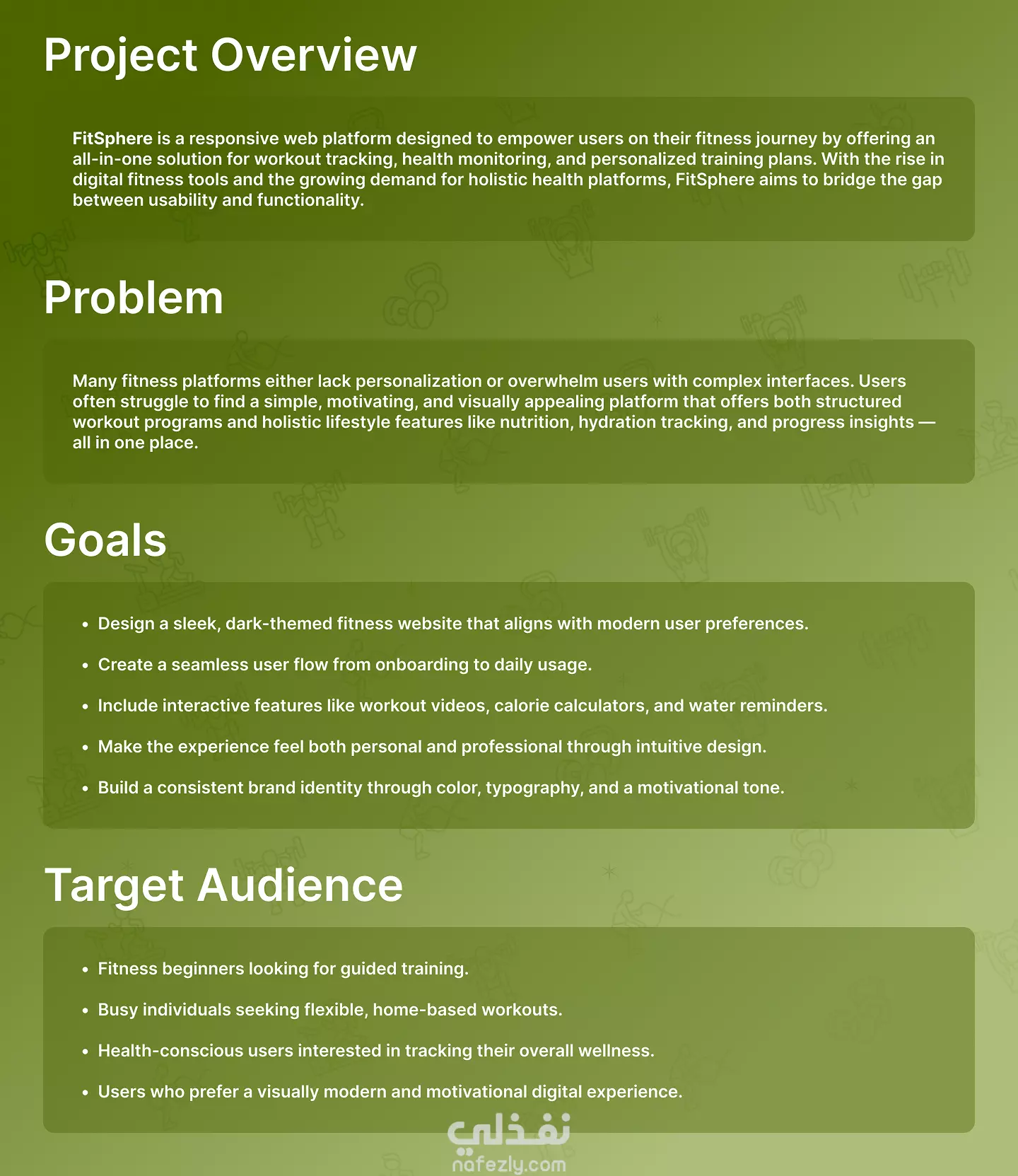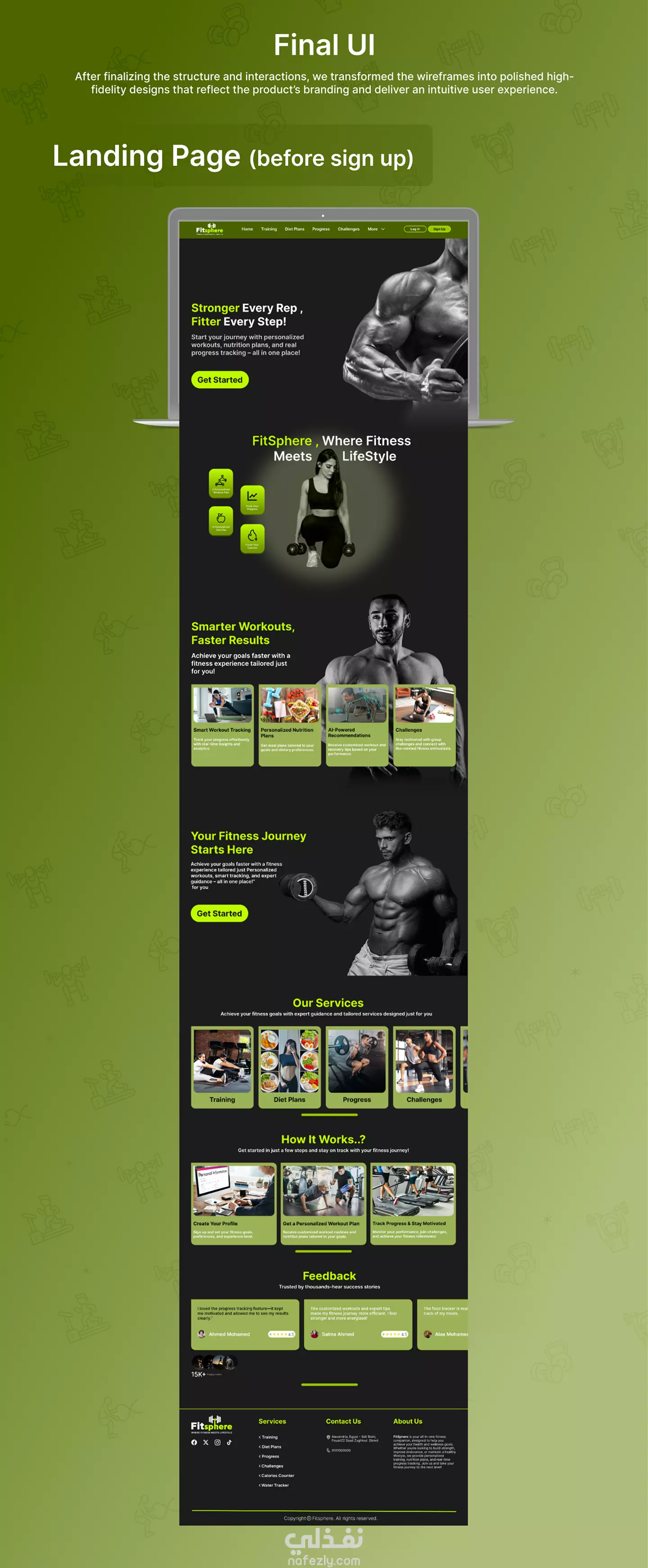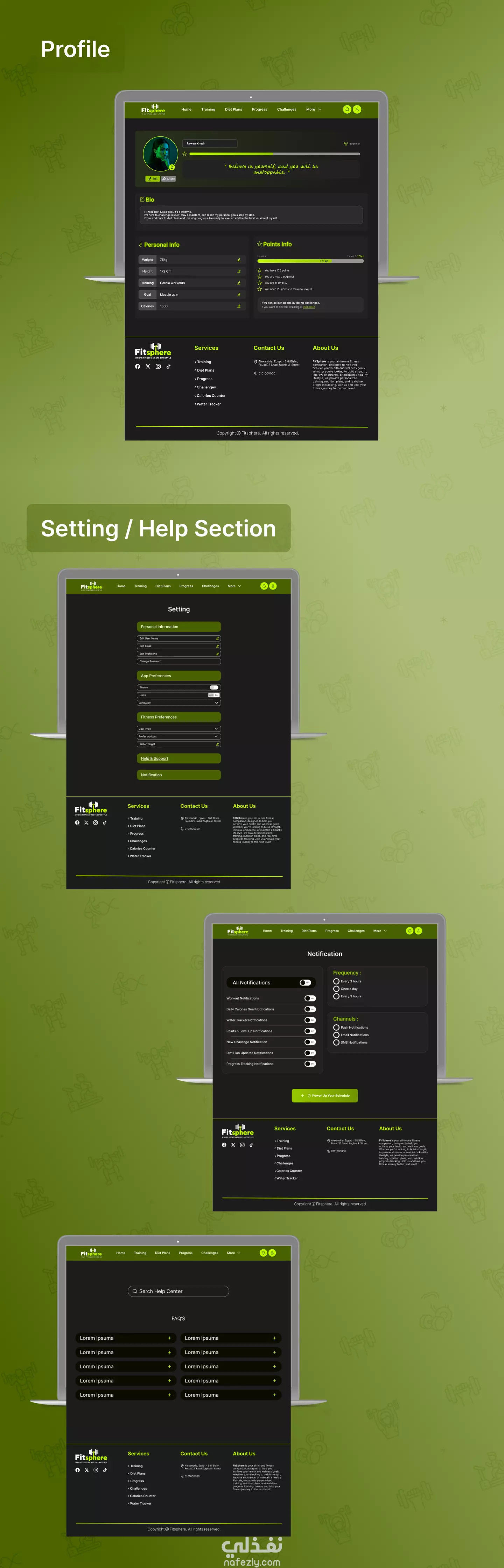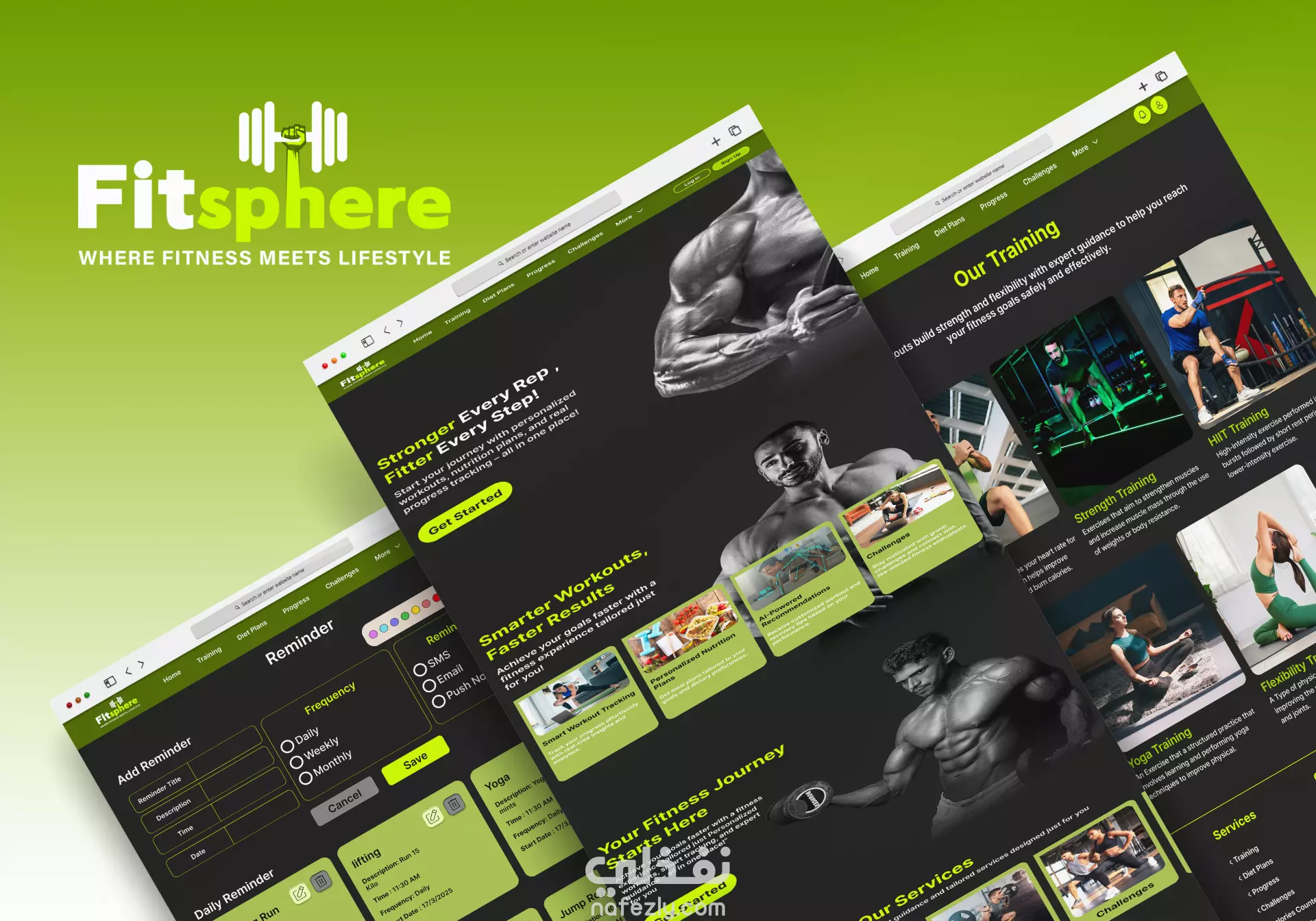 تصميم UI/UX لموقع Fitsphere، وهو موقع متكامل في مجال اللياقة البدنية والتغذية، يقدم خطط تدريبية، أنظمة غذائية، وخدمات متابعة شخصية للمستخدمين. عملت ضمن فريق متكامل، حيث تعاونّا لتقديم واجهة عصرية وتجربة استخدام سلسة، بحيث يتمكن الزائر من تصفح البرامج والخدمات بسهولة وراحة، مع التركيز على إبراز المعلومات المهمة بشكل واضح وجذاب. استخدمنا ألوان داكنة متناسقة وصور عالية الجودة لتعكس هوية الموقع وعصريته، مع توزيع منظم للعناصر الأساسية مثل الصفحة الرئيسية، خطط التمارين، الأنظمة الغذائية، وصفحات المتابعة.