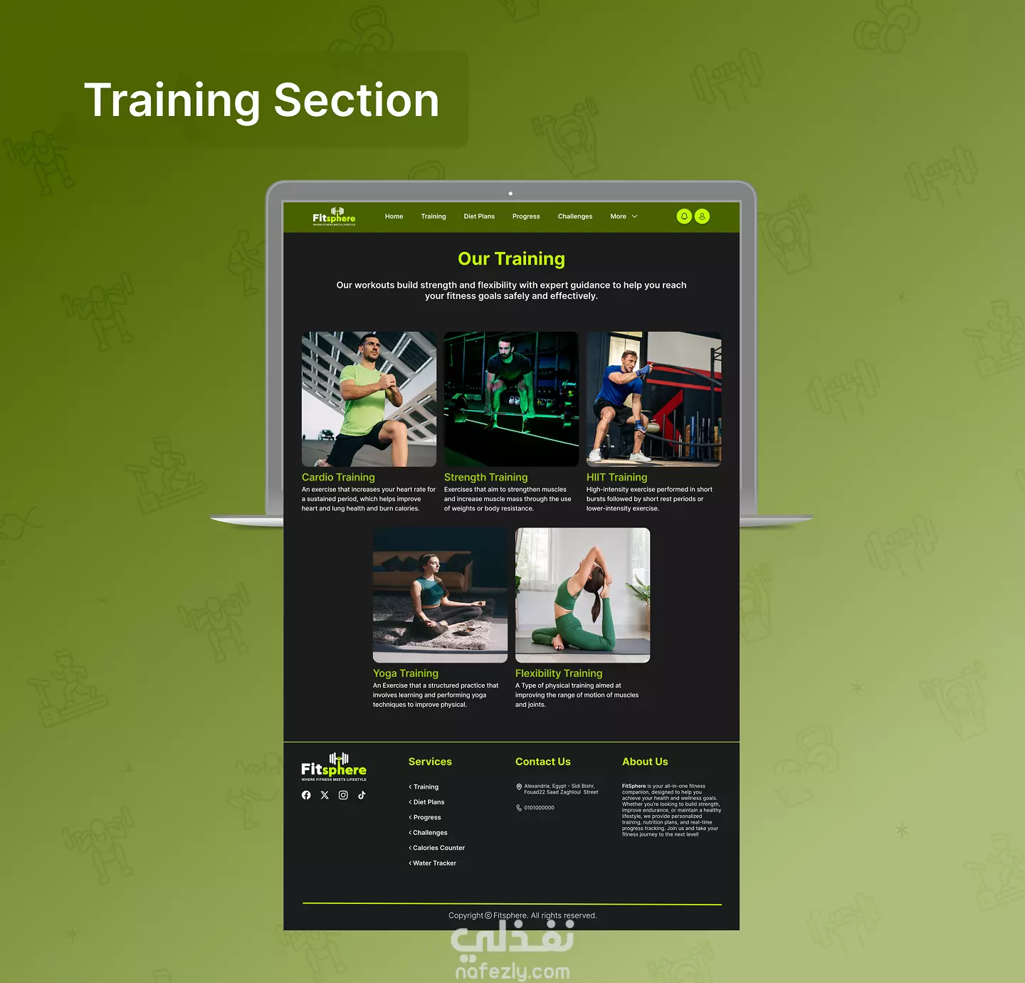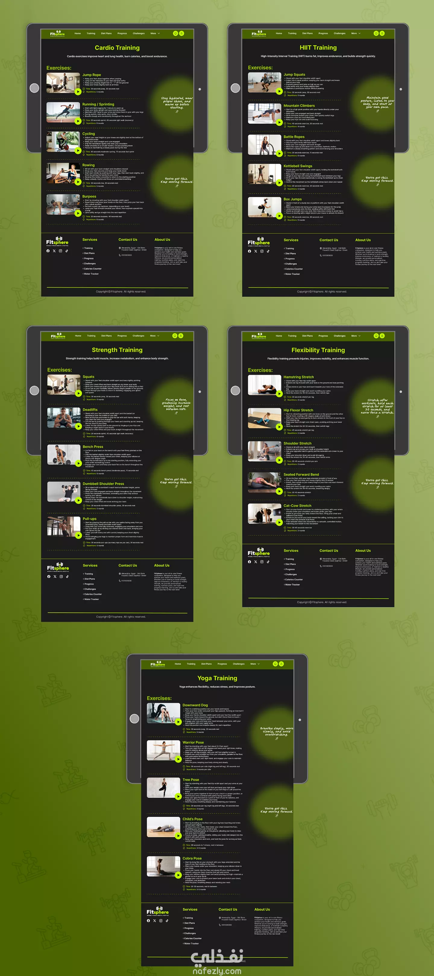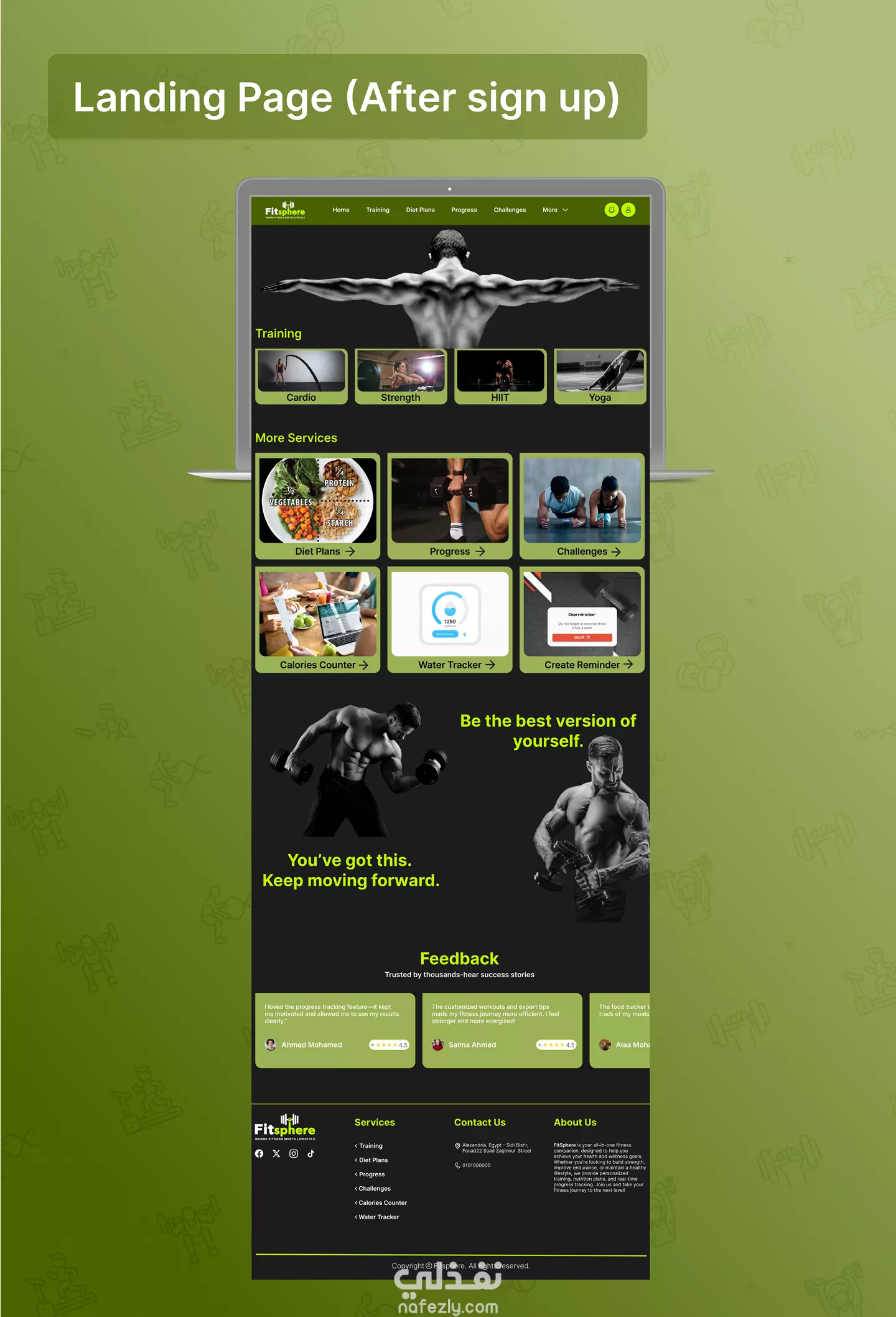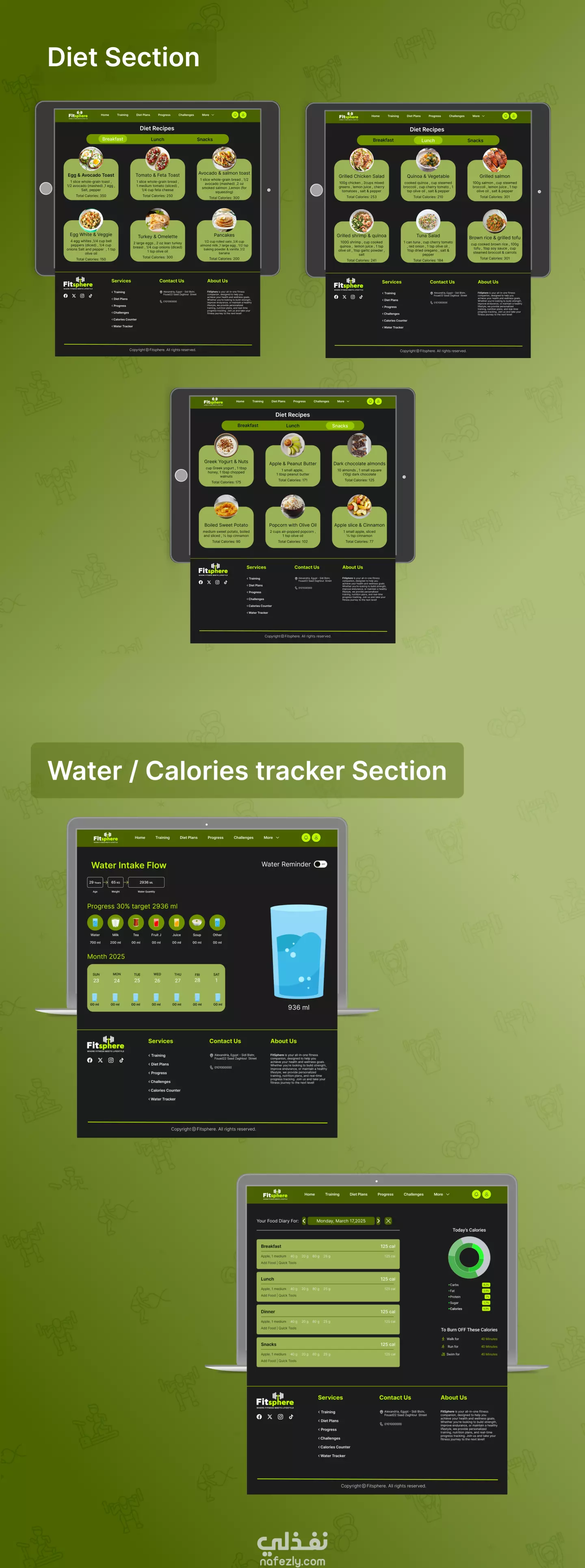تصميم UI/UX لموقع Fitsphere، وهو موقع متكامل في مجال اللياقة البدنية والتغذية، يقدم خطط تدريبية، أنظمة غذائية، وخدمات متابعة شخصية للمستخدمين. عملت ضمن فريق متكامل، حيث تعاونّا لتقديم واجهة عصرية وتجربة استخدام سلسة، بحيث يتمكن الزائر من تصفح البرامج والخدمات بسهولة وراحة، مع التركيز على إبراز المعلومات المهمة بشكل واضح وجذاب. استخدمنا ألوان داكنة متناسقة وصور عالية الجودة لتعكس هوية الموقع وعصريته، مع توزيع منظم للعناصر الأساسية مثل الصفحة الرئيسية، خطط التمارين، الأنظمة الغذائية، وصفحات المتابعة.