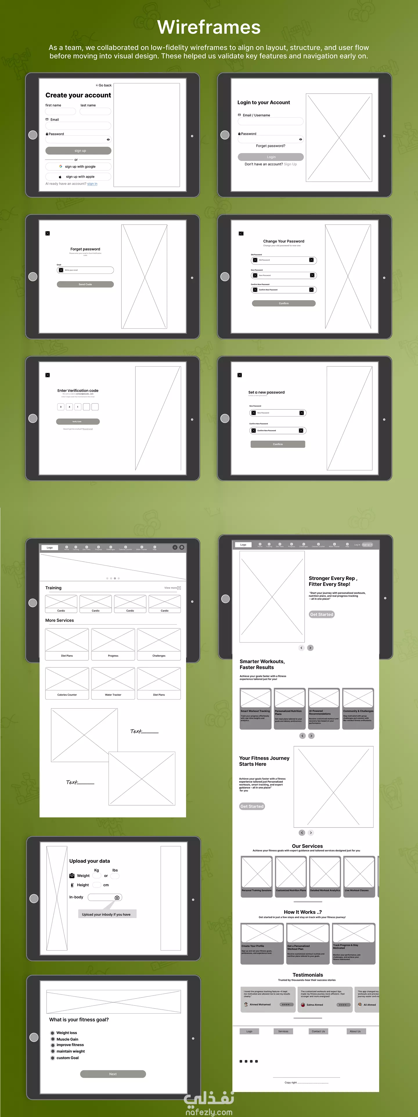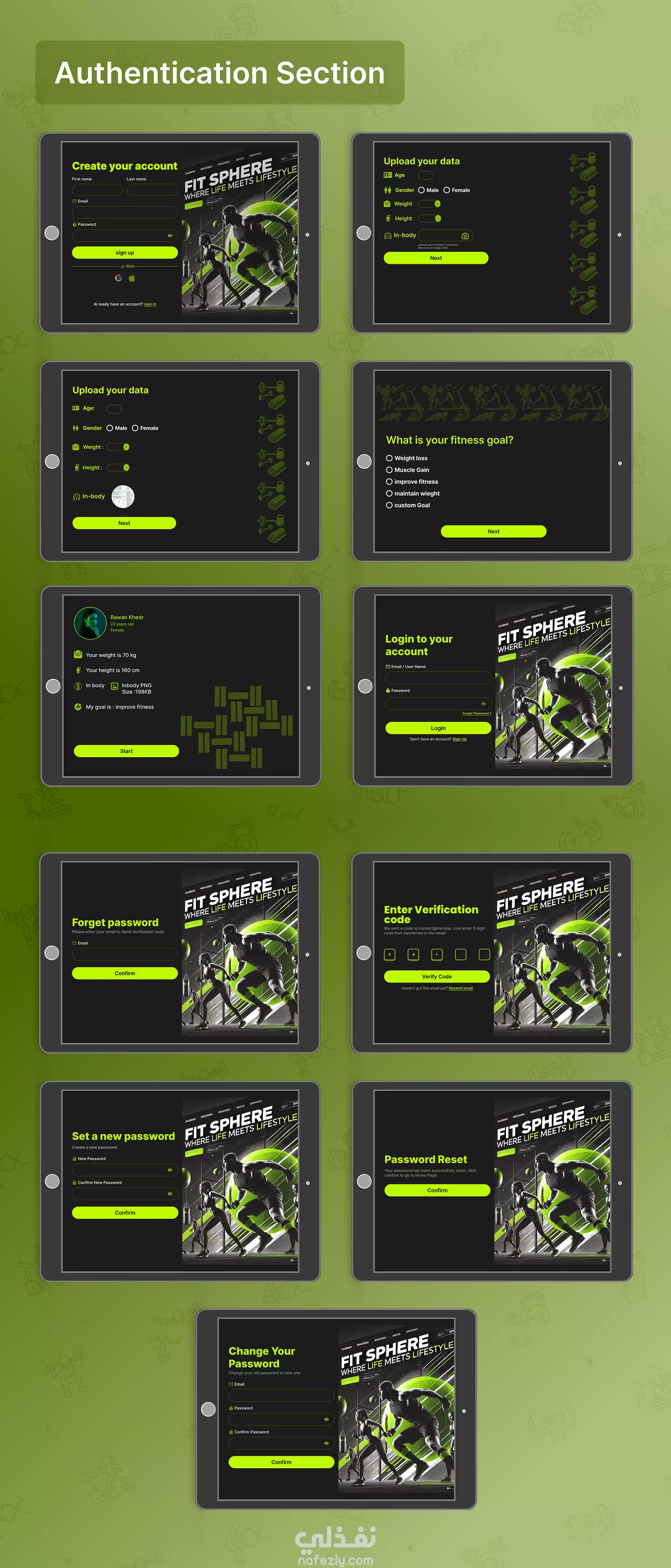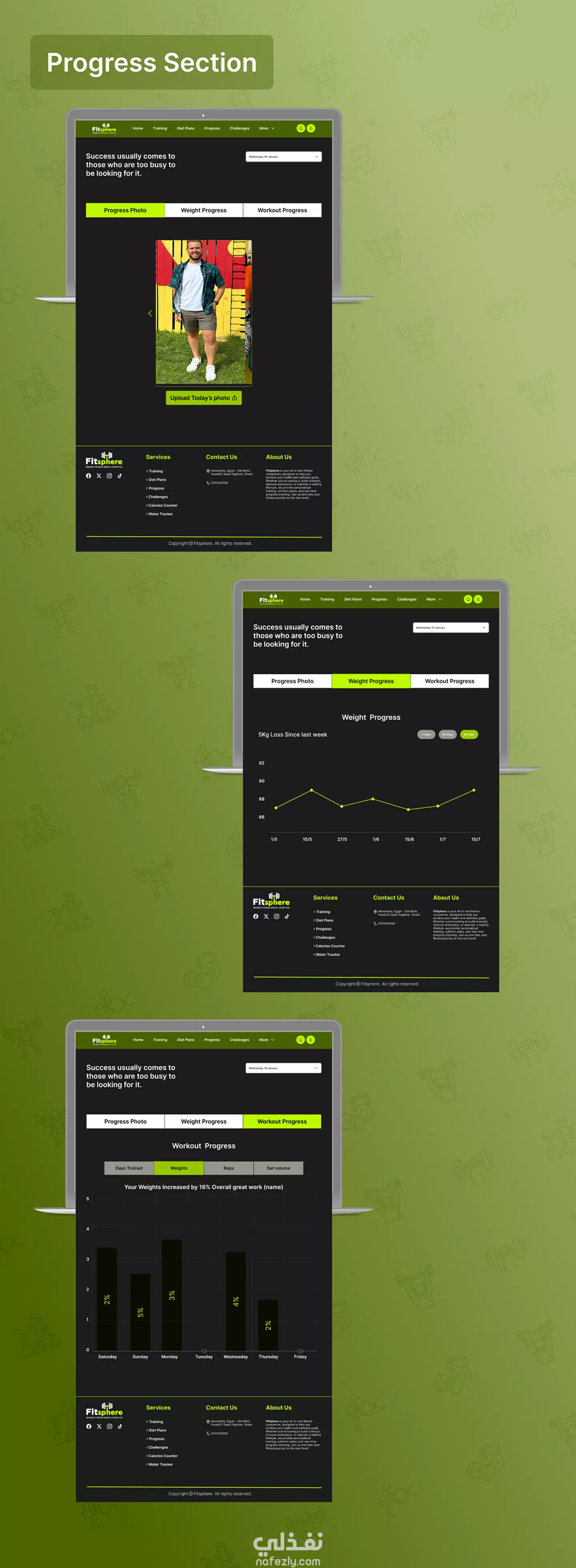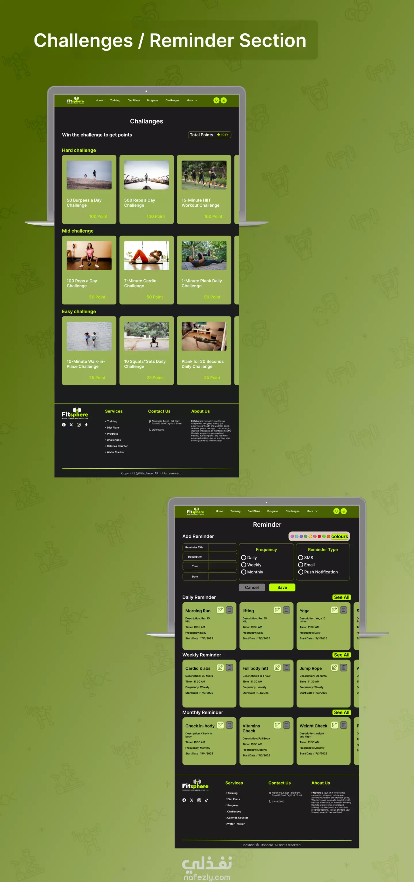 تصميم UI/UX لموقع Fitsphere، وهو موقع متكامل في مجال اللياقة البدنية والتغذية، يقدم خطط تدريبية، أنظمة غذائية، وخدمات متابعة شخصية للمستخدمين. عملت ضمن فريق متكامل، حيث تعاونّا لتقديم واجهة عصرية وتجربة استخدام سلسة، بحيث يتمكن الزائر من تصفح البرامج والخدمات بسهولة وراحة، مع التركيز على إبراز المعلومات المهمة بشكل واضح وجذاب. استخدمنا ألوان داكنة متناسقة وصور عالية الجودة لتعكس هوية الموقع وعصريته، مع توزيع منظم للعناصر الأساسية مثل الصفحة الرئيسية، خطط التمارين، الأنظمة الغذائية، وصفحات المتابعة.