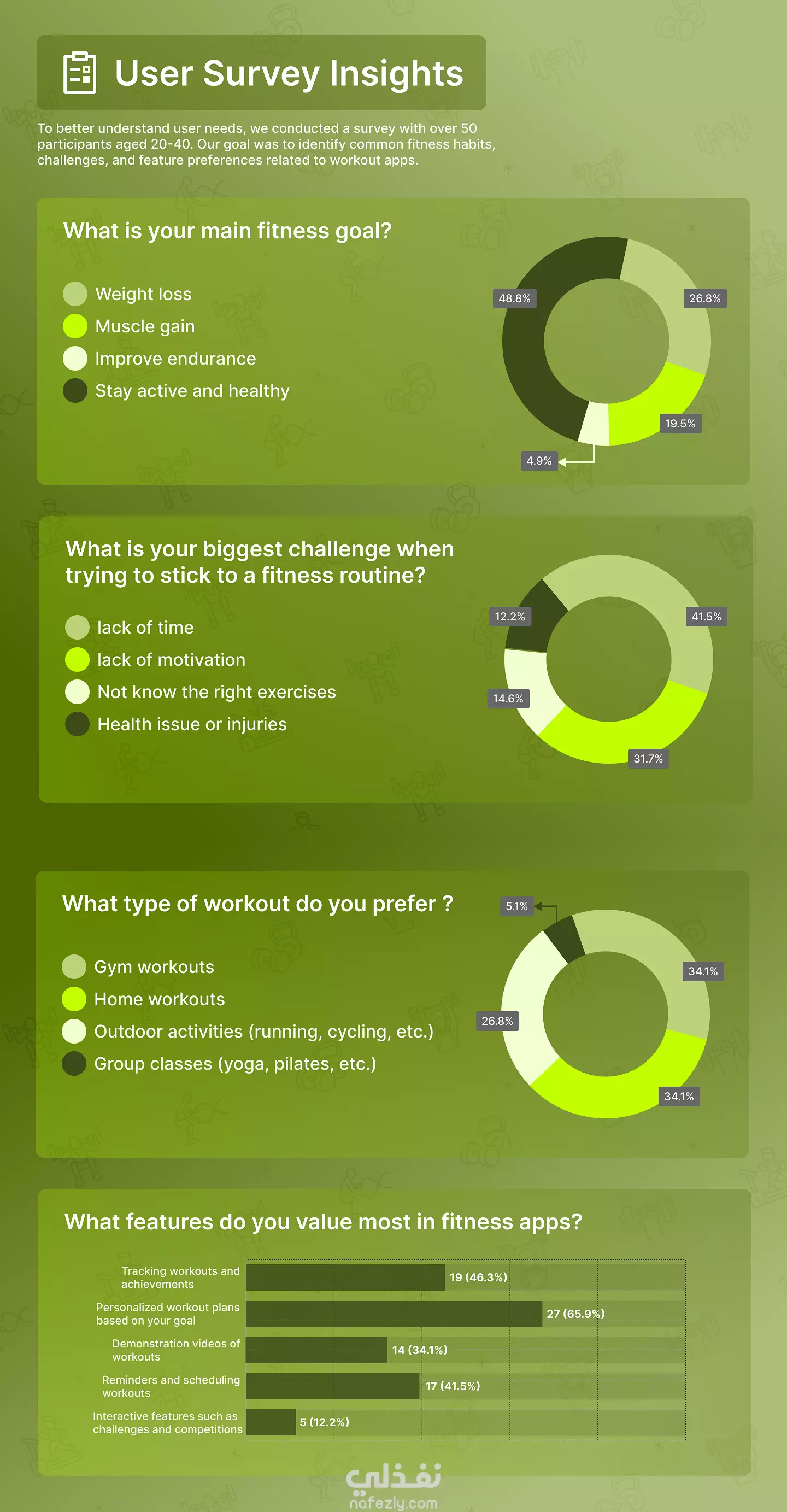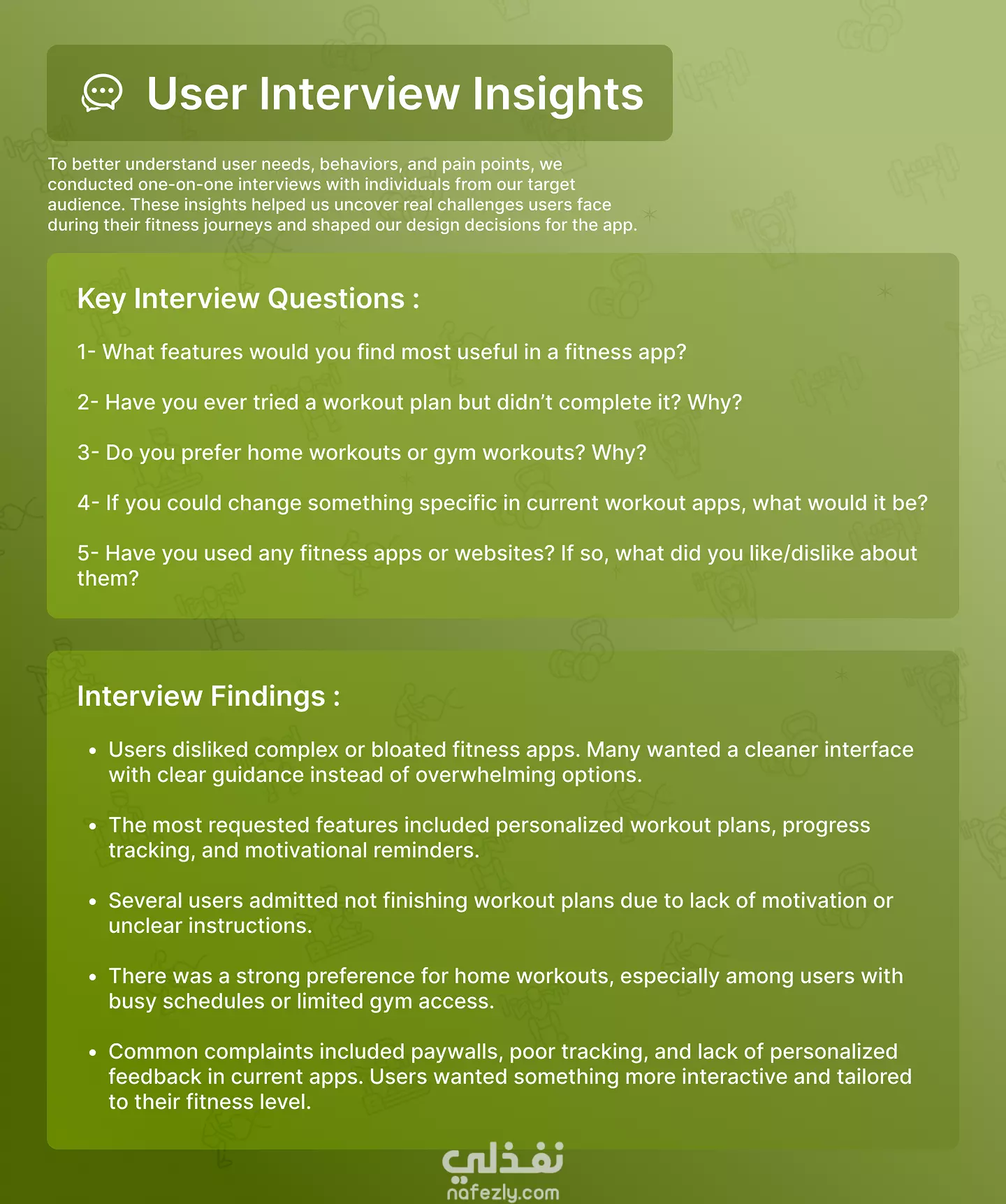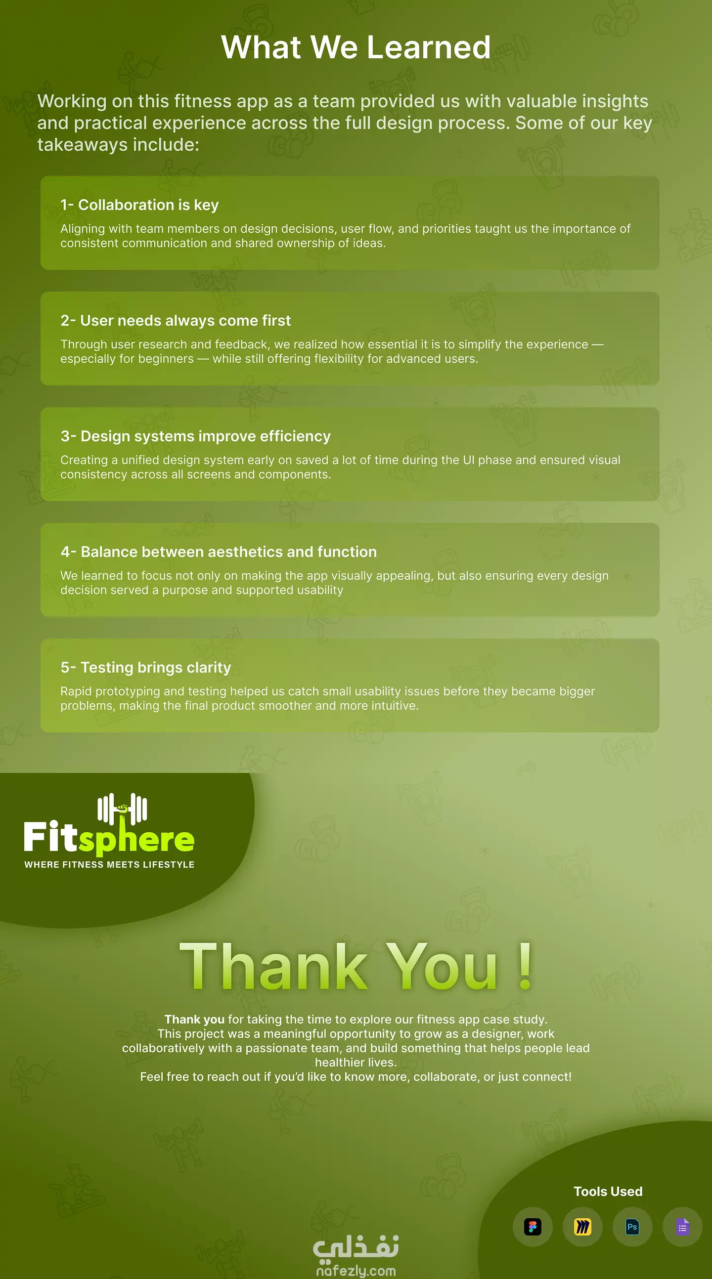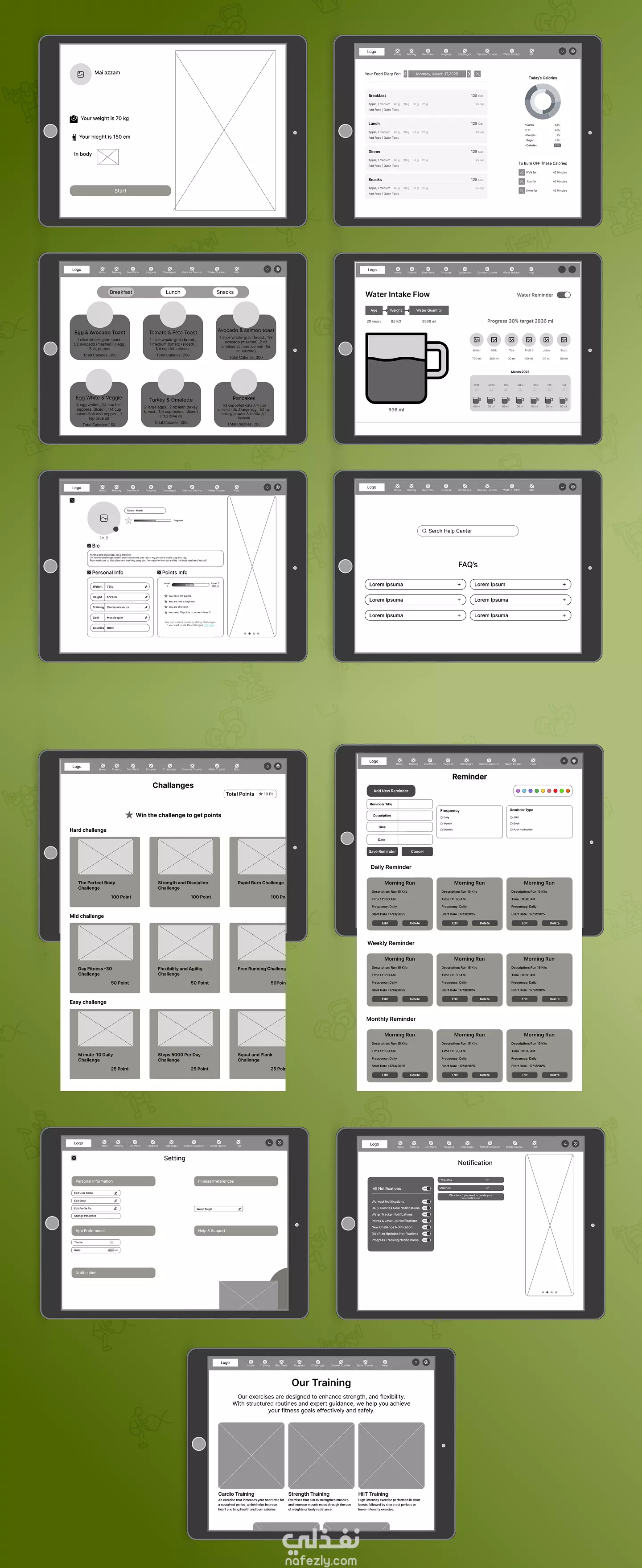 تصميم UI/UX لموقع Fitsphere، وهو موقع متكامل في مجال اللياقة البدنية والتغذية، يقدم خطط تدريبية، أنظمة غذائية، وخدمات متابعة شخصية للمستخدمين. عملت ضمن فريق متكامل، حيث تعاونّا لتقديم واجهة عصرية وتجربة استخدام سلسة، بحيث يتمكن الزائر من تصفح البرامج والخدمات بسهولة وراحة، مع التركيز على إبراز المعلومات المهمة بشكل واضح وجذاب. استخدمنا ألوان داكنة متناسقة وصور عالية الجودة لتعكس هوية الموقع وعصريته، مع توزيع منظم للعناصر الأساسية مثل الصفحة الرئيسية، خطط التمارين، الأنظمة الغذائية، وصفحات المتابعة.