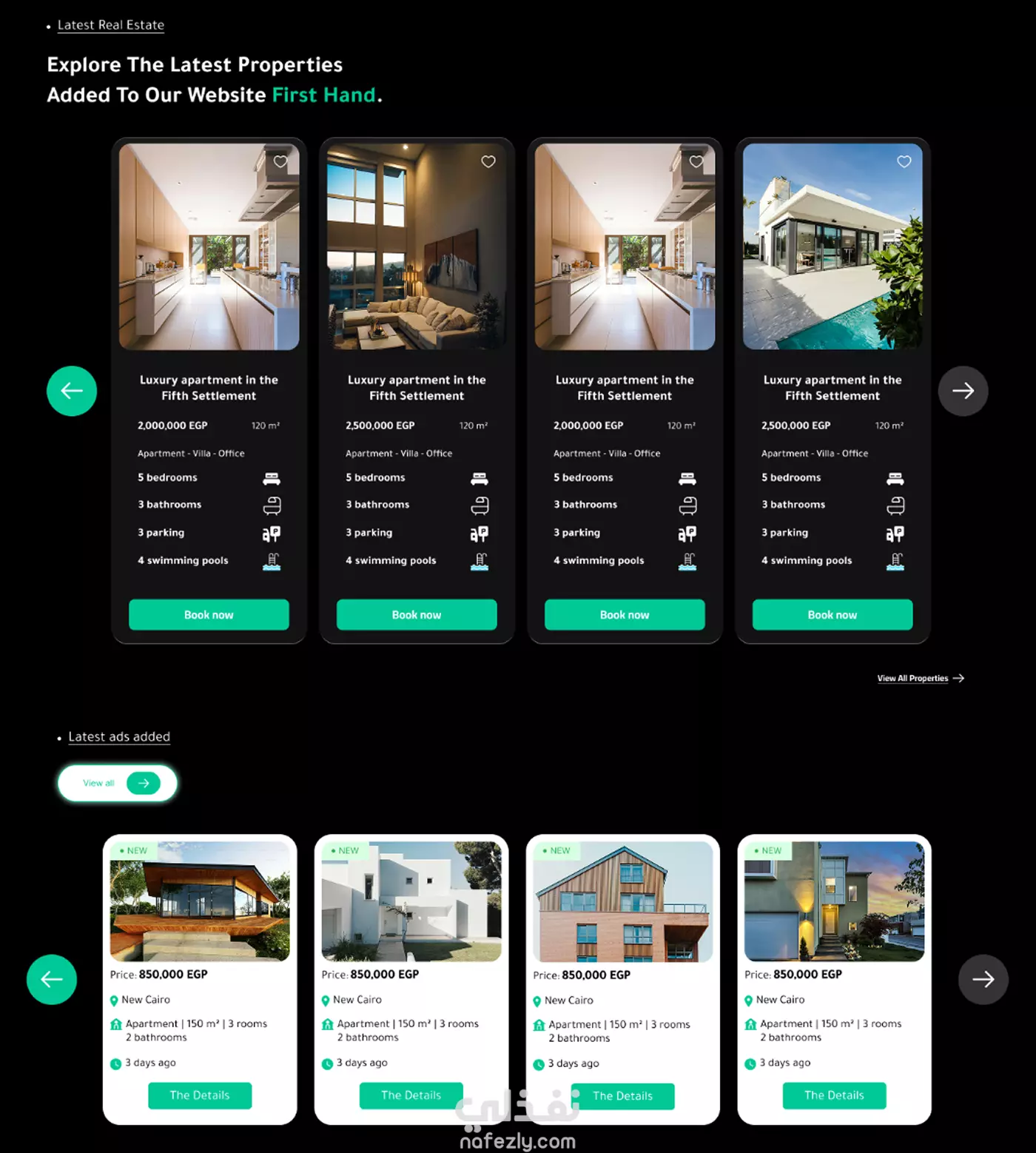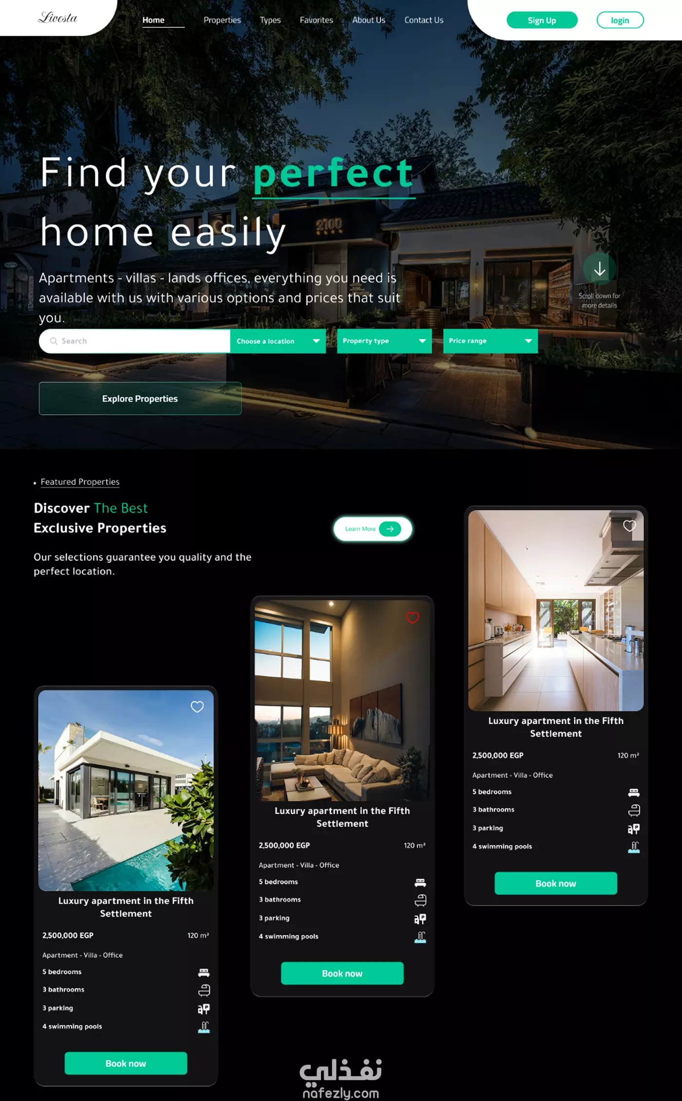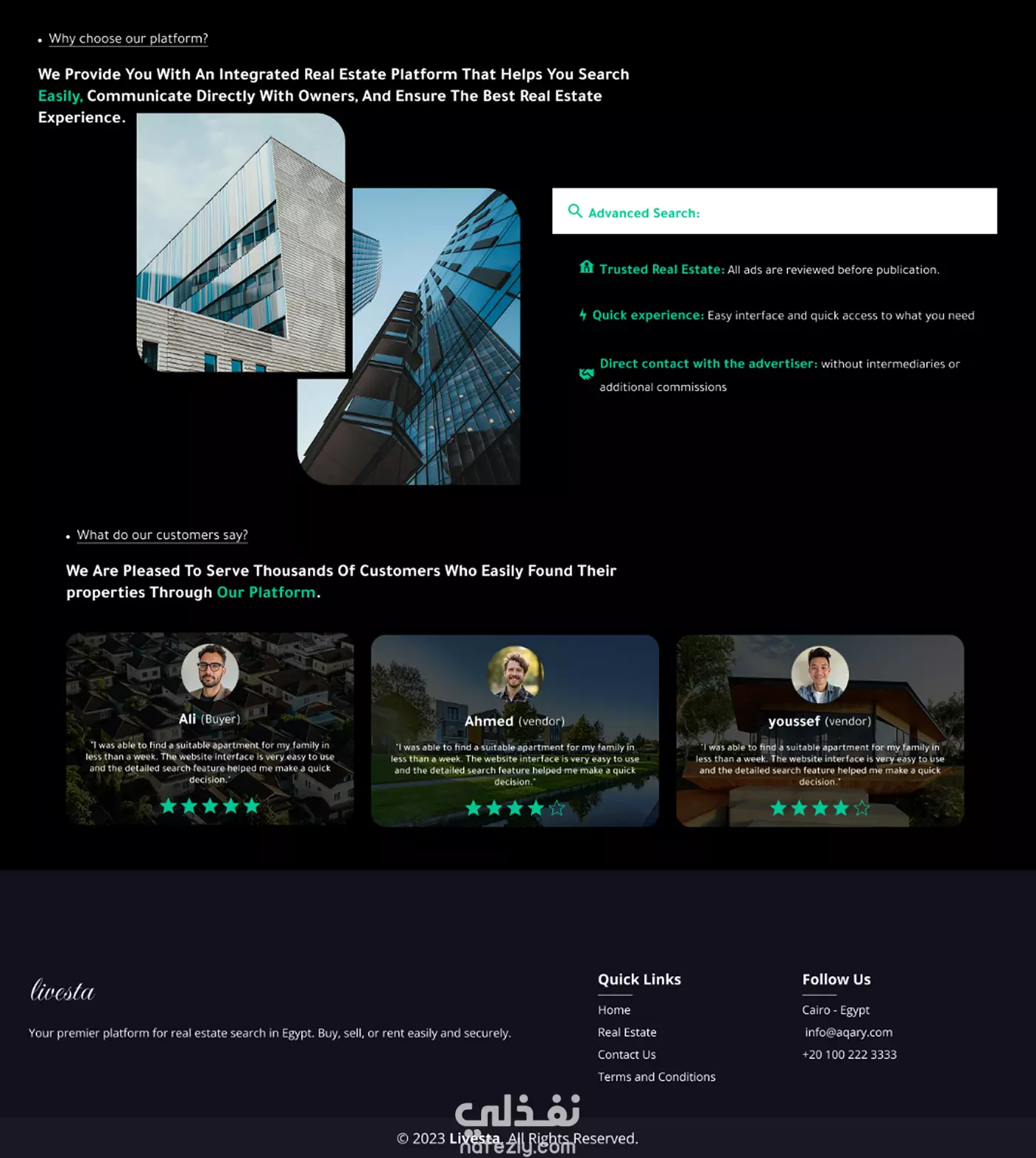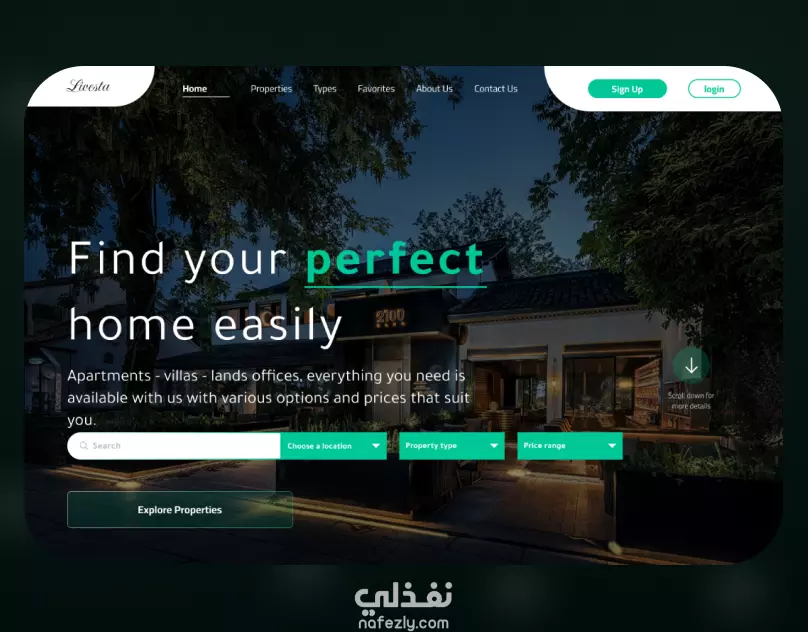 تصميم عصري وأنيق لصفحة هبوط خاصة ببراند العقارات. يركز التصميم على الوضوح والمصداقية والاحترافية لجذب العملاء، مع واجهة منظمة وألوان هادئة وتجربة استخدام سهلة تعكس هوية البراند وتدعم تحقيق العملاء المحتملين.