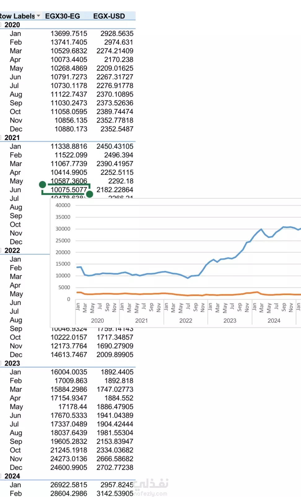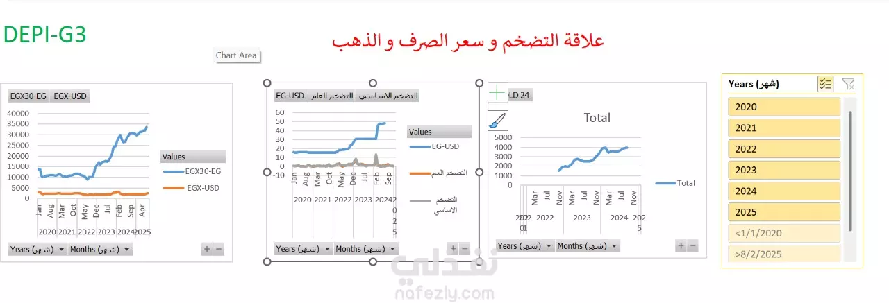 مقارنة بين سعر الصرف للجنيه مقابل الدولار و مستوى التضخم و البورصة المصرية و عمل داش بورد تفاعلية