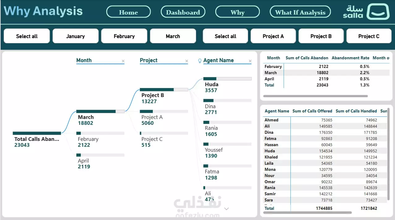 أنا شخصيًا اقترحت إضافة Abandonment Rate، علشان نحدد ليه في مكالمات ما تمش الرد عليها. وبالفعل أنشأت Section خاص بالـ Why Analysis، اللي وضّح معدل استجابة كل موظف شهريًا، لحد ما الإدارة قدرت توصل لسبب المشكلة.