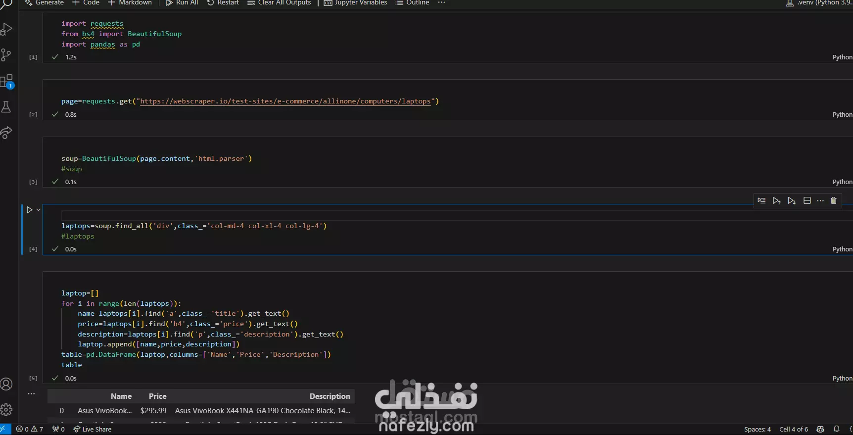 "مشروع لاستخلاص بيانات اللابتوبات من مواقع التجارة الإلكترونية وحفظها في ملف CSV" يهدف هذا المشروع إلى جمع معلومات عن اللابتوبات المتوفرة على مواقع التجارة الإلكترونية مثل الأسماء، الأسعار، ووصف المنتجات، من خلال استخدام تقنيات web scraping. يتم استخراج هذه البيانات باستخدام مكتبات Python مثل requests و BeautifulSoup4، ثم يتم حفظها بشكل منظم في ملف CSV، مما يسهل استخدامها وتحليلها لاحقًا. الميزات الرئيسية للمشروع: استخلاص بيانات اللابتوبات: يتم جمع أسماء اللابتوبات، الأسعار، وأوصاف المنتجات من الموقع الإلكتروني. تصدير البيانات إلى CSV: يتم حفظ البيانات المستخلصة في ملف CSV يسهل تحميله وفتحه باستخدام برامج مثل Excel أو Google Sheets. سهولة الاستخدام: يمكن للمستخدم تشغيل السكربت بسهولة عبر Python والحصول على البيانات المطلوبة بنقرة واحدة. المتطلبات: Python 3.x مكتبة requests لجلب المحتوى من الإنترنت مكتبة BeautifulSoup4 لتحليل محتوى HTML مكتبة pandas لتحويل البيانات إلى هيكل CSV