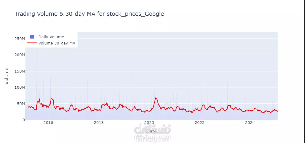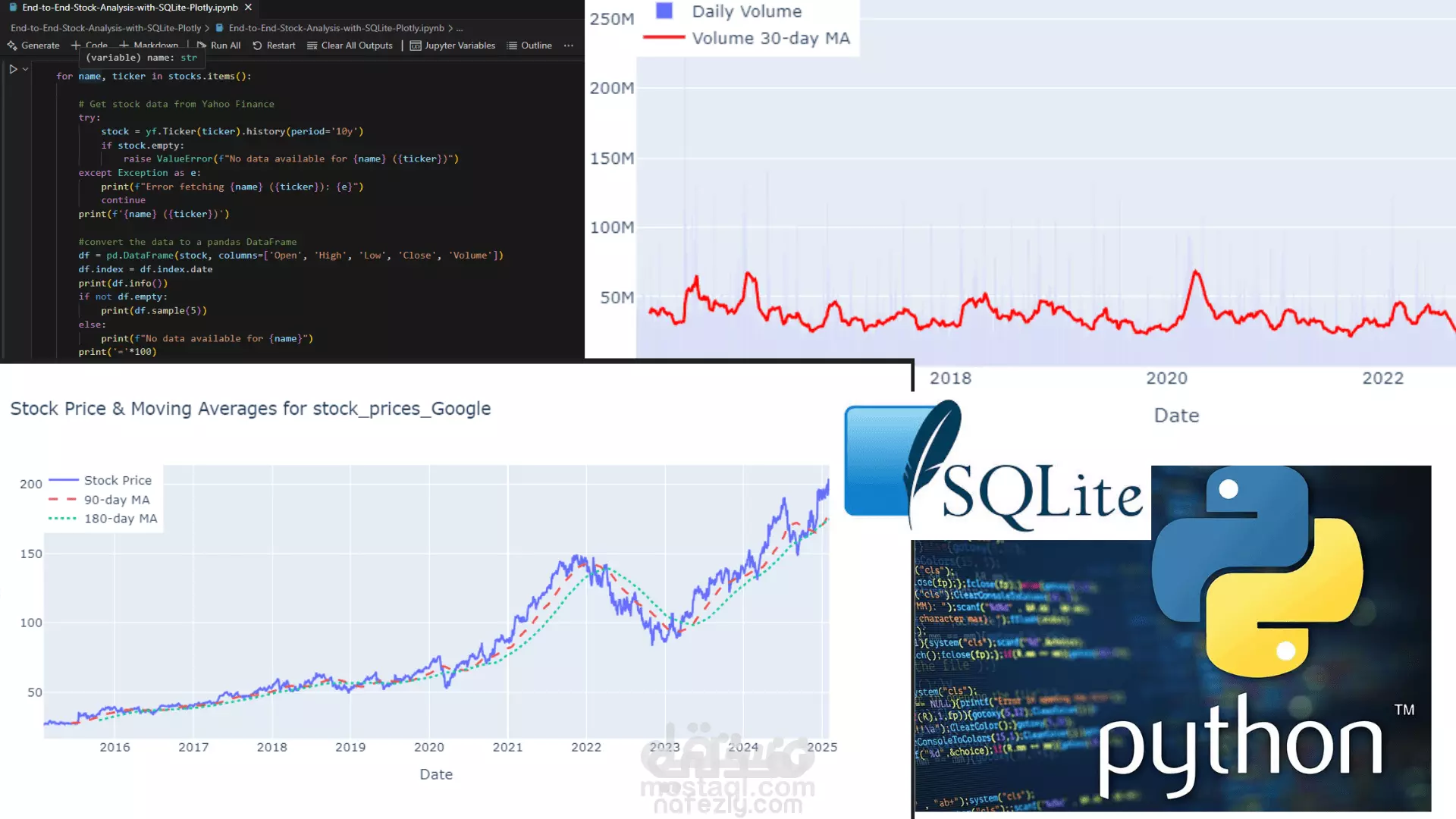 العمل يتضمن جمع وتحليل بيانات الأسهم لشركات مثل جوجل، أمازون، مايكروسوفت، تسلا، وفيسبوك على مدار 10 سنوات باستخدام لغة البرمجة Python. يتم تحميل البيانات من موقع Yahoo Finance وتخزينها في قاعدة بيانات SQLite. بعد ذلك، يتم حساب المتوسطات المتحركة للأسعار وحجم التداول، ثم عرض البيانات في رسوم بيانية تفاعلية باستخدام مكتبة Plotly. الهدف هو تحليل اتجاهات أسعار الأسهم وحجم التداول بمرور الوقت بطريقة مرئية وسهلة الفهم.