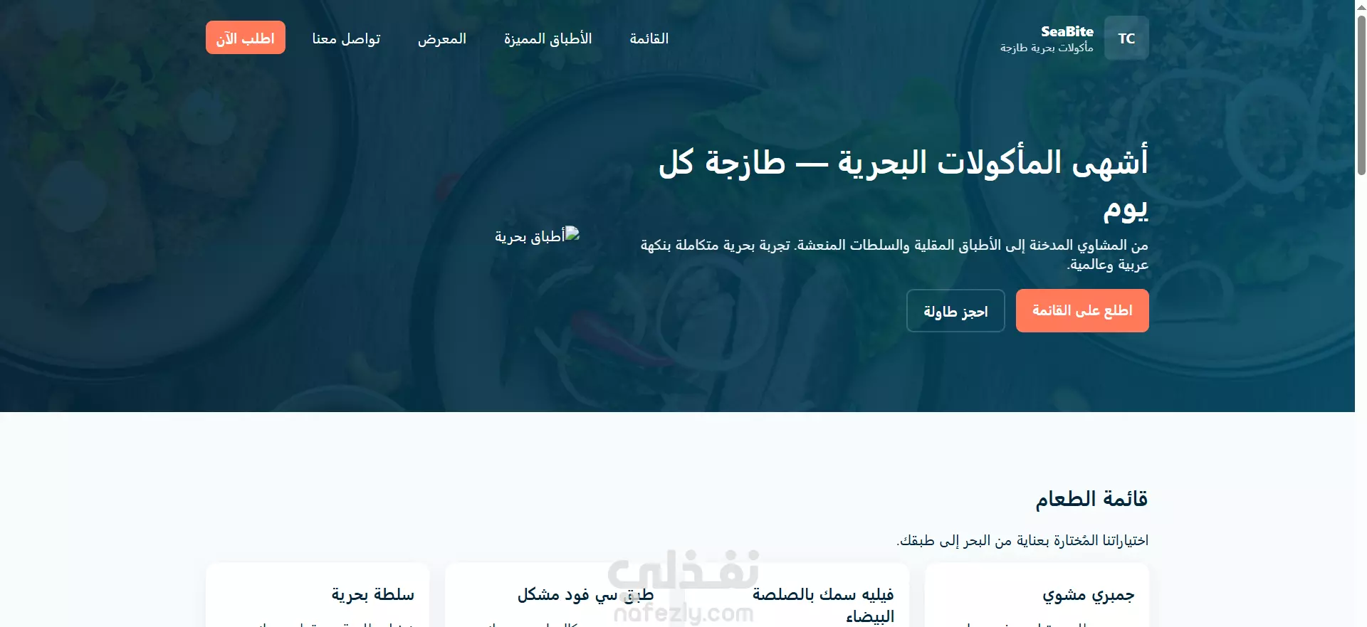 صفحة رئيسية جذابة مع هيرو وصورة مميزة للمأكولات البحرية.