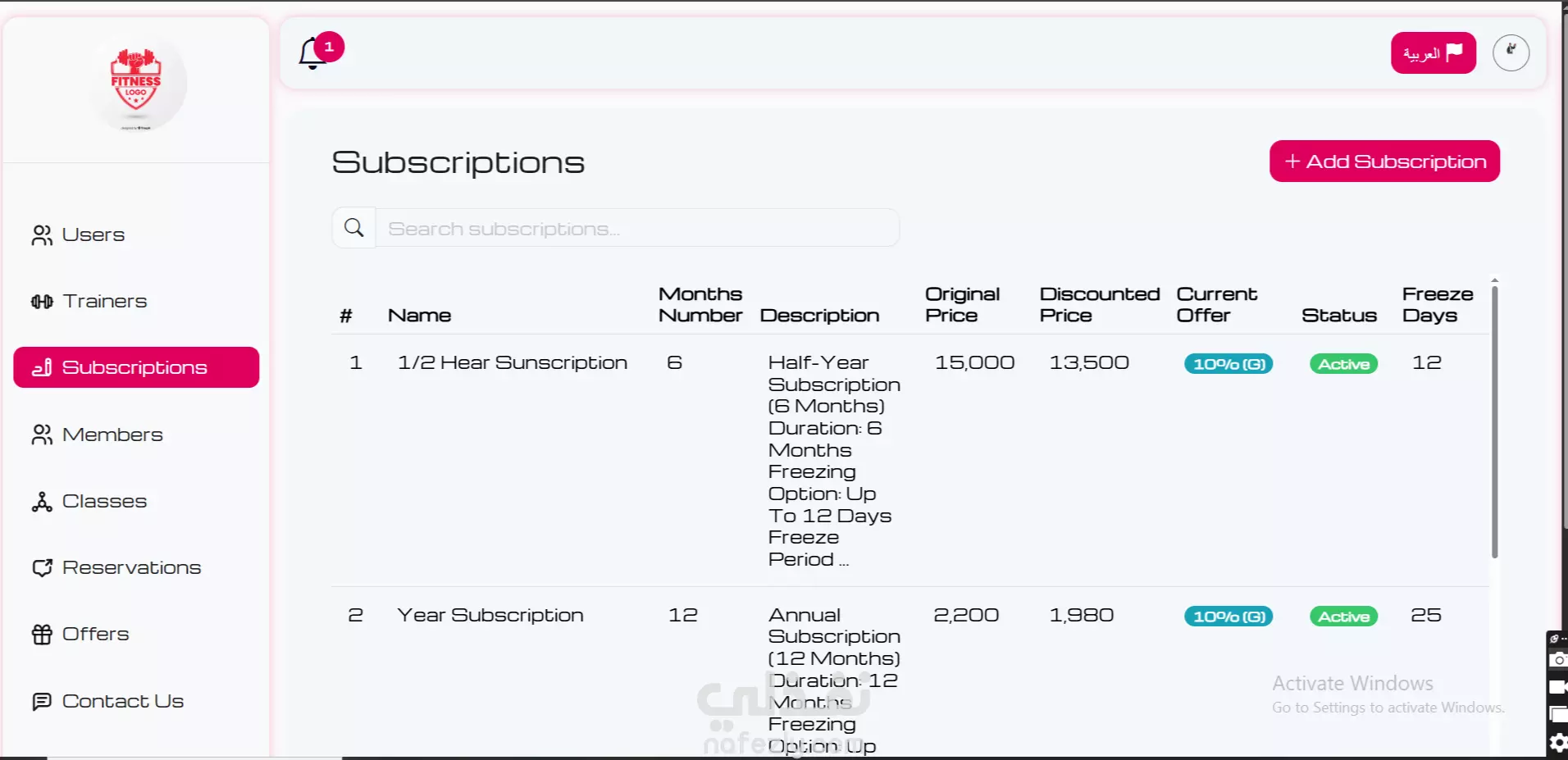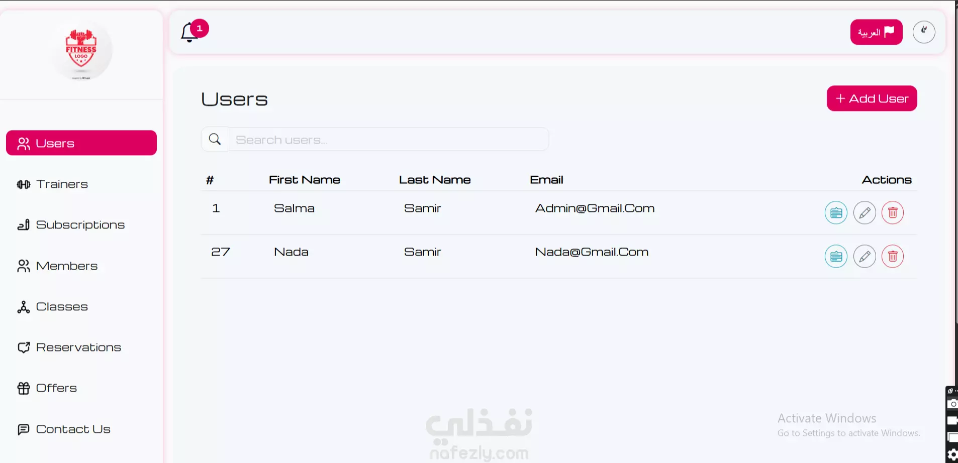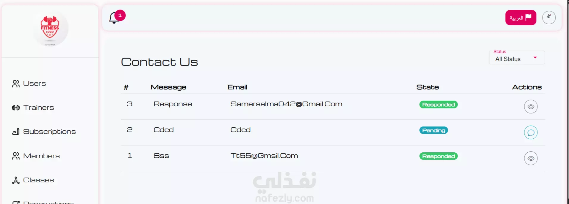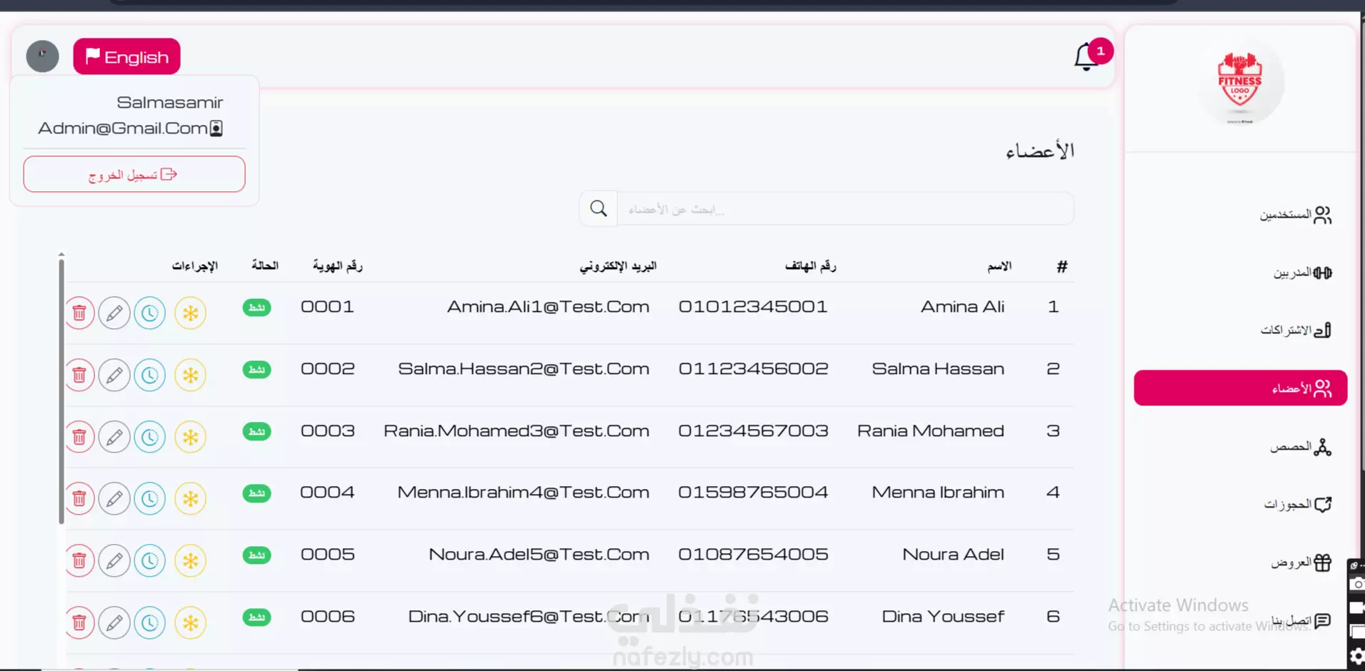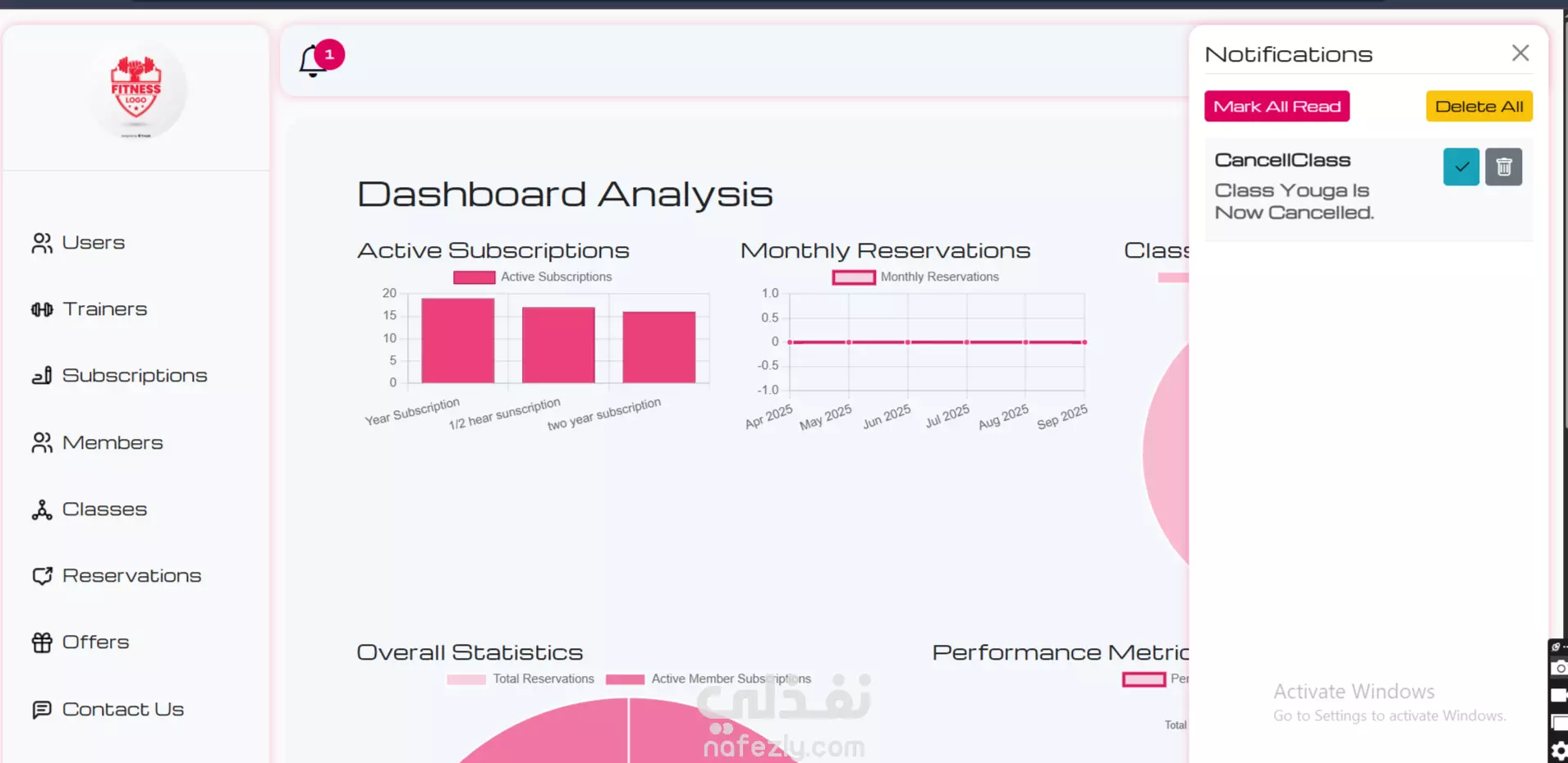 🏋️♀️ نظام إدارة صالة رياضية (Gym Management Dashboard) المشروع عبارة عن داشبورد متكامل لإدارة وتنظيم صالة رياضية (Gym) يهدف إلى تسهيل متابعة الأعضاء، الاشتراكات، الكلاسات، الحجوزات، والعروض، بالإضافة إلى إدارة المستخدمين والمدربين، وذلك من خلال واجهة سهلة الاستخدام وداعمة للغتين (عربي/إنجليزي). ✨ المميزات الرئيسية: 📊 الصفحة الرئيسية (Dashboard) Data Visualization: عرض أهم الإحصائيات والبيانات المتغيرة في النظام بشكل رسوم بيانية ولوحات معلومات (مثل عدد الأعضاء، الاشتراكات النشطة، الحجوزات…). 👥 إدارة المستخدمين (Users Management) إمكانية إضافة مستخدمين جدد. تحديد الصفحات التي يمكن للمستخدم الوصول إليها (صلاحيات القائمة). 💳 الاشتراكات (Subscriptions) إنشاء الاشتراكات وتفصيلها (السعر – المدة – عدد أيام التجميد المسموح بها – مميزات أخرى). 🧑🤝🧑 الأعضاء (Members) ربط كل عضو بالاشتراك الخاص به. إمكانية تجميد الاشتراك (Freeze) وفقاً لعدد الأيام المتاحة له في باقة الاشتراك. عرض تاريخ الاشتراكات الخاص بالعضو بالتفصيل. 🏋️ المدربين (Trainers) تسجيل بيانات المدربين. تحديد نوع المدرب (مدرب عام – مدرب خاص بالكلاسات). 📅 الكلاسات (Classes) إنشاء الكلاسات وتحديد (اليوم – الوقت – المدرب – الحد الأقصى لعدد الأعضاء). منع تكرار إنشاء كلاس في نفس اليوم ونفس الوقت. إمكانية إلغاء الكلاس (Cancel). عرض عدد الحجوزات الخاصة بكل كلاس من الخارج. تنزيل الجدول الأسبوعي للكلاسات (من الجمعة إلى السبت) كصورة تشمل الأيام – الأوقات – المدربين. 📝 الحجوزات (Reservations) حجز العضو في كلاس محدد. منع العضو من تكرار الحجز في نفس الكلاس. عرض عدد المقاعد المتبقية المتاحة في كل كلاس. الحجوزات متاحة فقط على كلاسات اليوم الحالي. 🎁 العروض (Offers) إضافة عروض وخصومات بالنسبة المئوية (%). إمكانية تطبيق الخصم على كلاس محدد أو على جميع الكلاسات. 📩 الرسائل (Contact Us) استقبال الرسائل القادمة من الموقع. الرد على الرسائل مباشرة من النظام. إرسال الرد عبر البريد الإلكتروني للمستخدم. ⚙️ مميزات إضافية: دعم اللغتين (عربي / إنجليزي). Pagination في كل الصفحات لتنظيم عرض البيانات. Smart Search للبحث المتقدم والسريع داخل كل صفحة. نظام إشعارات للتنبيهات المختلفة (مثل الحجوزات أو انتهاء الاشتراكات). 🎯 الهدف من النظام: تسهيل إدارة الصالات الرياضية بشكل رقمي وفعال. توفير لوحة تحكم تفاعلية تربط بين جميع عناصر الصالة (أعضاء – مدربين – اشتراكات – كلاسات – عروض). تقديم تجربة استخدام سلسة واحترافية تدعم أصحاب الصالات والموظفين في إدارة أعمالهم اليومية.