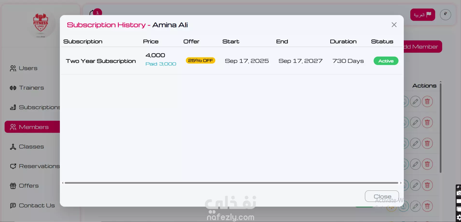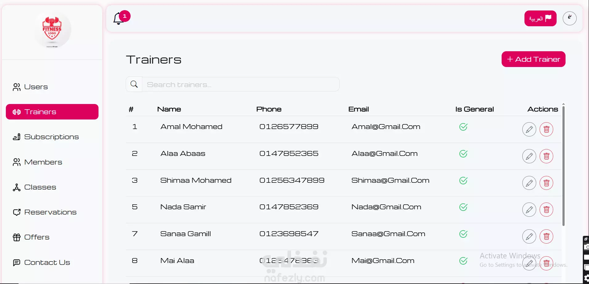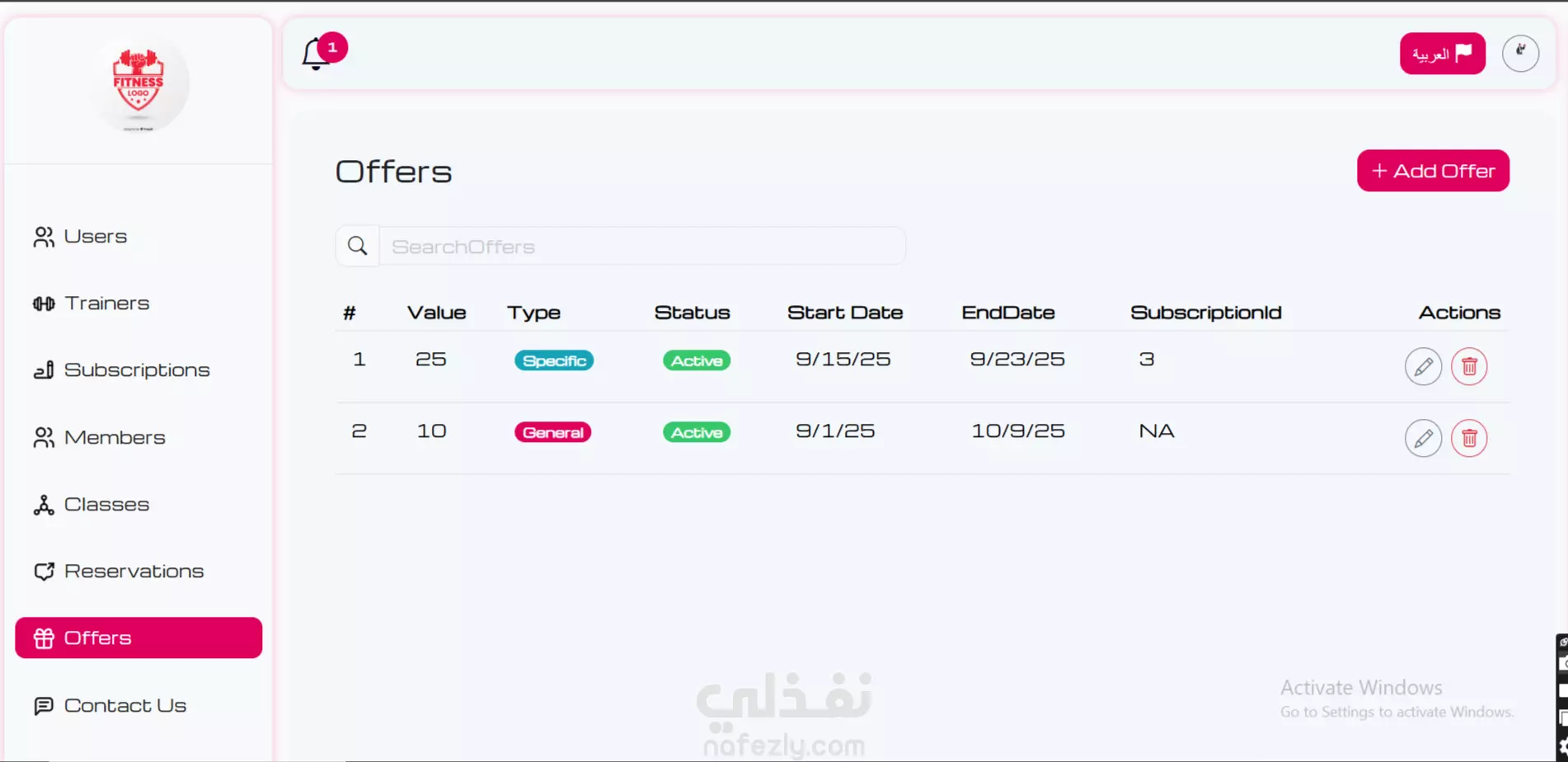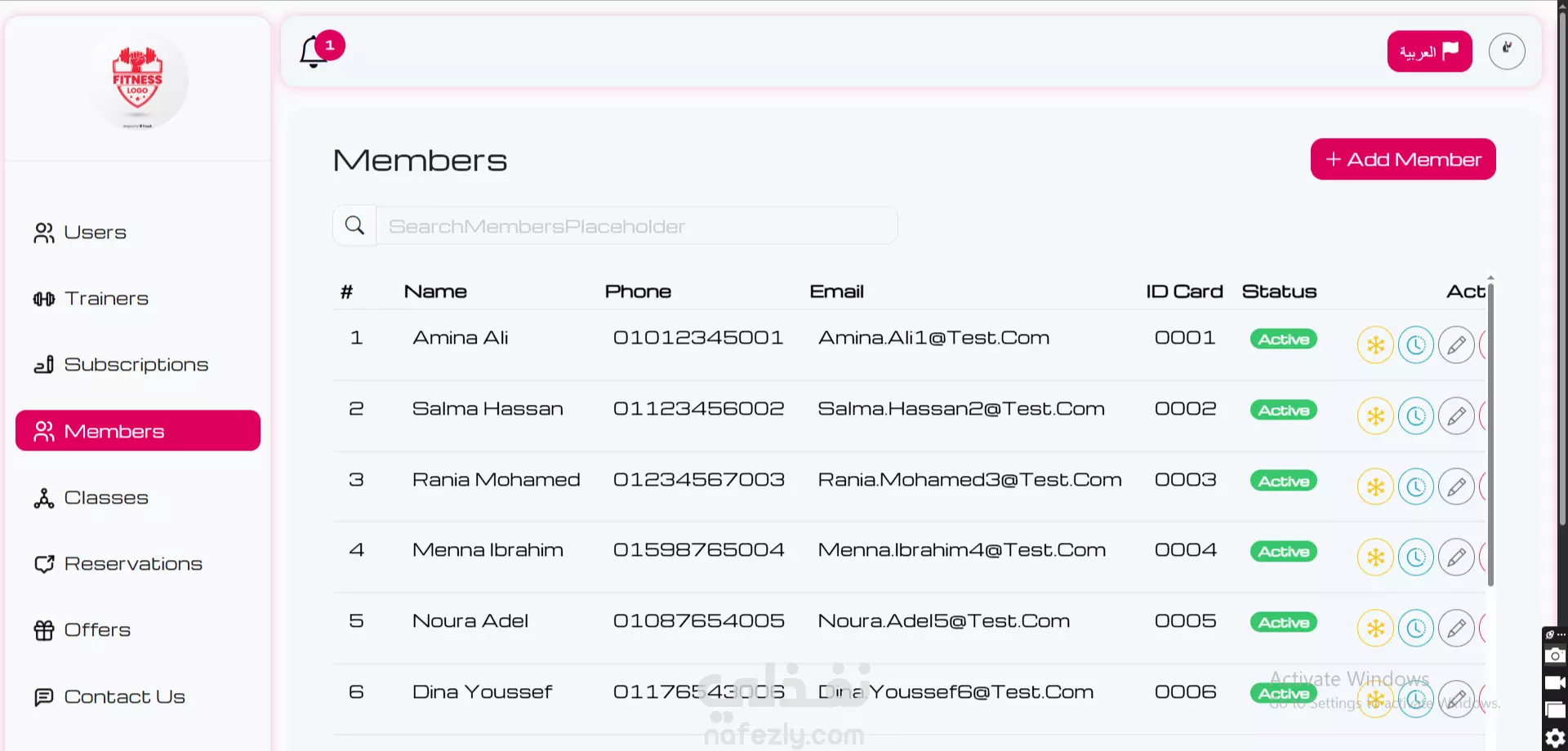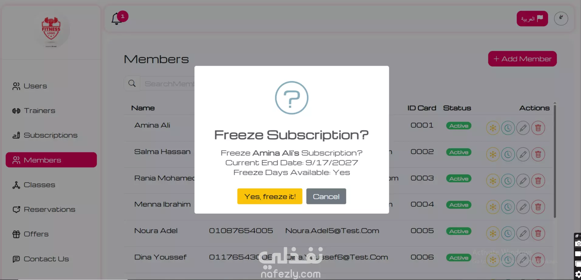 🏋️♀️ نظام إدارة صالة رياضية (Gym Management Dashboard) المشروع عبارة عن داشبورد متكامل لإدارة وتنظيم صالة رياضية (Gym) يهدف إلى تسهيل متابعة الأعضاء، الاشتراكات، الكلاسات، الحجوزات، والعروض، بالإضافة إلى إدارة المستخدمين والمدربين، وذلك من خلال واجهة سهلة الاستخدام وداعمة للغتين (عربي/إنجليزي). ✨ المميزات الرئيسية: 📊 الصفحة الرئيسية (Dashboard) Data Visualization: عرض أهم الإحصائيات والبيانات المتغيرة في النظام بشكل رسوم بيانية ولوحات معلومات (مثل عدد الأعضاء، الاشتراكات النشطة، الحجوزات…). 👥 إدارة المستخدمين (Users Management) إمكانية إضافة مستخدمين جدد. تحديد الصفحات التي يمكن للمستخدم الوصول إليها (صلاحيات القائمة). 💳 الاشتراكات (Subscriptions) إنشاء الاشتراكات وتفصيلها (السعر – المدة – عدد أيام التجميد المسموح بها – مميزات أخرى). 🧑🤝🧑 الأعضاء (Members) ربط كل عضو بالاشتراك الخاص به. إمكانية تجميد الاشتراك (Freeze) وفقاً لعدد الأيام المتاحة له في باقة الاشتراك. عرض تاريخ الاشتراكات الخاص بالعضو بالتفصيل. 🏋️ المدربين (Trainers) تسجيل بيانات المدربين. تحديد نوع المدرب (مدرب عام – مدرب خاص بالكلاسات). 📅 الكلاسات (Classes) إنشاء الكلاسات وتحديد (اليوم – الوقت – المدرب – الحد الأقصى لعدد الأعضاء). منع تكرار إنشاء كلاس في نفس اليوم ونفس الوقت. إمكانية إلغاء الكلاس (Cancel). عرض عدد الحجوزات الخاصة بكل كلاس من الخارج. تنزيل الجدول الأسبوعي للكلاسات (من الجمعة إلى السبت) كصورة تشمل الأيام – الأوقات – المدربين. 📝 الحجوزات (Reservations) حجز العضو في كلاس محدد. منع العضو من تكرار الحجز في نفس الكلاس. عرض عدد المقاعد المتبقية المتاحة في كل كلاس. الحجوزات متاحة فقط على كلاسات اليوم الحالي. 🎁 العروض (Offers) إضافة عروض وخصومات بالنسبة المئوية (%). إمكانية تطبيق الخصم على كلاس محدد أو على جميع الكلاسات. 📩 الرسائل (Contact Us) استقبال الرسائل القادمة من الموقع. الرد على الرسائل مباشرة من النظام. إرسال الرد عبر البريد الإلكتروني للمستخدم. ⚙️ مميزات إضافية: دعم اللغتين (عربي / إنجليزي). Pagination في كل الصفحات لتنظيم عرض البيانات. Smart Search للبحث المتقدم والسريع داخل كل صفحة. نظام إشعارات للتنبيهات المختلفة (مثل الحجوزات أو انتهاء الاشتراكات). 🎯 الهدف من النظام: تسهيل إدارة الصالات الرياضية بشكل رقمي وفعال. توفير لوحة تحكم تفاعلية تربط بين جميع عناصر الصالة (أعضاء – مدربين – اشتراكات – كلاسات – عروض). تقديم تجربة استخدام سلسة واحترافية تدعم أصحاب الصالات والموظفين في إدارة أعمالهم اليومية.