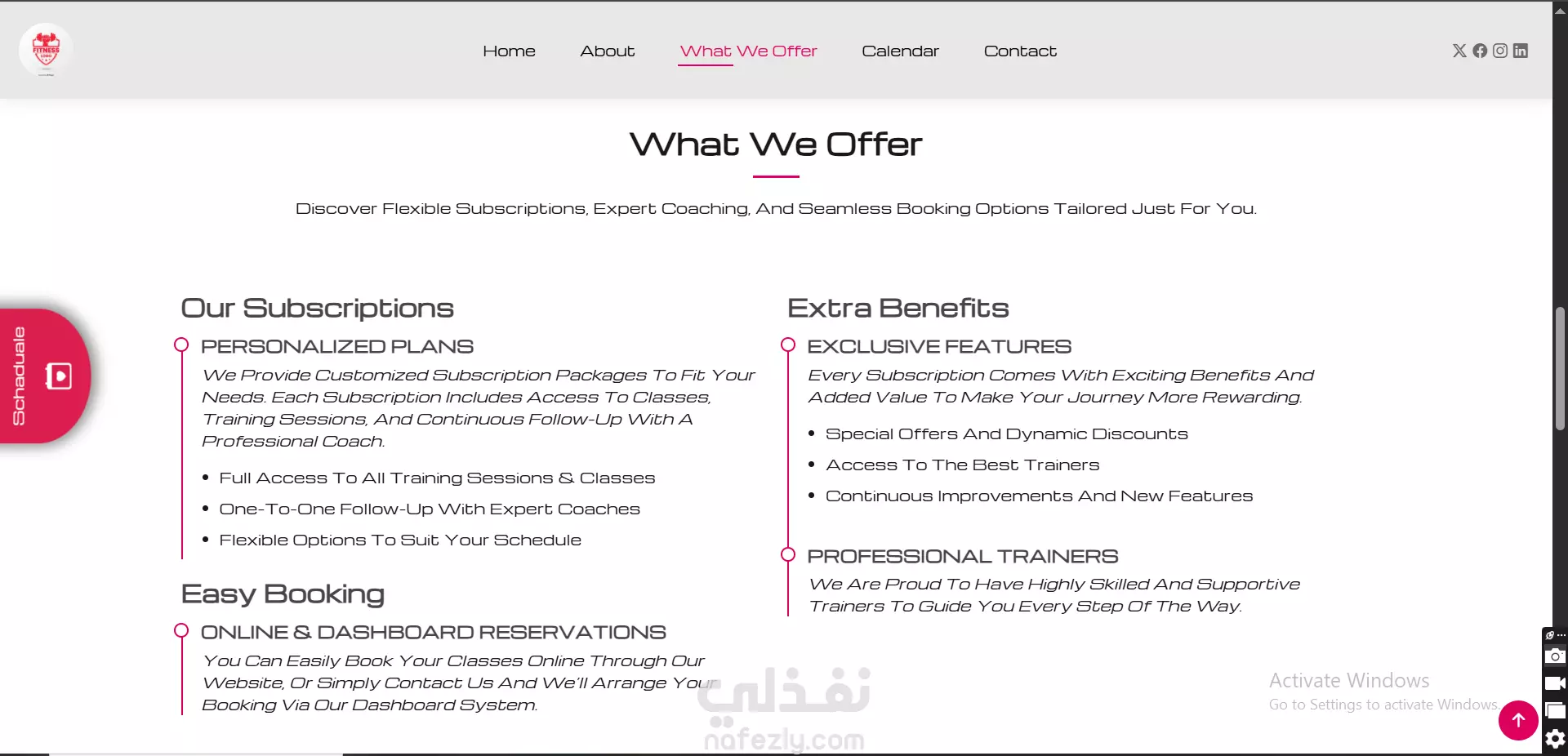 الموقع عبارة عن صفحة واحدة (Single Page Application) تم تصميمها لتكون واجهة تفاعلية تسهّل على الزوار التعرف على الصالة الرياضية، متابعة العروض، استعراض الجدول، وحجز الكلاسات مباشرة. ✨ المميزات الرئيسية: 🏠 الصفحة الرئيسية (Home) تصميم بسيط وجذاب يعرض لمحة عامة عن الصالة الرياضية. قسم "About Us" للتعريف بالصالة وخدماتها. قسم "What We Offer" يوضح الخدمات والباقات المتاحة. 🎉 العروض (Offers) يوجد أنيميشن (Animation) مميز يعرض آخر العروض المتاحة بشكل ديناميكي وجذاب. 📅 الكلاسات (Classes & Calendar) إمكانية استعراض جدول الكلاسات عبر تقويم (Calendar) تفاعلي. يمكن للزائر حجز كلاس مباشرة من خلال التقويم. إظهار تفاصيل الكلاسات (اليوم – الوقت – المدرب – الأماكن المتاحة). 📩 تواصل معنا (Contact Us) فورم (Form) بسيط يسمح للزوار بإرسال رسالة أو استفسار. الرسائل يتم استقبالها في النظام، مع إمكانية الرد عليها لاحقاً عبر البريد الإلكتروني. ⚙️ مميزات إضافية: واجهة مستخدم تفاعلية وسهلة باستخدام Animation وTransitions. تصميم متجاوب (Responsive Design) يعمل بكفاءة على جميع الأجهزة (موبايل – تابلت – كمبيوتر). تجربة سلسة ومترابطة مع نظام الإدارة (Dashboard) حيث يمكن ربط الحجوزات والرسائل مباشرة بالداشبورد. 🎯 الهدف من الموقع: أن يكون واجهة تعريفية وتسويقية للصالة الرياضية. توفير وسيلة سريعة وبسيطة للحجز والاستفسار. جذب العملاء الجدد من خلال عرض الخدمات والعروض بشكل واضح وجذاب.