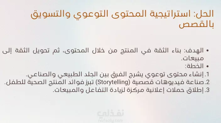 تطوير استراتيجية Storytelling لزيادة وعي العملاء بالجلد الطبيعي. كتابة سكريبتات قصيرة مؤثرة وربطها بحياة العملاء اليومية. تنفيذ فيديوهات تسويقية تهدف لبناء الثقة وتحفيز المبيعات.