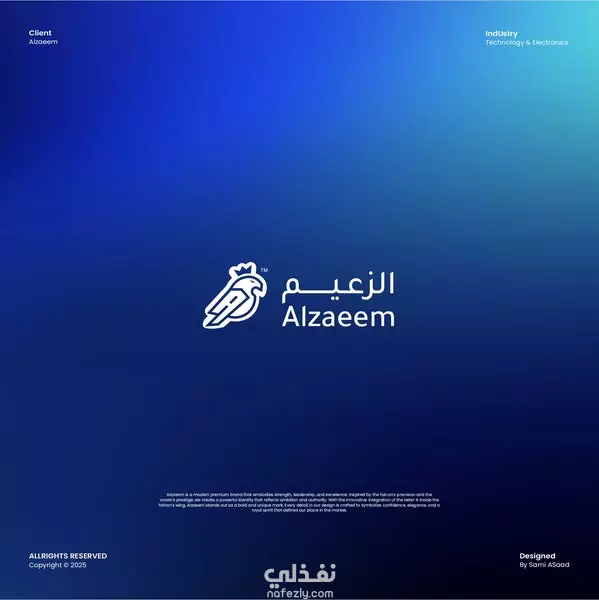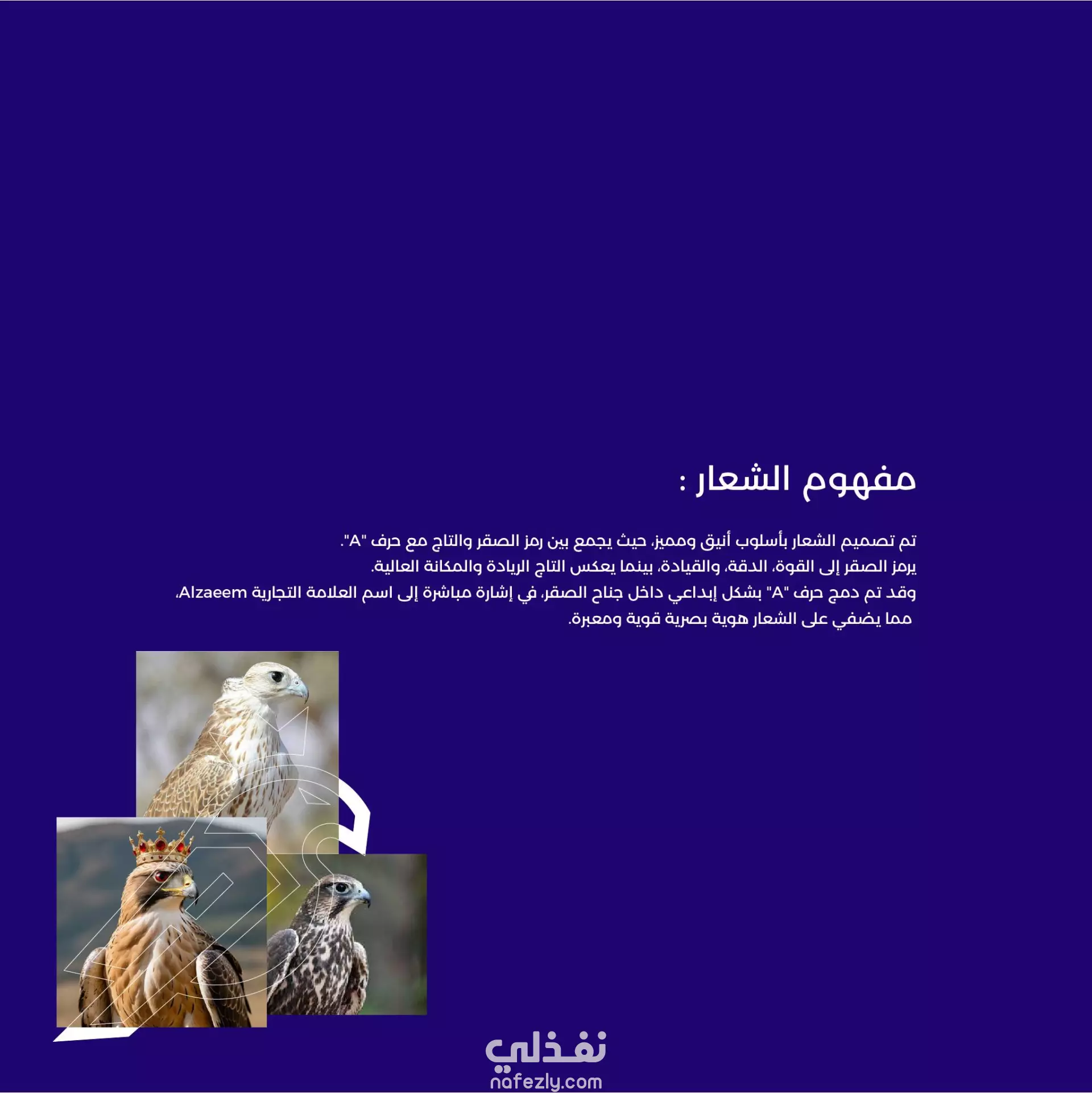 تم تصميم الشعار بأسلوب أنيق ومميز، حيث يجمع بين رمز الصقر والتاج مع حرف "A". يرمز الصقر إلى القوة، الدقة، والقيادة، بينما يعكس التاج الريادة والمكانة العالية. وقد تم دمج حرف "A" بشكل إبداعي داخل جناح الصقر، في إشارة مباشرة إلى اسم العلامة التجارية Alzaeem، مما يضفي على الشعار هوية بصرية قوية ومعبرة.