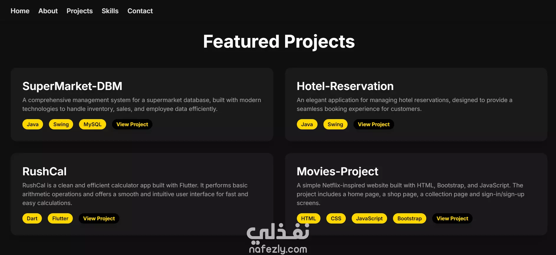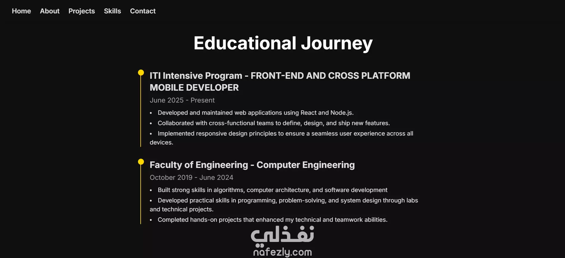 مشروعي عبارة عن موقع شخصي (Portfolio Website) يعرض سيرتي الذاتية، مهاراتي، وأعمالي السابقة بشكل احترافي ومنظم. الموقع تم بناؤه باستخدام HTML5، CSS3، JavaScript، وBootstrap مع تصميم متجاوب (Responsive) يعمل على جميع الأجهزة. يحتوي الموقع على: قسم تعريفي (Hero Section). معرض للمشاريع (Projects Showcase). قسم يعرض المهارات التقنية (Skills). نبذة عن رحلتي التعليمية والخبرات. نموذج للتواصل (Contact Form).