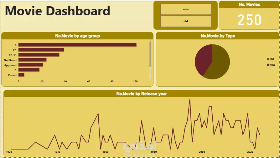داشبورد لتحليل اتجاهات الأفلام وتفضيلات الجمهور حلّلت 250 فيلمًا لاكتشاف الأنماط حسب التصنيف العمري، سنة الإصدار، ونوع الفيلم. نظّفت بيانات IMDb باستخدام Power Query، وفصلت مدة الفيلم لساعات ودقائق، وأعددت البيانات للتحليل. العرض شمل: مؤشر رئيسي (إجمالي الأفلام 250)، رسم عمودي (حسب التصنيف العمري)، رسم دائري (أفلام قديمة مقابل حديثة)، ورسم خطي (اتجاهات الإصدار عبر العقود). مناسب جدًا لمنصات البث أو مخططي المحتوى اللي عايزين يفهموا تفضيلات الجمهور.
