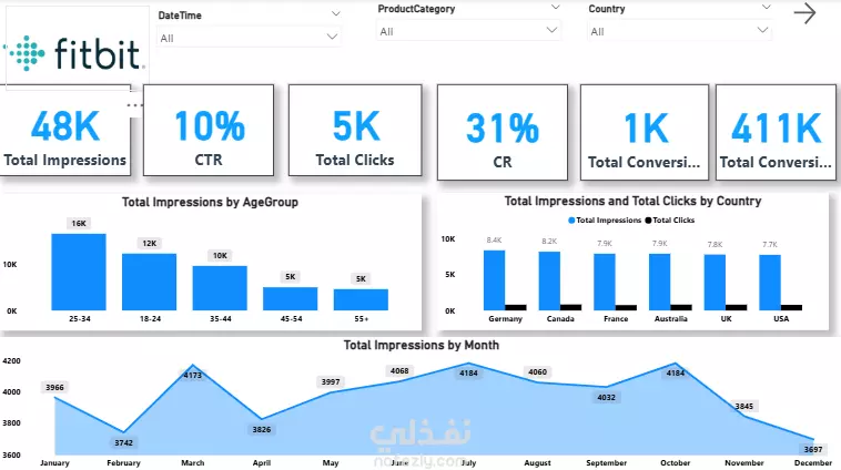 داشبورد أداء حملات التسويق (Fitbit) تتبع أداء حملات التسويق من حيث عدد الظهورات، النقرات، معدل التحويل (31%)، ومعدل النقر (CTR 10%) حسب الفئة العمرية والدولة. استخدمت Power Query لتنظيف البيانات الخام، ثم أنشأت مقاييس بسيطة باستخدام DAX لعرض المؤشرات الرئيسية. العرض شمل: مؤشرات رئيسية (إجمالي الظهورات: 48 ألف، النقرات: 5 آلاف) رسم عمودي (حسب الفئة العمرية) أعمدة مكدسة (أداء حسب الدولة) رسم خطي (الاتجاهات الشهرية) مثالي لفرق التسويق اللي عايزين يحسّنوا استهدافهم وميزانيتهم بناءً على البيانات.