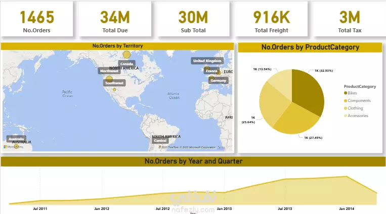 داشبورد تفاعلي لأداء المبيعات صممتُ هذا الداشبورد باستخدام Power BI لمساعدة الشركات على تتبع الإيرادات، عدد الطلبات، وأداء المبيعات حسب المنطقة. نظّفت البيانات الخام باستخدام Power Query، وبنيت نموذج بيانات على شكل "ستار سكيما" لضمان دقة التحليل. شملت المرئيات: إجمالي الطلبات (1,465)، الإيرادات ($34 مليون)، خريطة توزيع المبيعات حسب الإقليم، توزيع المنتجات (رسم دائري)، واتجاهات المبيعات الشهرية. مثالي لمديري المبيعات اللي عايزين يتخذوا قرارات سريعة بناءً على بيانات حقيقية وواضحة.