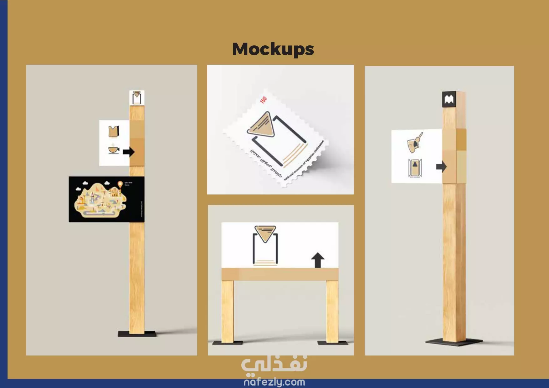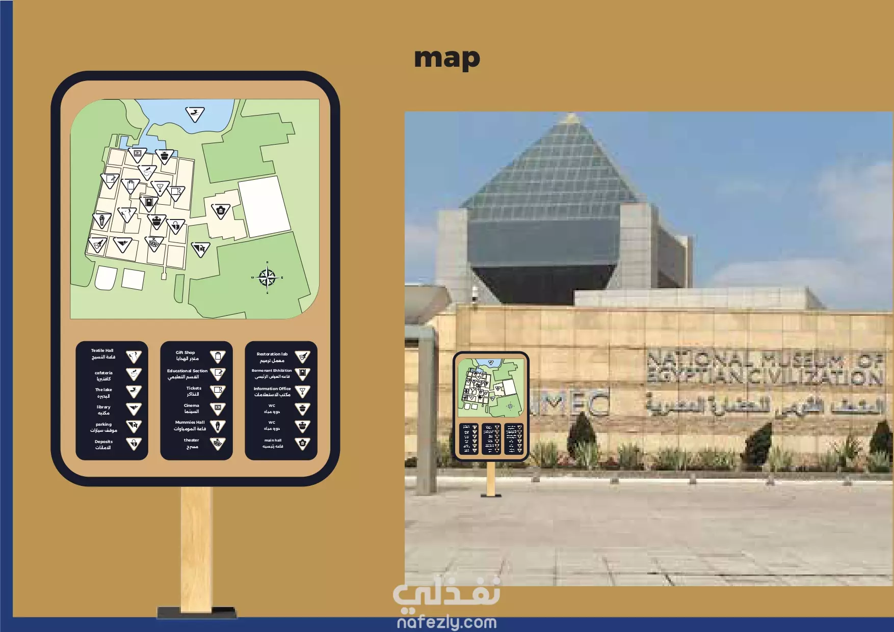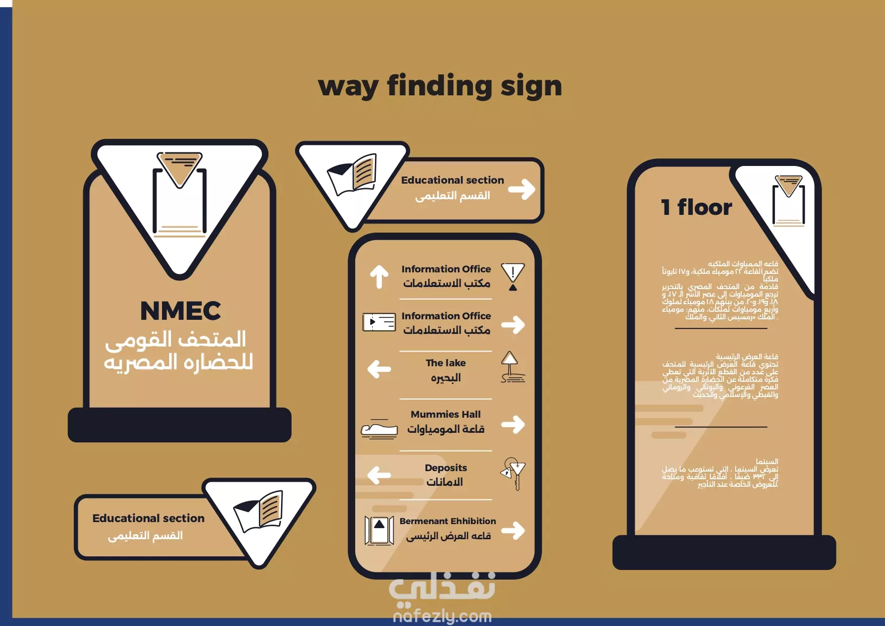 هذا المشروع عبارة عن عمل تجريبي/تصميم تدريبي (Concept Project) يهدف إلى تسهيل حركة الزوار داخل المتحف من خلال لافتات وإشارات بصرية واضحة تعكس هوية المكان وتتناسب مع طابعه الثقافي والحضاري. مميزات العمل: تقديم تجربة سلسة ومريحة للزوار عبر تسهيل التنقل والوصول إلى القاعات المختلفة. تعزيز هوية المتحف البصرية من خلال دمج عناصر التصميم مع الطابع التاريخي والثقافي. الاعتماد على تناسق الألوان والخطوط والرموز لخلق بيئة بصرية جذابة وفعّالة. رفع مستوى التواصل بين المتحف والزوار بطريقة مباشرة وبسيطة. طريقة التنفيذ: مرحلة البحث والتحليل: دراسة طبيعة المتحف، أقسامه، مسار الحركة الداخلية، واحتياجات الزوار. تصميم النظام البصري: وضع خطة شاملة للعلامات )اتجاهات، خرائط، لوحات تعريفية( بما يتناسب مع الهوية البصرية للمتحف. اختيار الألوان والخطوط والرموز: بما يعكس الطابع الحضاري ويضمن الوضوح وسهولة القراءة من مختلف المسافات. إعداد النماذج الأولية: تقديم Mockups أو نماذج تجريبية لمناقشتها مع الإدارة. للتنفيذ على ارض الواقع مرحلة التنفيذ والإنتاج: تجهيز وتصنيع اللافتات باستخدام خامات عالية الجودة تناسب البيئة الداخلية والخارجية. التركيب والتجربة: تثبيت النظام داخل المتحف واختباره مع مجموعة من الزوار للتأكد من فعاليته. التسليم النهائي: تسليم المشروع مكتملًا وفق أعلى المعايير التصميمية والفنية. تم تنفيذ التصميم كجزء من مشاريع شخصية توضيحية لعرض الأسلوب الإبداعي والقدرة على تحويل الأفكار إلى حلول بصرية عملية. هذا المشروع ليس عملاً فعليًا منفذًا للمتحف، وإنما مشروع تدريبي لعرض المهارات.مشروع تصميم وتنفيذ نظم التوجيه والإرشاد)Wayfinding System(للمتحف القومي للحضارة.