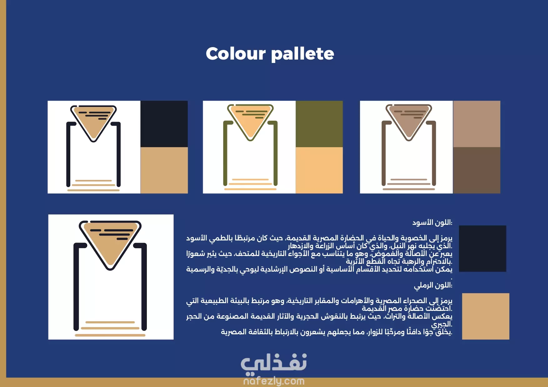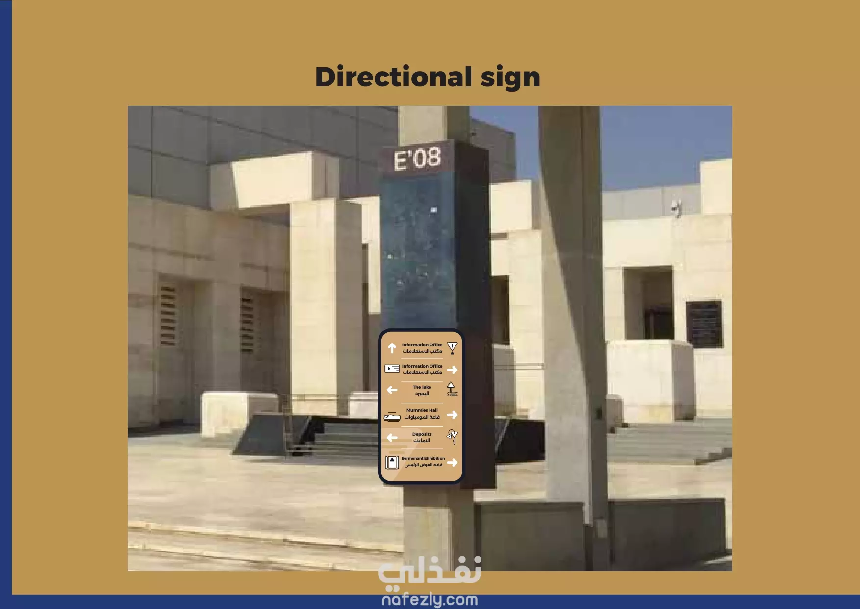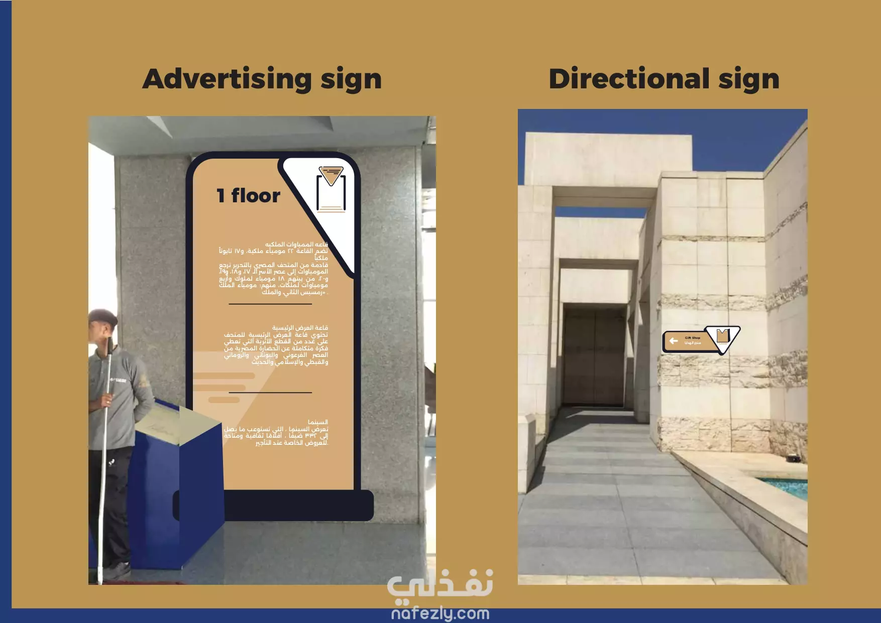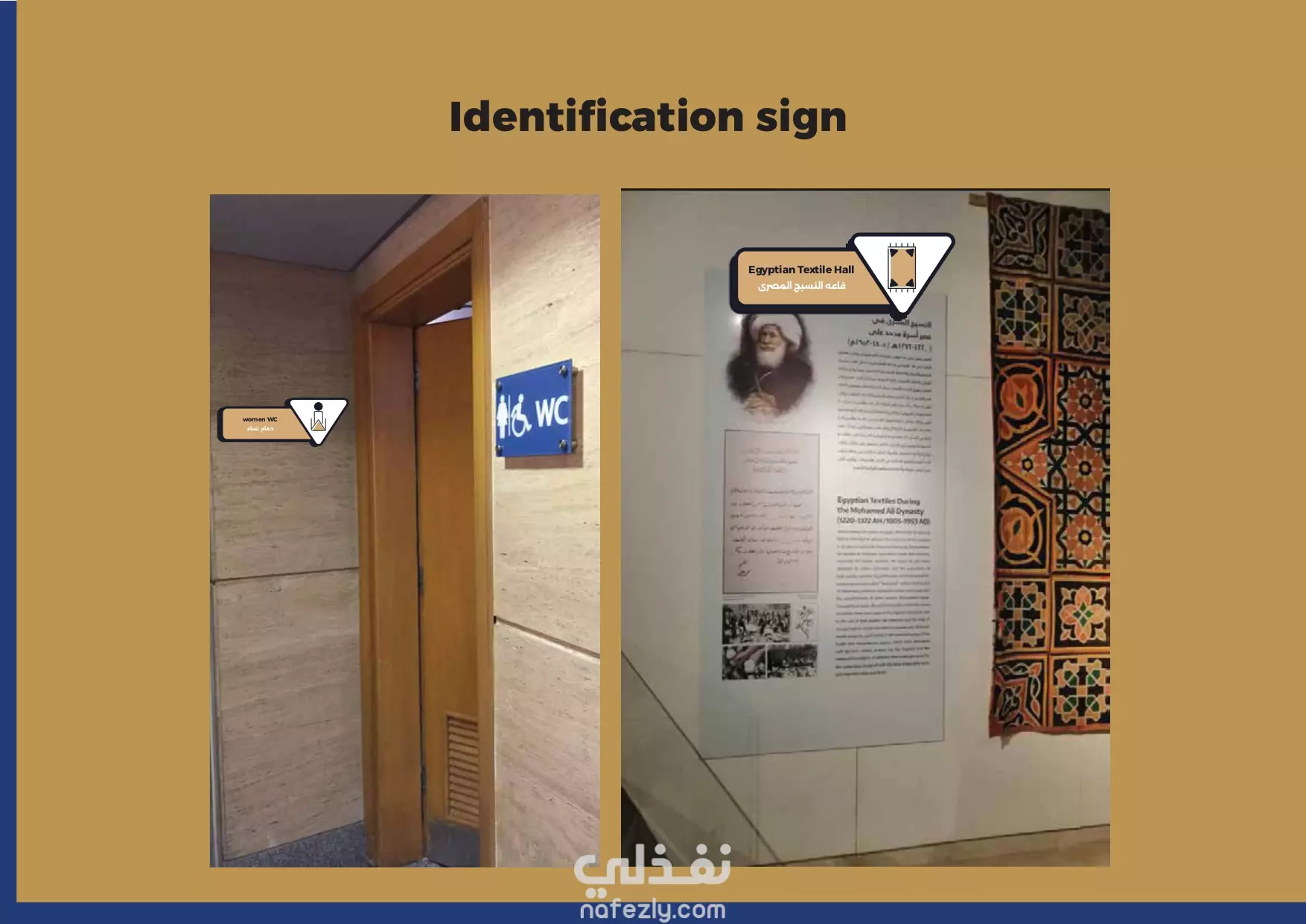 هذا المشروع عبارة عن عمل تجريبي/تصميم تدريبي (Concept Project) يهدف إلى تسهيل حركة الزوار داخل المتحف من خلال لافتات وإشارات بصرية واضحة تعكس هوية المكان وتتناسب مع طابعه الثقافي والحضاري. مميزات العمل: تقديم تجربة سلسة ومريحة للزوار عبر تسهيل التنقل والوصول إلى القاعات المختلفة. تعزيز هوية المتحف البصرية من خلال دمج عناصر التصميم مع الطابع التاريخي والثقافي. الاعتماد على تناسق الألوان والخطوط والرموز لخلق بيئة بصرية جذابة وفعّالة. رفع مستوى التواصل بين المتحف والزوار بطريقة مباشرة وبسيطة. طريقة التنفيذ: مرحلة البحث والتحليل: دراسة طبيعة المتحف، أقسامه، مسار الحركة الداخلية، واحتياجات الزوار. تصميم النظام البصري: وضع خطة شاملة للعلامات )اتجاهات، خرائط، لوحات تعريفية( بما يتناسب مع الهوية البصرية للمتحف. اختيار الألوان والخطوط والرموز: بما يعكس الطابع الحضاري ويضمن الوضوح وسهولة القراءة من مختلف المسافات. إعداد النماذج الأولية: تقديم Mockups أو نماذج تجريبية لمناقشتها مع الإدارة. للتنفيذ على ارض الواقع مرحلة التنفيذ والإنتاج: تجهيز وتصنيع اللافتات باستخدام خامات عالية الجودة تناسب البيئة الداخلية والخارجية. التركيب والتجربة: تثبيت النظام داخل المتحف واختباره مع مجموعة من الزوار للتأكد من فعاليته. التسليم النهائي: تسليم المشروع مكتملًا وفق أعلى المعايير التصميمية والفنية. تم تنفيذ التصميم كجزء من مشاريع شخصية توضيحية لعرض الأسلوب الإبداعي والقدرة على تحويل الأفكار إلى حلول بصرية عملية. هذا المشروع ليس عملاً فعليًا منفذًا للمتحف، وإنما مشروع تدريبي لعرض المهارات.مشروع تصميم وتنفيذ نظم التوجيه والإرشاد)Wayfinding System(للمتحف القومي للحضارة.
