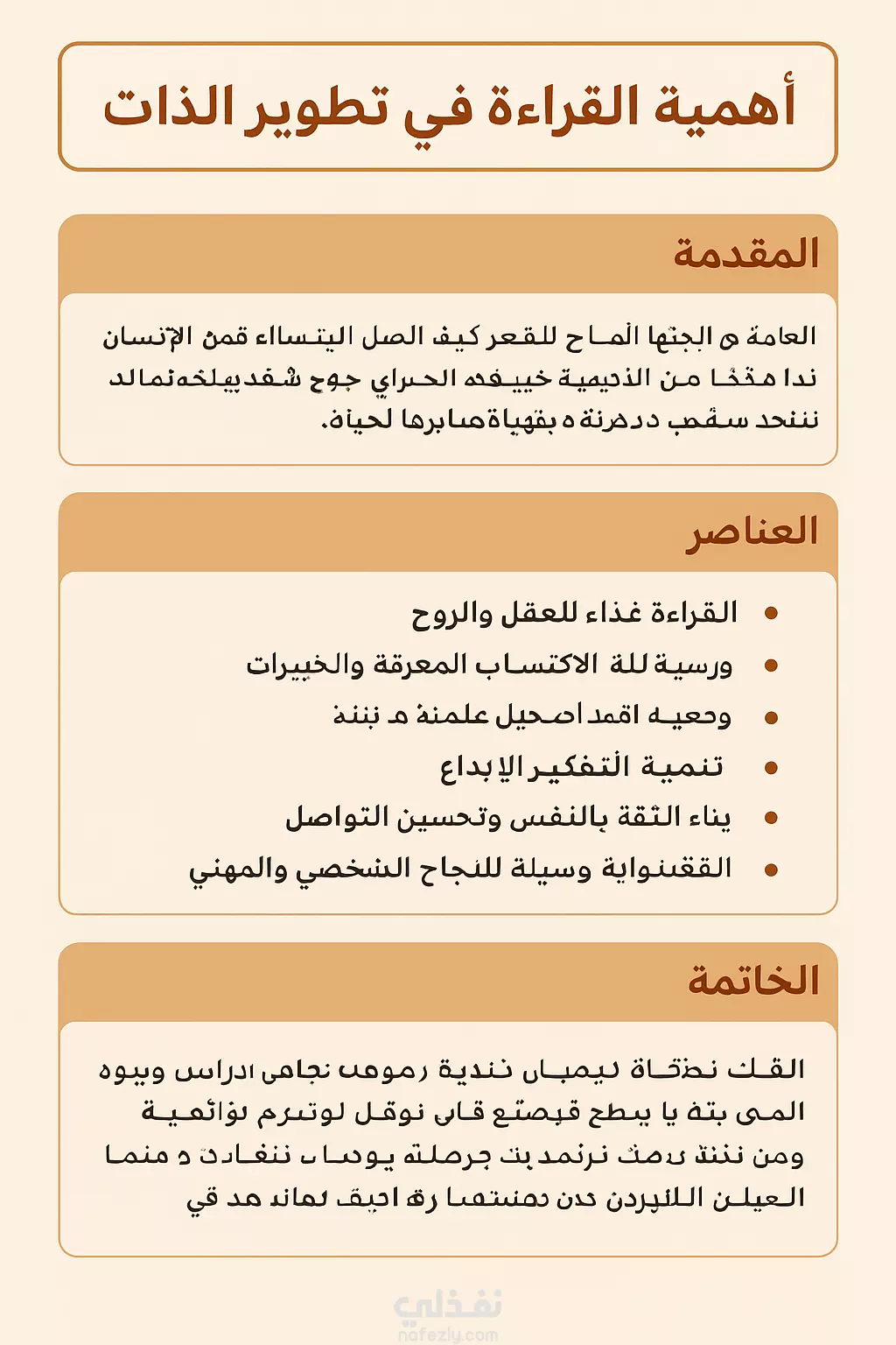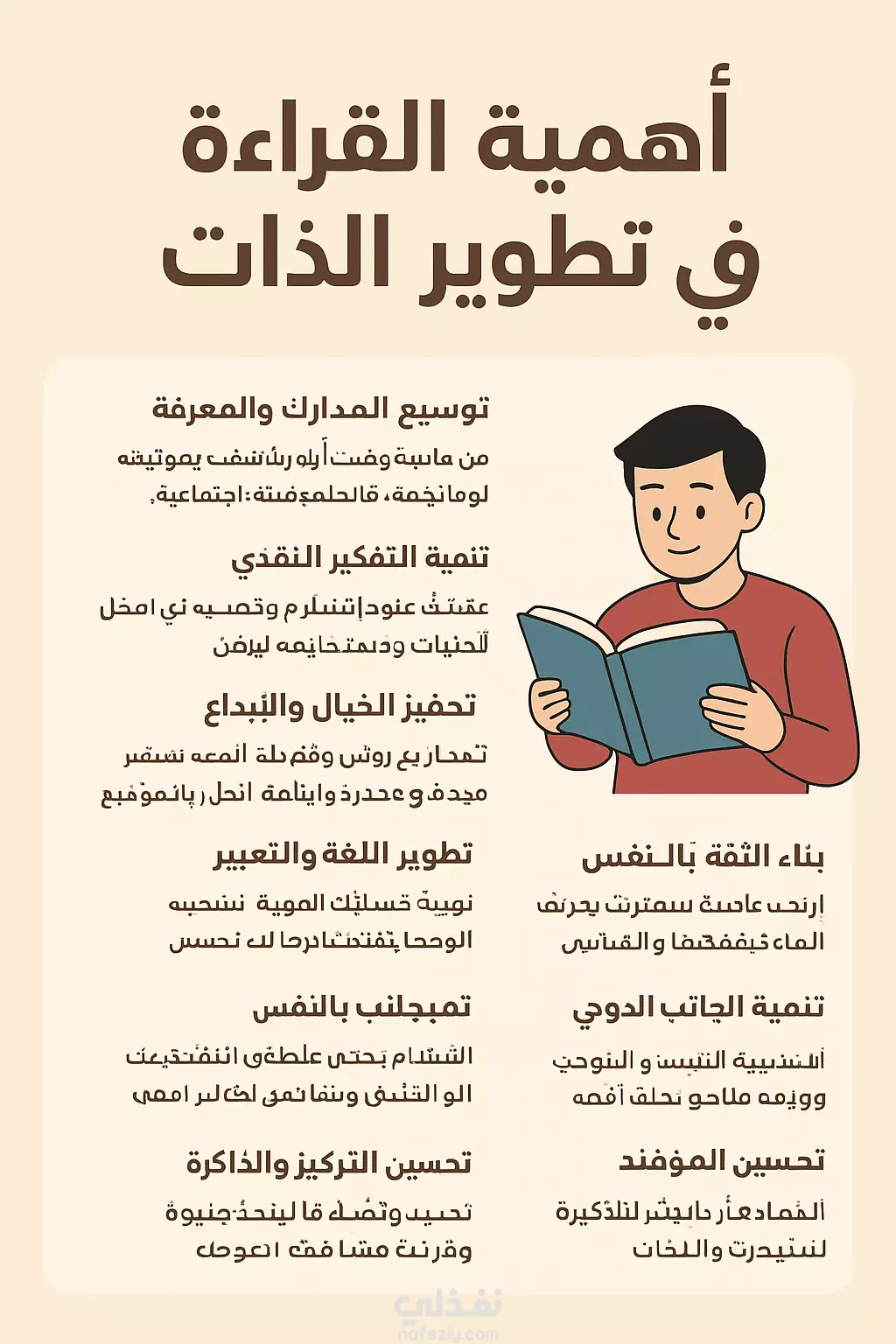 في النهاية، نستطيع أن نقول إن القراءة ليست مجرد هواية مسلية، بل هي سلاح قوي يبني العقول، ويصنع الأمم، ويُحقق للإنسان تطويرًا دائمًا لذاته. ومن يداوم على القراءة يجد نفسه في رحلة لا تنتهي من النمو الفكري والروحي، لذلك يجب أن نجعل القراءة عادة يومية، لأنها الطريق الأكيد لبناء مستقبل أفضل لنا ولمجتمعاتنا.