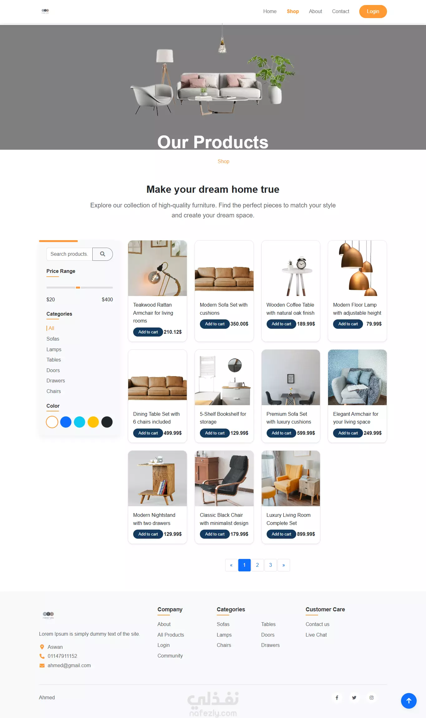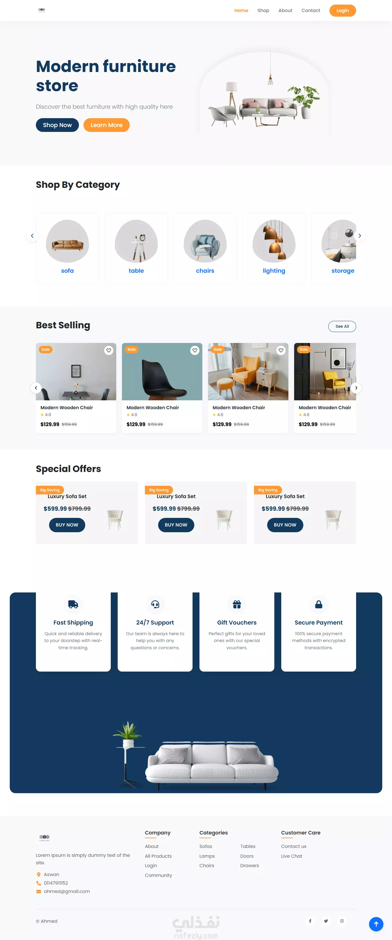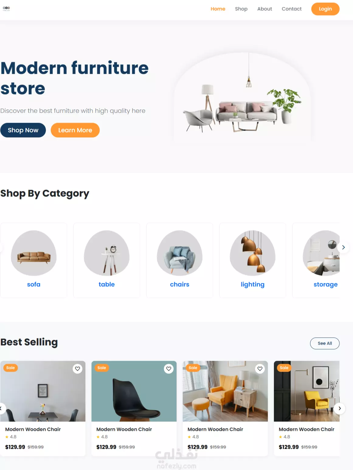 الموقع هو متجر إلكتروني بسيط لبيع أثاث المنزل مكوّن من 4 صفحات رئيسية: صفحة تسجيل الدخول (Login): عشان العميل يقدر يدخل بحسابه أو يعمل حساب جديد. الصفحة الرئيسية (Home Page): واجهة جذابة فيها بانر + صور منتجات مميزة + روابط للتنقل بين الصفحات. صفحة من نحن (About Us): تعريف عن المتجر، رسالته، ورؤيته في بيع الأثاث. صفحة المتجر (Shop): تحتوي على المنتجات (صور – أسماء – أسعار – زر إضافة للعربة).
