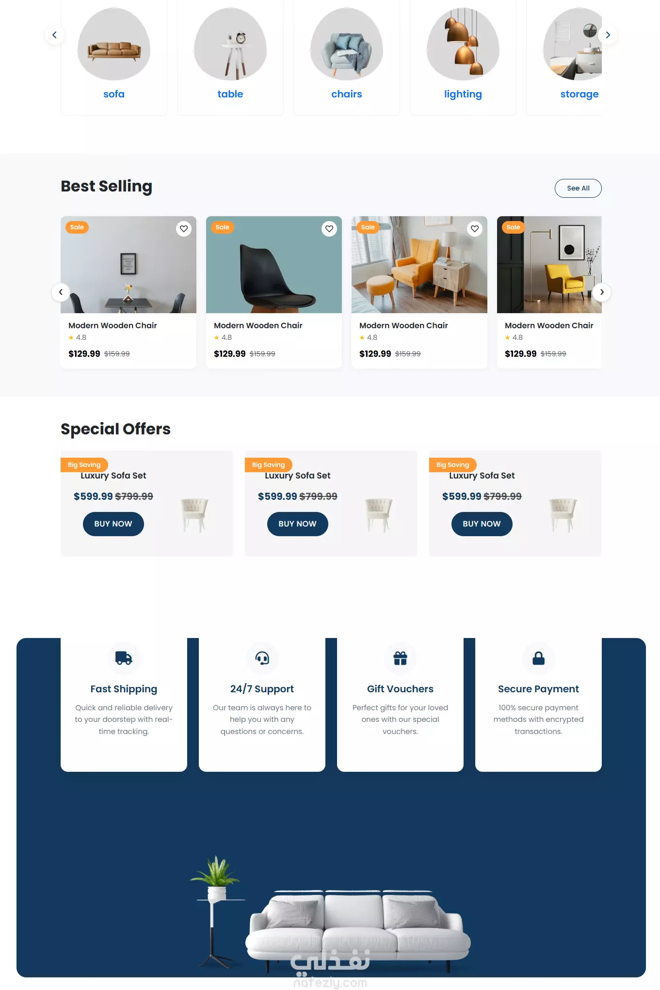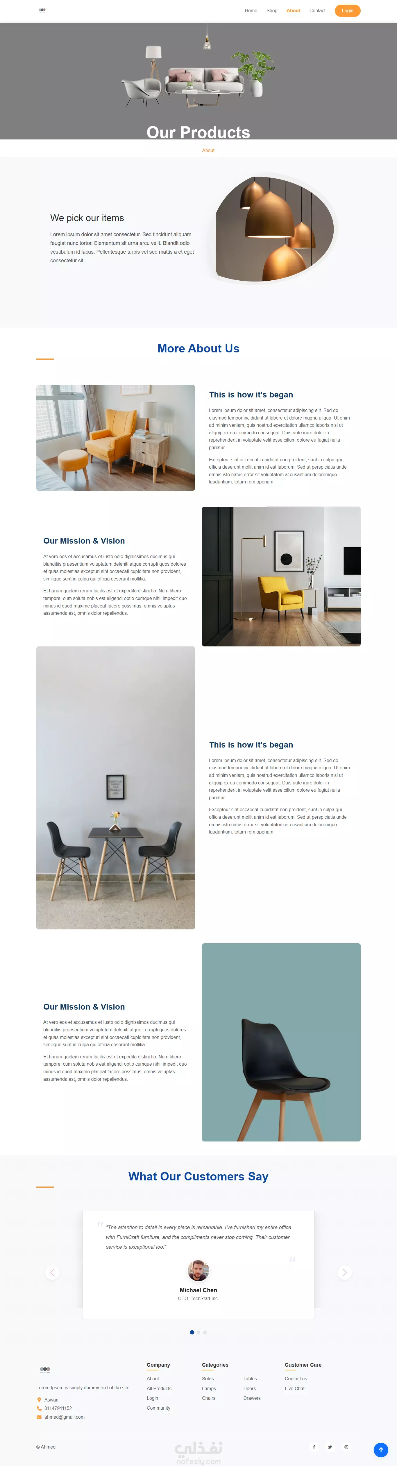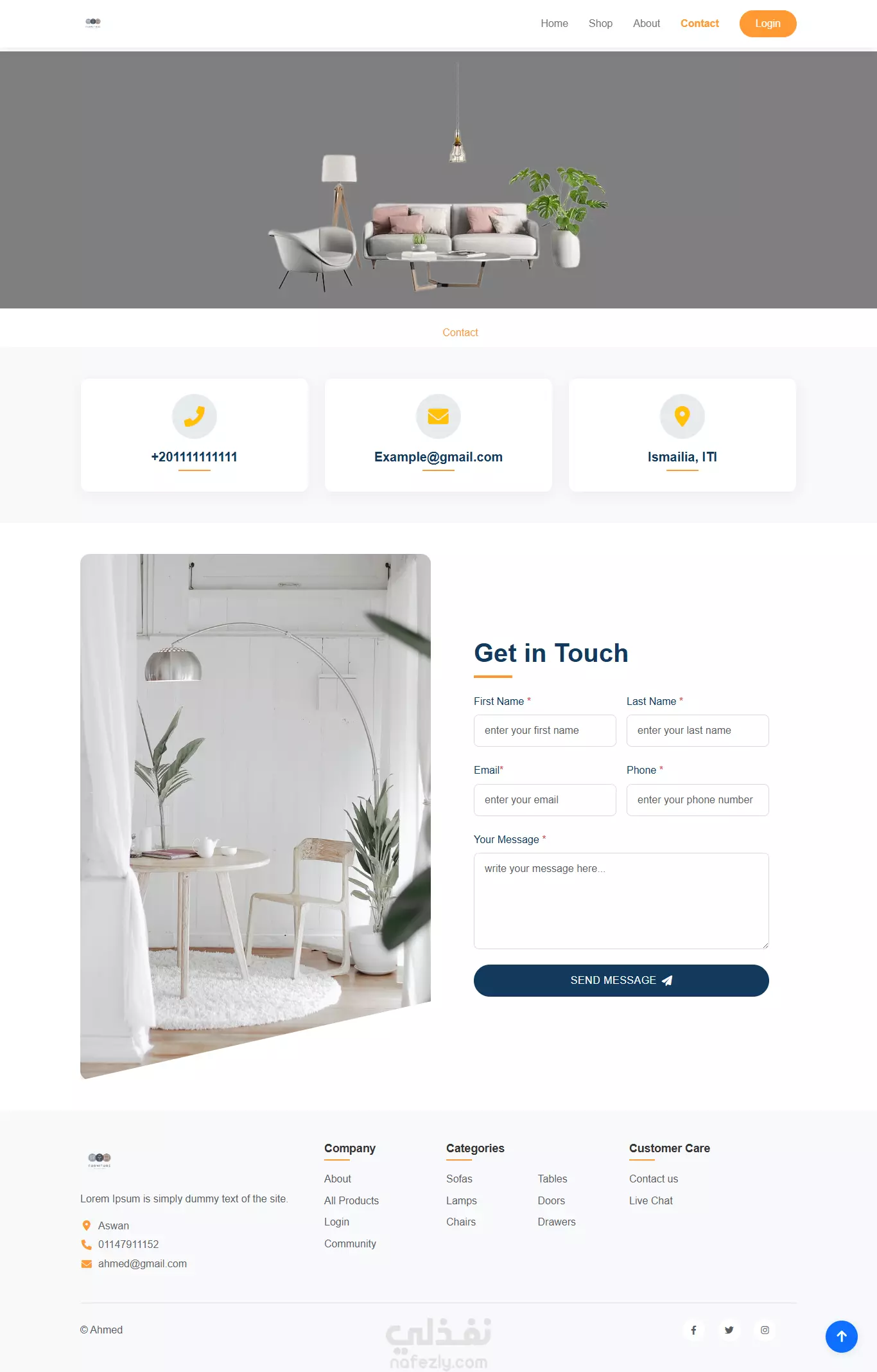الموقع هو متجر إلكتروني بسيط لبيع أثاث المنزل مكوّن من 4 صفحات رئيسية: صفحة تسجيل الدخول (Login): عشان العميل يقدر يدخل بحسابه أو يعمل حساب جديد. الصفحة الرئيسية (Home Page): واجهة جذابة فيها بانر + صور منتجات مميزة + روابط للتنقل بين الصفحات. صفحة من نحن (About Us): تعريف عن المتجر، رسالته، ورؤيته في بيع الأثاث. صفحة المتجر (Shop): تحتوي على المنتجات (صور – أسماء – أسعار – زر إضافة للعربة).