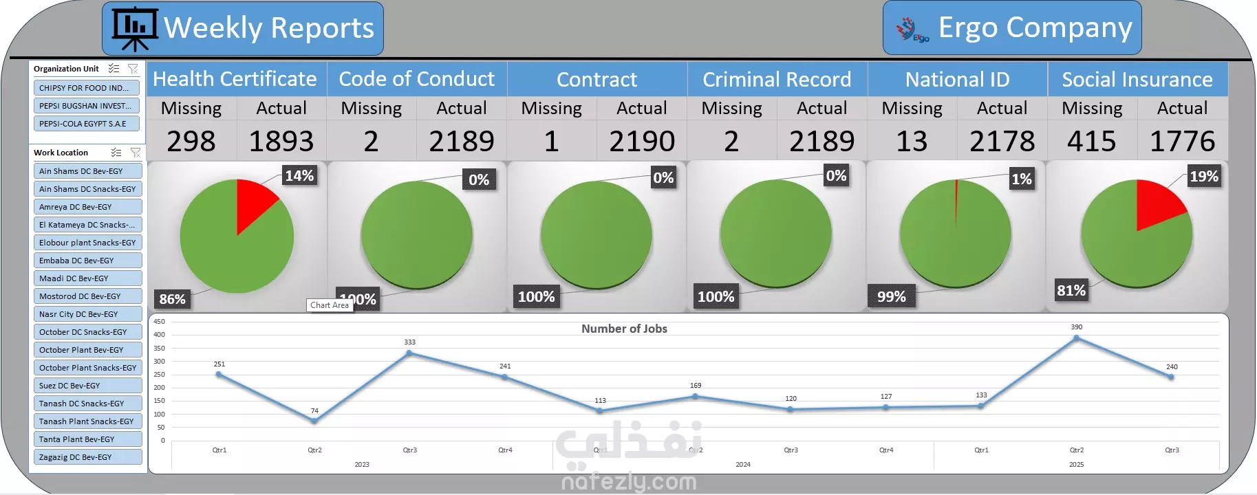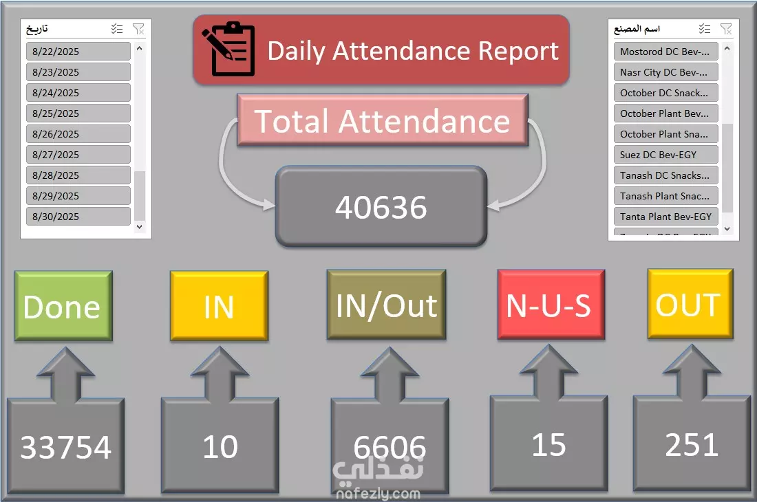 قمت بتصميم وتنفيذ لوحات تقارير تفاعلية احترافية على برنامج Excel تهدف إلى متابعة الأداء وتحليل البيانات بشكل مبسط ومرئي. - لوحة التقارير الأسبوعية (Weekly Reports): تتبع مؤشرات الامتثال الخاصة بالموظفين (شهادات صحية، عقود، السجلات الجنائية، بطاقات الهوية، والتأمينات الاجتماعية). إظهار البيانات المفقودة مقابل البيانات المكتملة بشكل مرئي باستخدام مخططات دائرية ونسب مئوية لسهولة الفهم. عرض اتجاهات التوظيف وعدد الوظائف عبر الفترات الزمنية من خلال مخططات خطية. إمكانية تصفية البيانات حسب الوحدة التنظيمية أو موقع العمل باستخدام قوائم ديناميكية. - لوحة الحضور اليومي (Daily Attendance Report): عرض إجمالي عدد الحضور بشكل مباشر وتفصيلي. تقسيم الحضور إلى فئات (Done، IN، IN/OUT، N-U-S، OUT) بشكل مرئي عبر مؤشرات وألوان مختلفة. إمكانية تحليل الحضور حسب التاريخ أو اسم المصنع باستخدام شرائح (Slicers) للتنقل بسهولة بين البيانات. تقديم مؤشرات سريعة تساعد الإدارة على معرفة حالة الحضور والانضباط اليومي. - القيمة المضافة: تحويل البيانات الخام المعقدة إلى لوحات مرئية سهلة القراءة. مساعدة الإدارة على متابعة الأداء والتقارير بسرعة دون الحاجة لتحليل يدوي. تعزيز اتخاذ القرار المبني على البيانات (Data-Driven Decisions). تصميم احترافي يوازن بين الدقة وسهولة الاستخدام.
