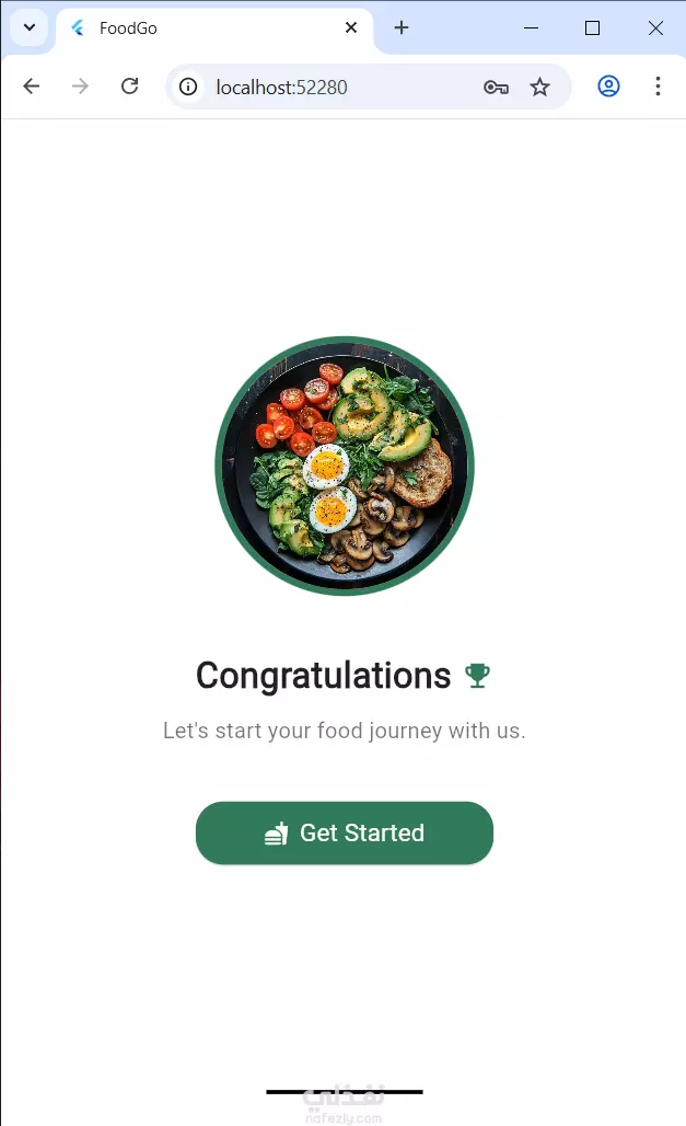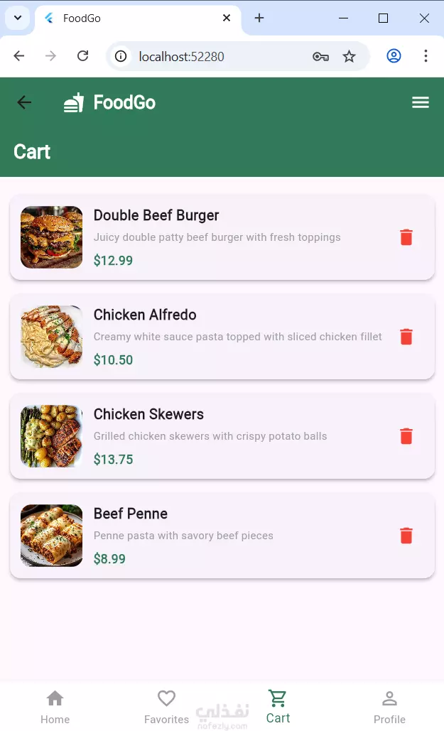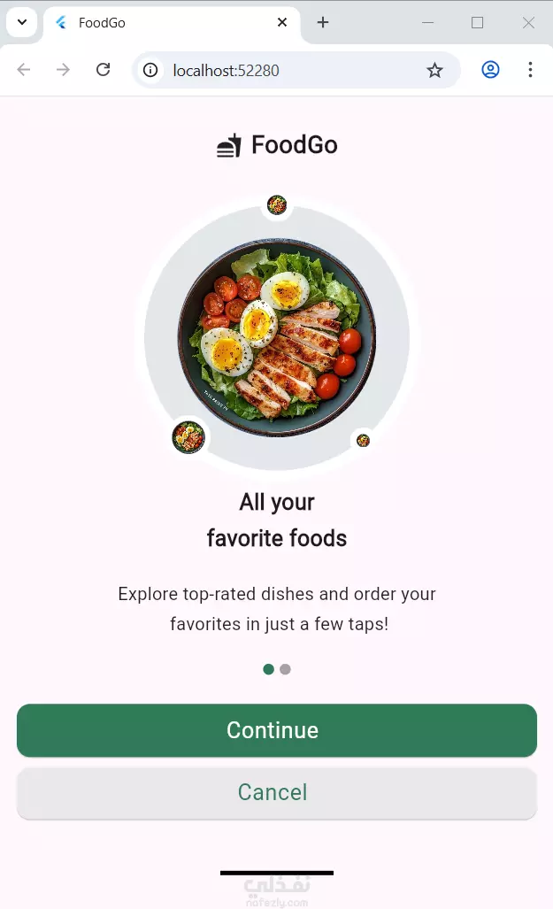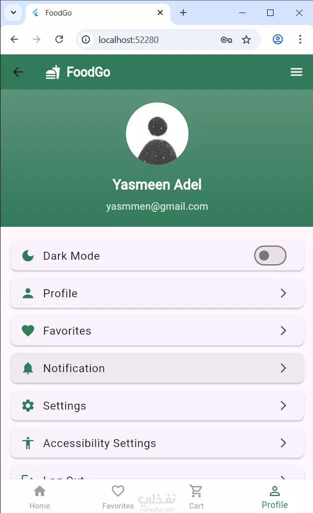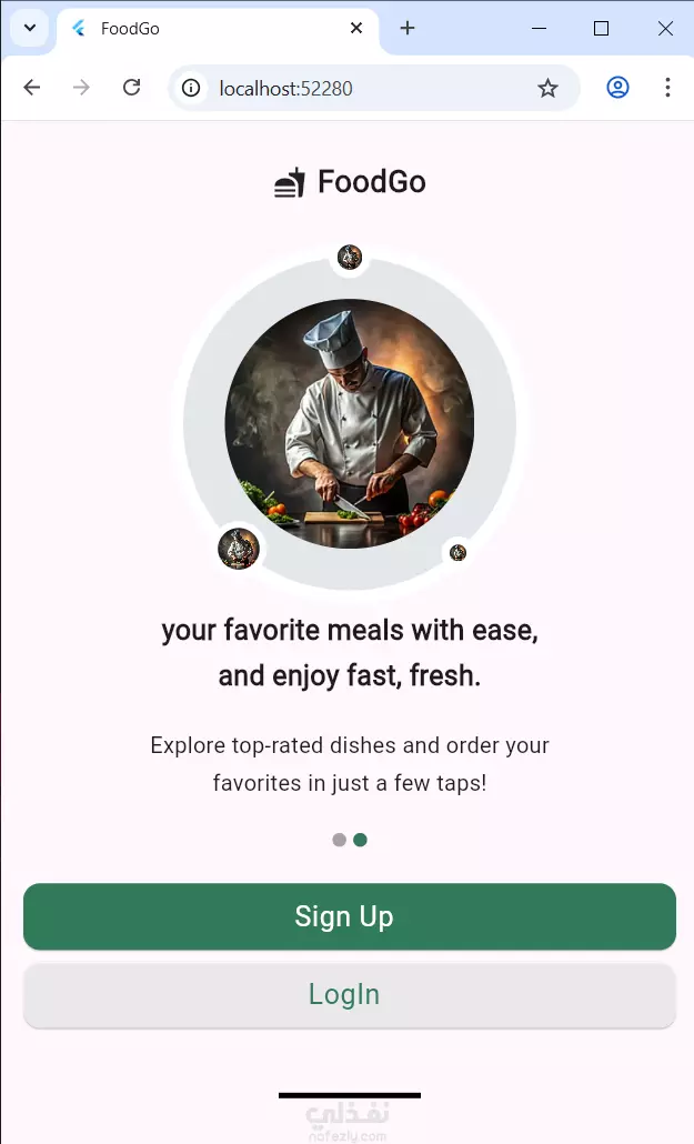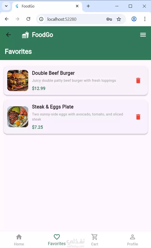 يوفر تسجيل دخول/حساب جديد، مع دعم تغيير الثيم (فاتح/غامق). يعرض قوائم أطعمة منظمة، مع إمكانية إضافة العناصر إلى المفضلة أو عربة التسوق. يركز على تجربة مستخدم بسيطة وواجهة جذابة.