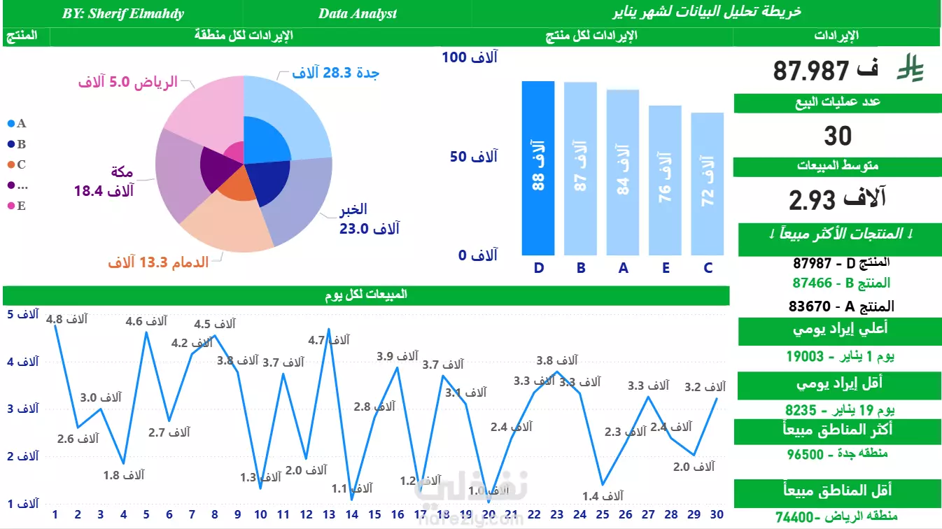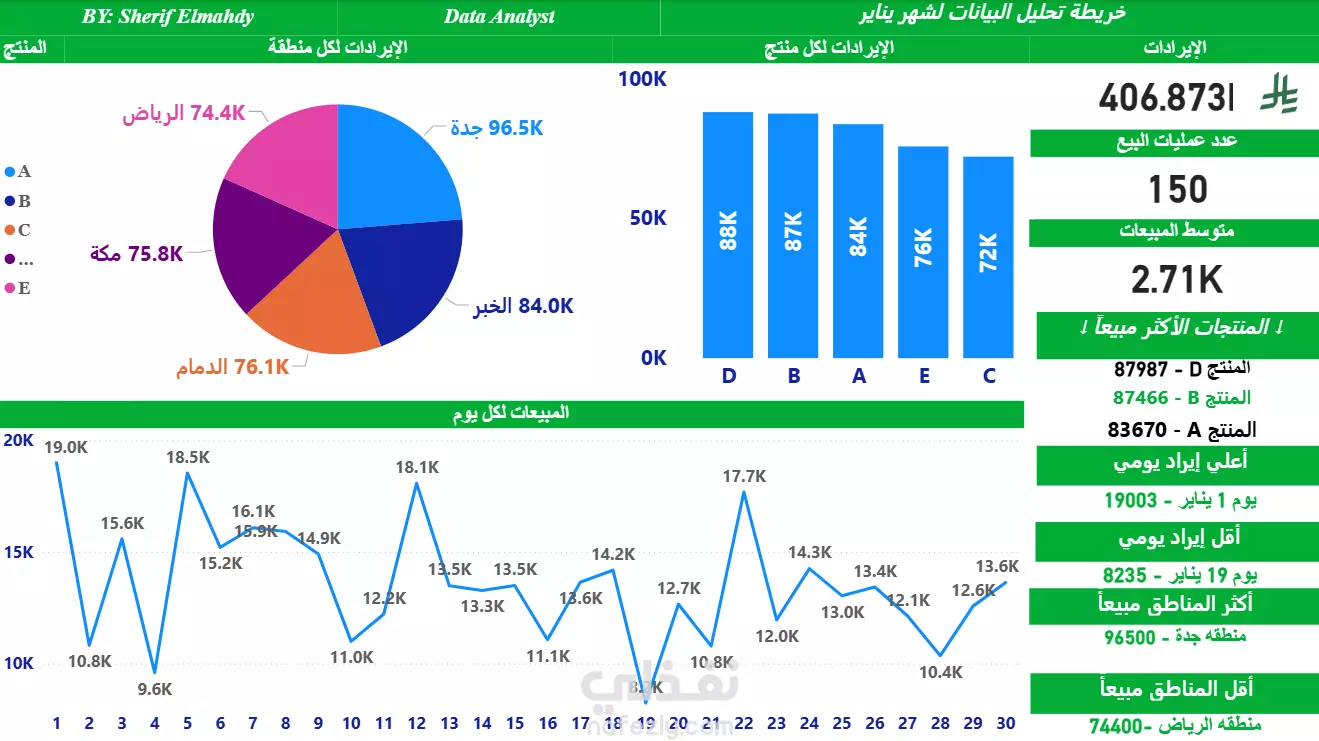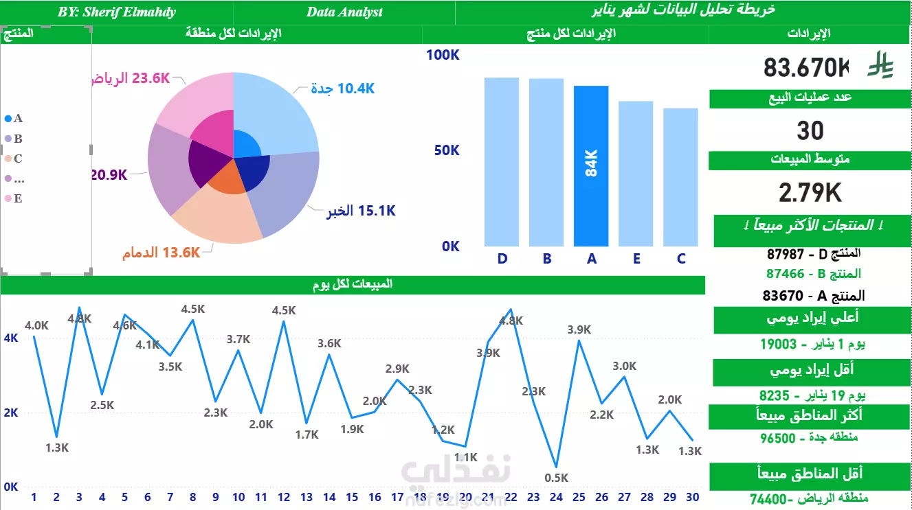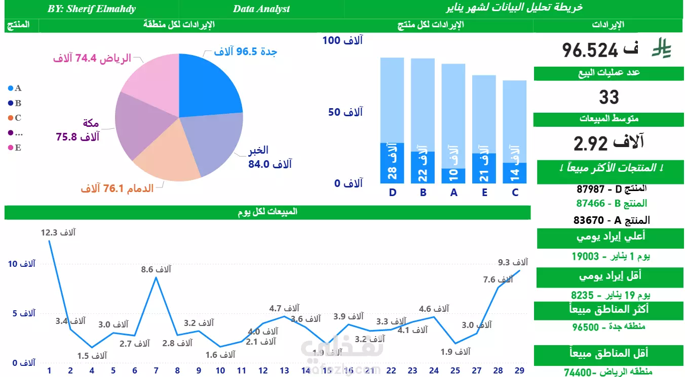 داشبورد مصمم لتقديم رؤية شاملة عن المبيعات والإيرادات عبر المنتجات والمناطق والفترات الزمنية. يحتوي على: •Top 3 Products الأكثر مبيعًا مع مقارنة واضحة. •اتجاه المبيعات اليومي يوضح فترات الذروة والانخفاض. •توزيع الإيرادات حسب المناطق (مثل جدة والرياض) لإبراز الأسواق الأقوى والأضعف. •مؤشرات رئيسية (KPIs) لقياس الأداء بسرعة. الداشبورد يتميز بالوضوح البصري وسهولة الاستخدام، مما يساعد على تحويل البيانات إلى قرارات عملية بشكل أسرع