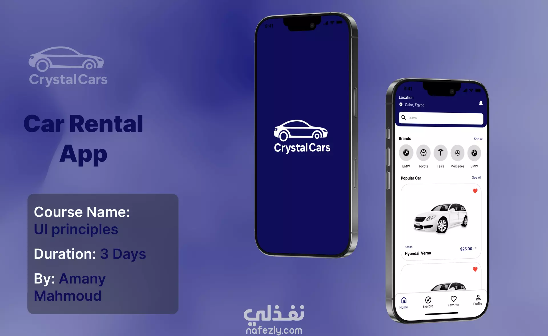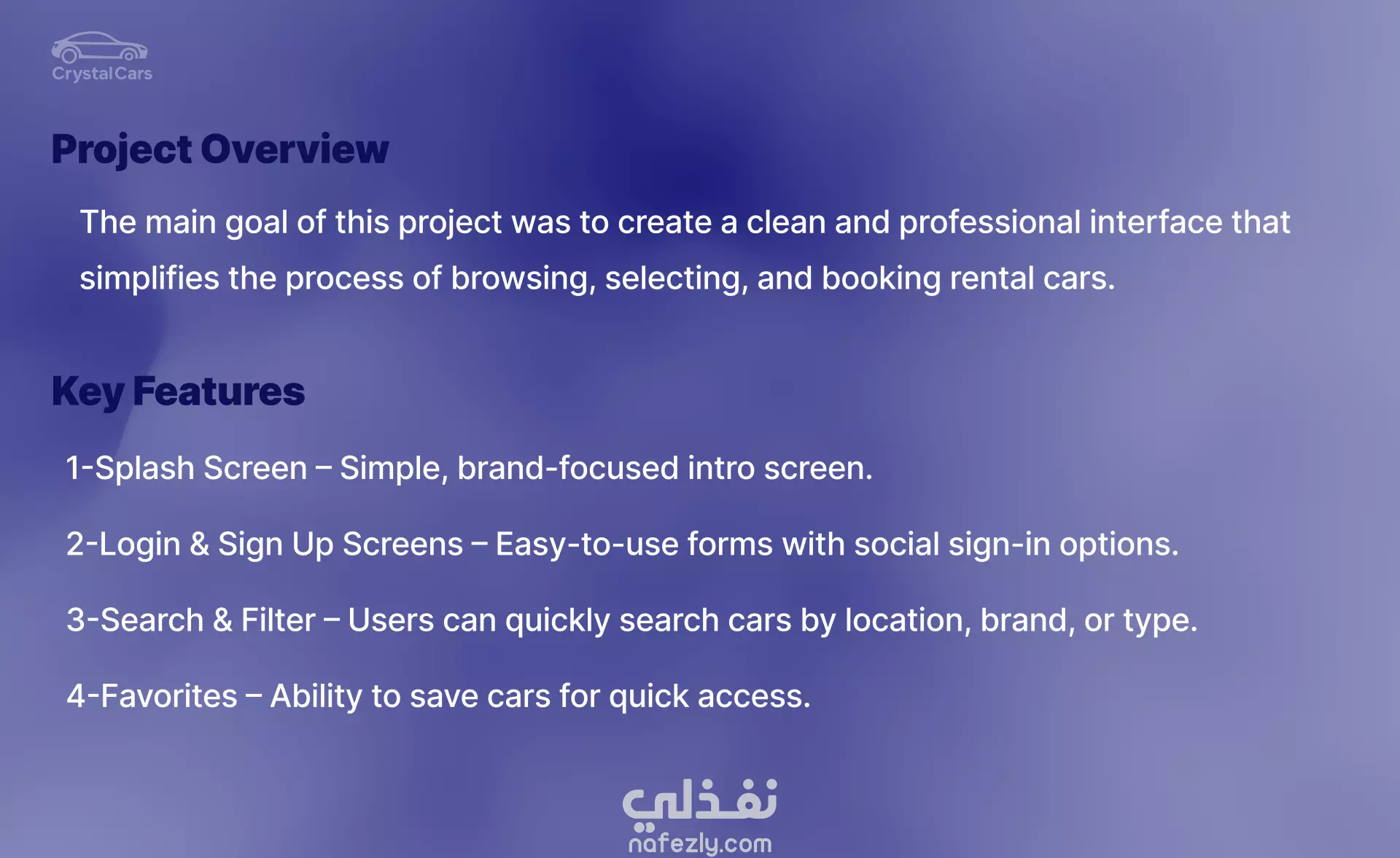 مشروع تصميم واجهات تطبيق لتأجير السيارات (Car Rental App – CrystalCars) يهدف إلى توفير تجربة استخدام سلسة ومريحة للعملاء الراغبين في استئجار السيارات بسهولة وسرعة.