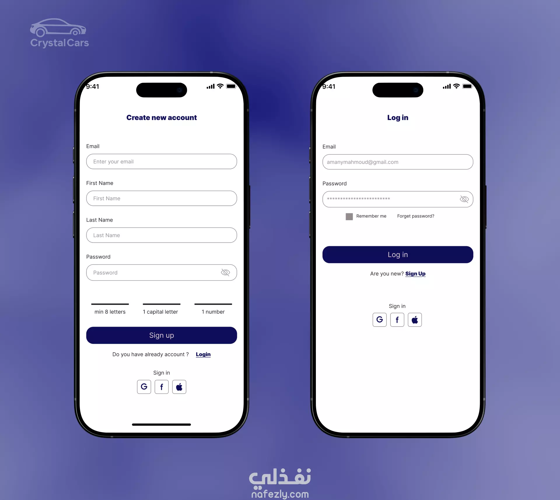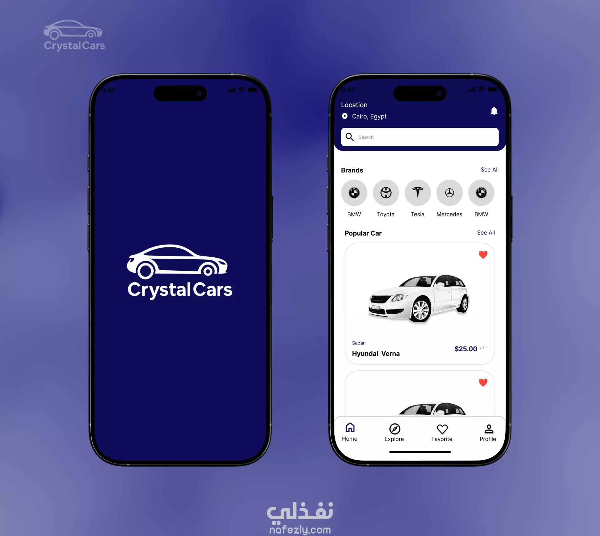 -واجهات تطبيق كاملة (Login, Signup, Home, Car Listing, Favorites).