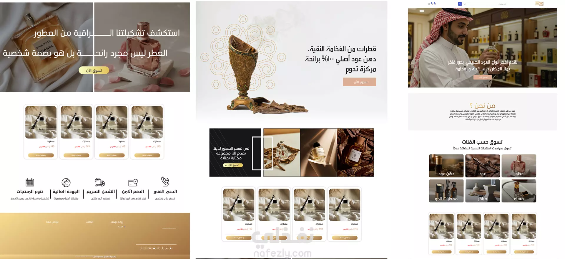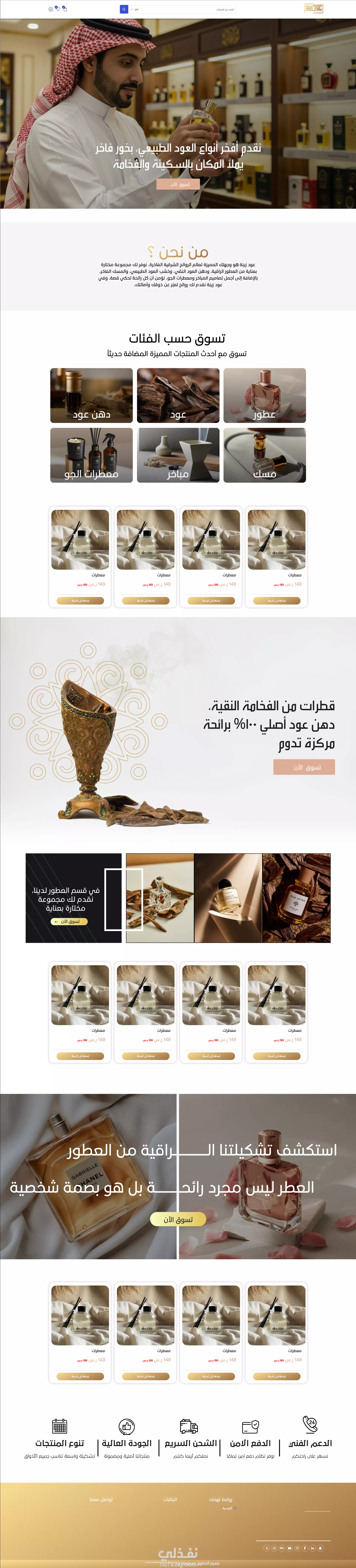 هذا نموذج عمل لتصميم متجر إلكتروني متخصص في بيع العطور الشرقية ودهن العود. التصميم يركز على إبراز الفخامة والهوية العربية من خلال الصور والجمل التسويقية، مع تقسيم المنتجات بشكل واضح وسهل الاستخدام. أضفنا أقسام للتعريف بالعلامة التجارية، تصنيفات المنتجات، المنتجات المميزة بالأسعار، بالإضافة إلى بانرات دعائية تزيد من جاذبية العرض. التصميم يجمع بين الأناقة البصرية + تجربة تسوق سهلة + إبراز هوية العلامة، ليقدم للعميل واجهة إلكترونية تعكس قيمة منتجاته وتزيد من مبيعاته