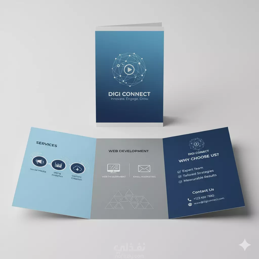 صممت بروشور (Brochure) لشركة تسويق رقمي بأسلوب عصري يعتمد على الأيقونات والألوان الزرقاء والرمادية لإبراز الجانب الاحترافي للشركة.
