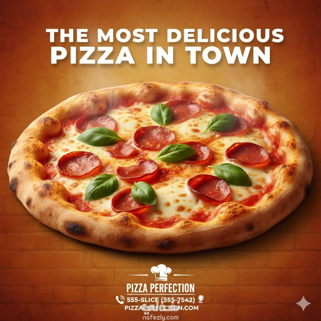 كما أنجزت فلاير (Flyer) لمطعم بيتزا بخلفية دافئة وصورة بيتزا شهية مع عنوان جذاب، بهدف جذب العملاء وزيادة المبيعات.