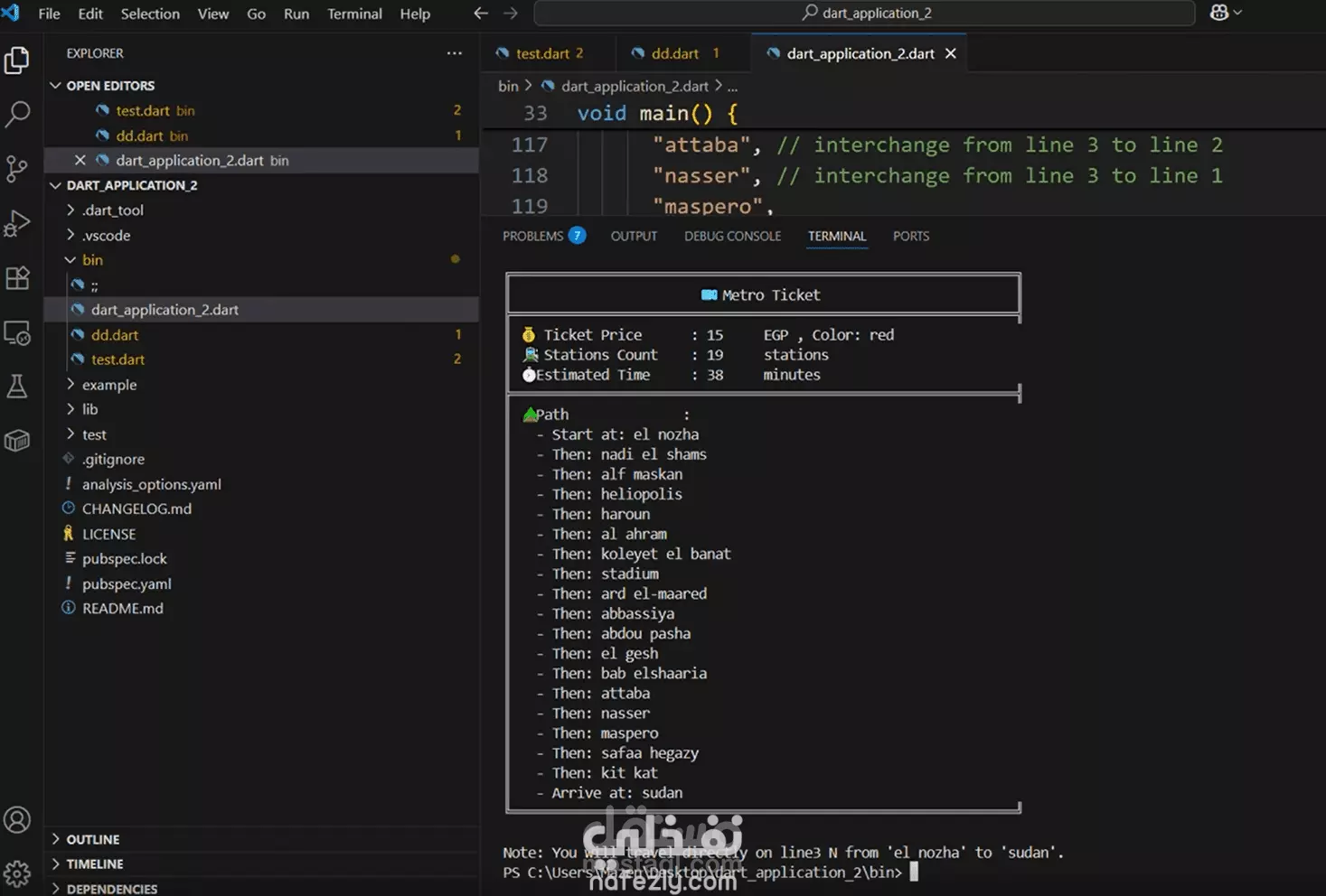قدرت باستخدام دارت اني اعمل ابليكيشن مترو بتقدر من خلالة تكتب المحطة اللي هتركب منها والمحطه اللي هتنزل فيها و تعرف : عدد المحطات , سعر التذكرة ولونها , الوقت المتوقع للوصول , طريقك والمحطات اللي هتعدي عليها